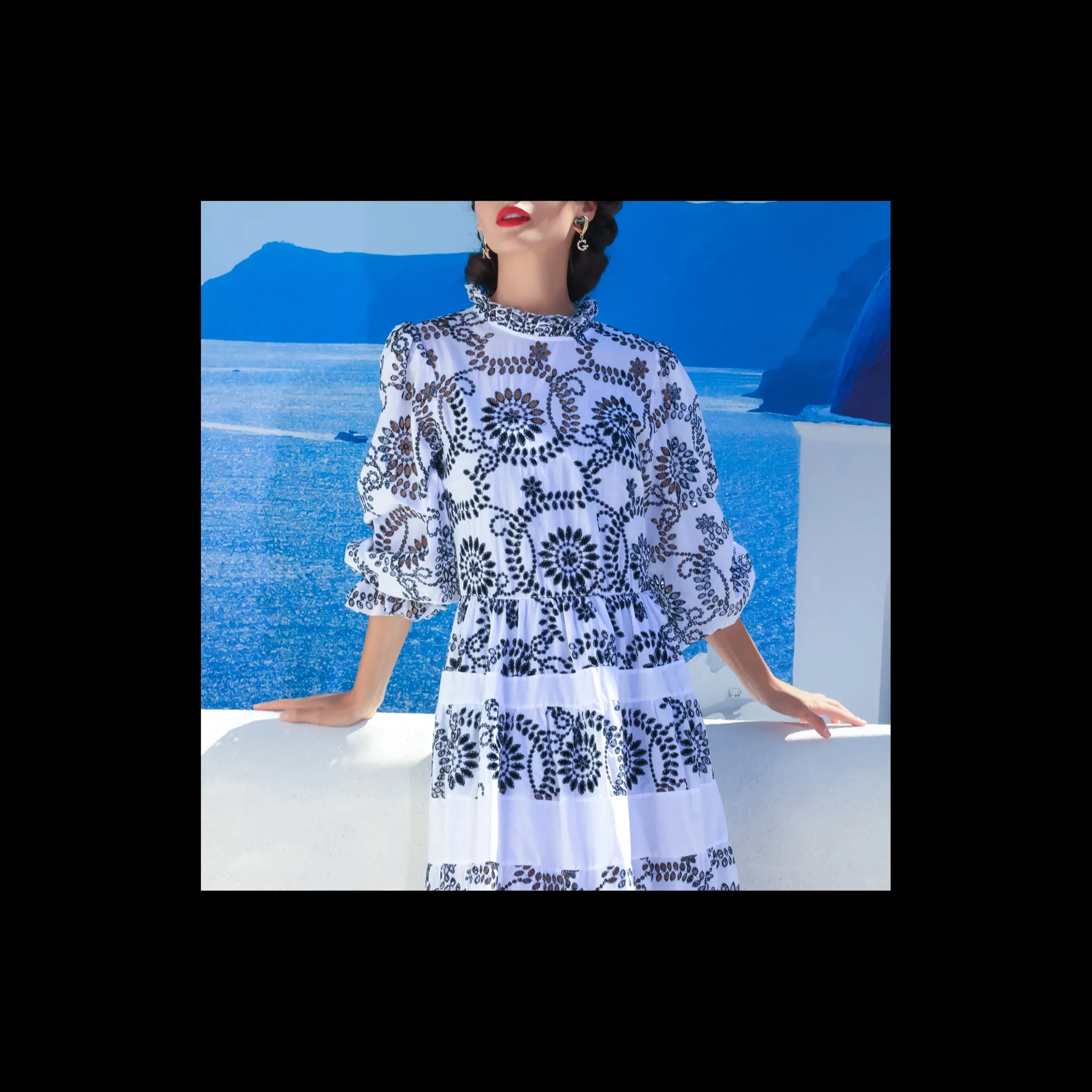 Abito Lungo Giulia N, in cotone, mordido, con coulisse piccolissima in vita, fondo bianco e fantasia mediterranea trasforata di colore nero.