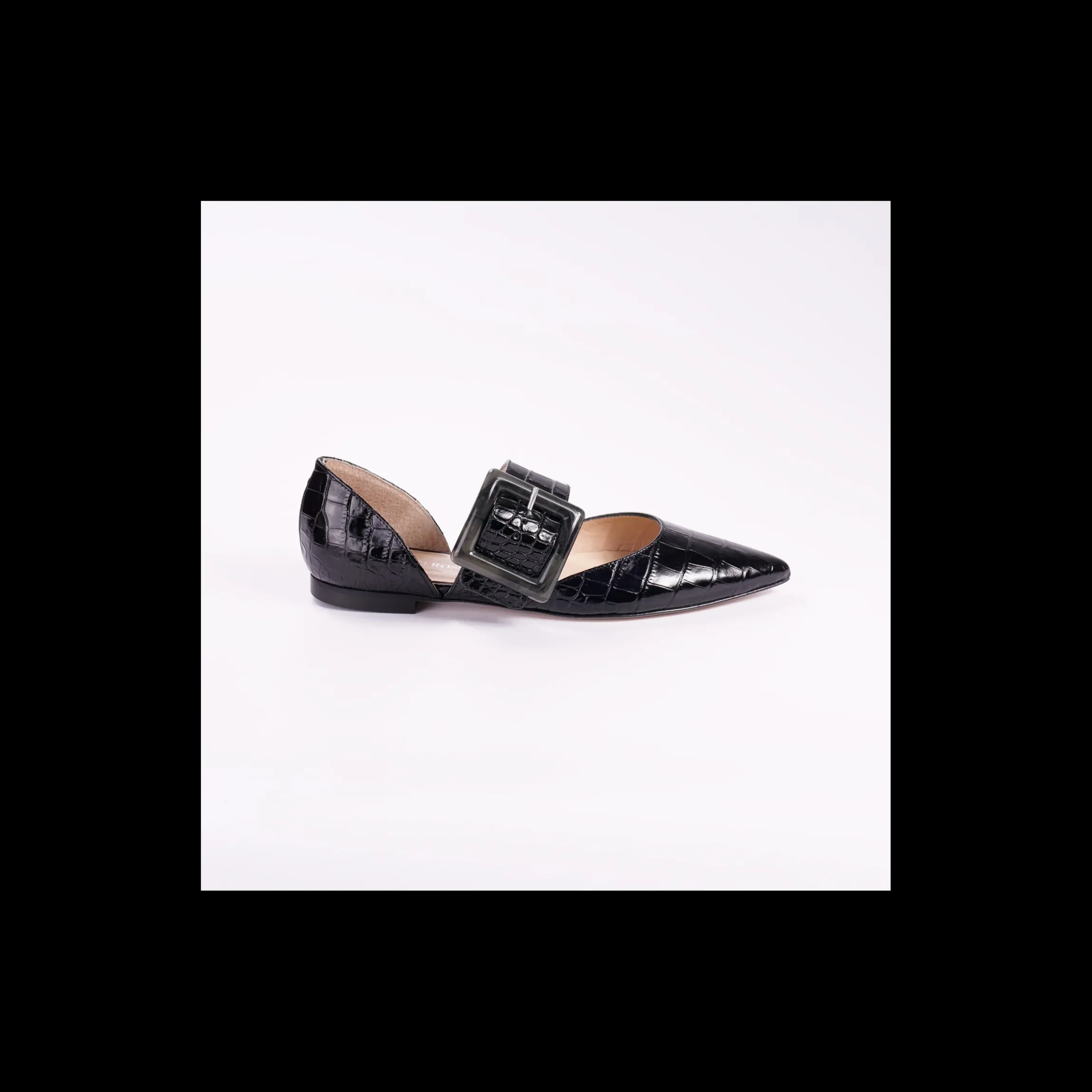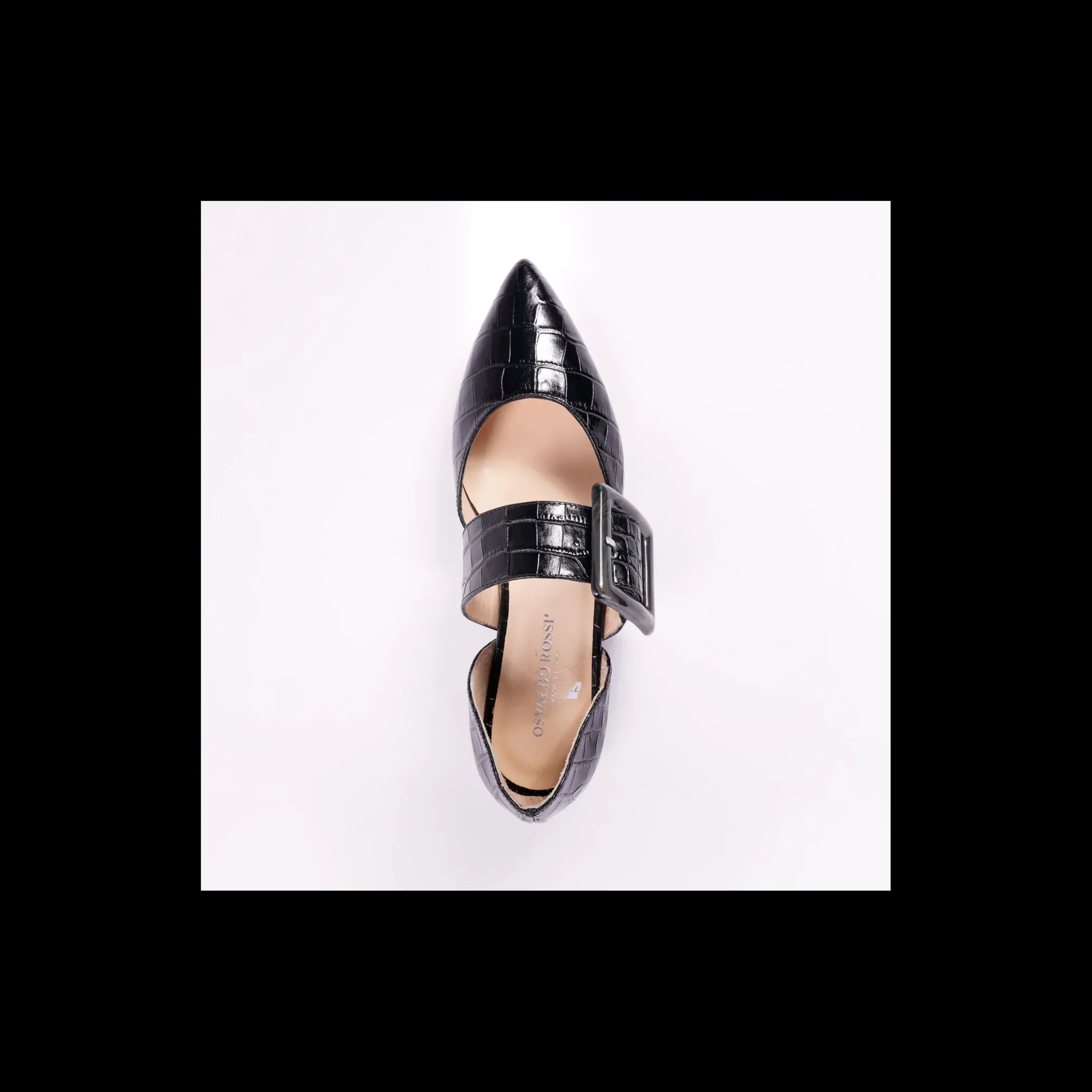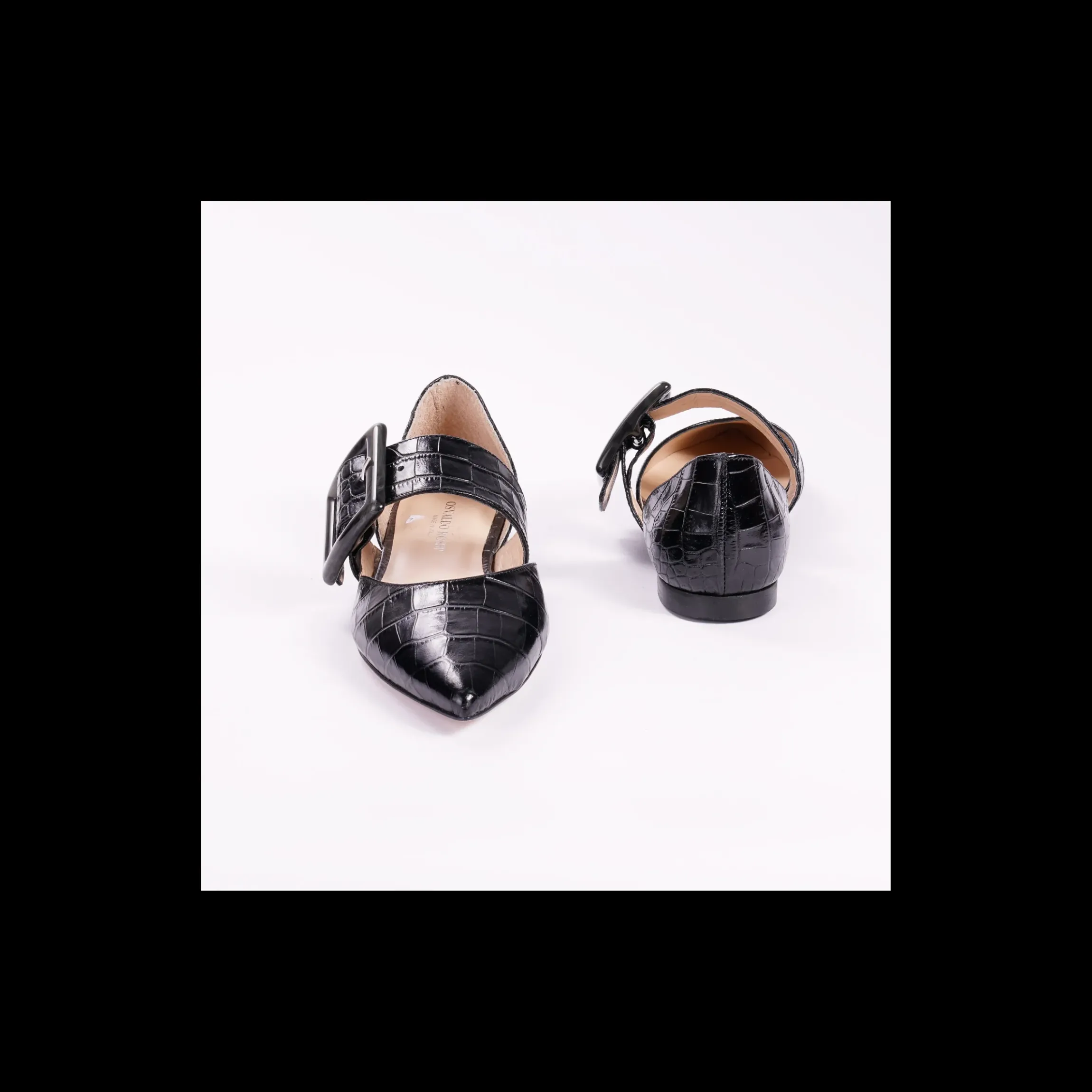 Ballerina OSVALDO ROSSI in pelle lucida stampa cocco colore cipria, a punta, banda in pelle con maxi fibbia, interno in pelle, fondo cuoio
