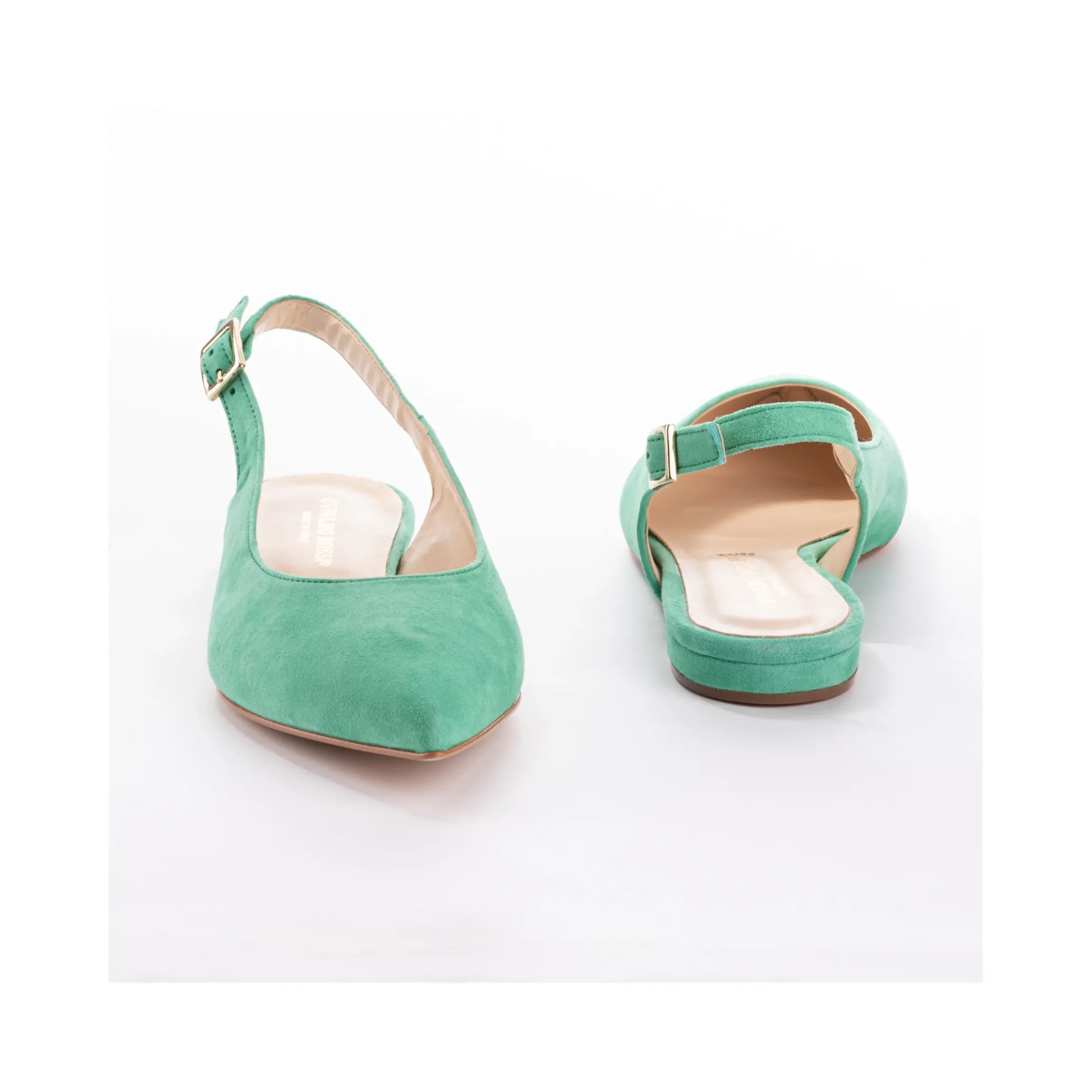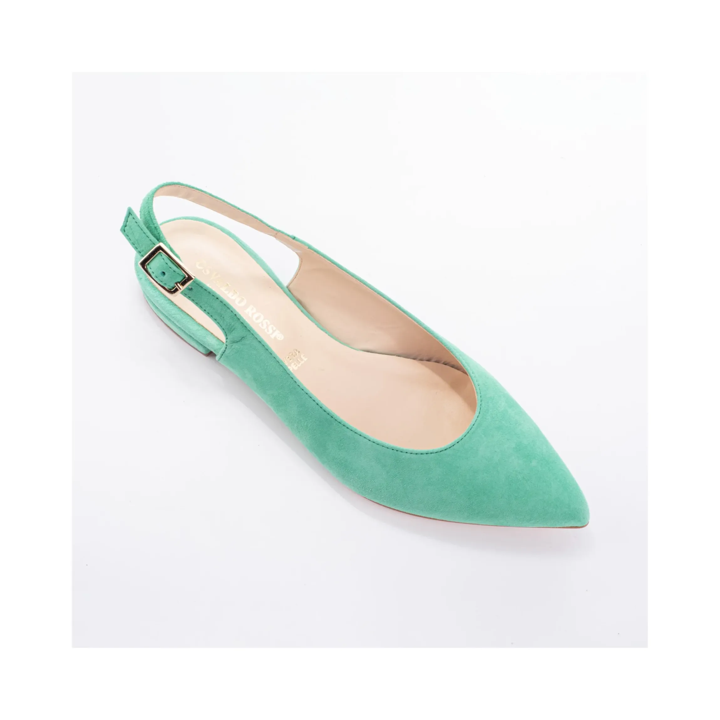 Ballerina Osvaldo Rossi Made in Italy modello chanel, a punta. Chiusura con fibbia laterale, in morbido camoscio verde.