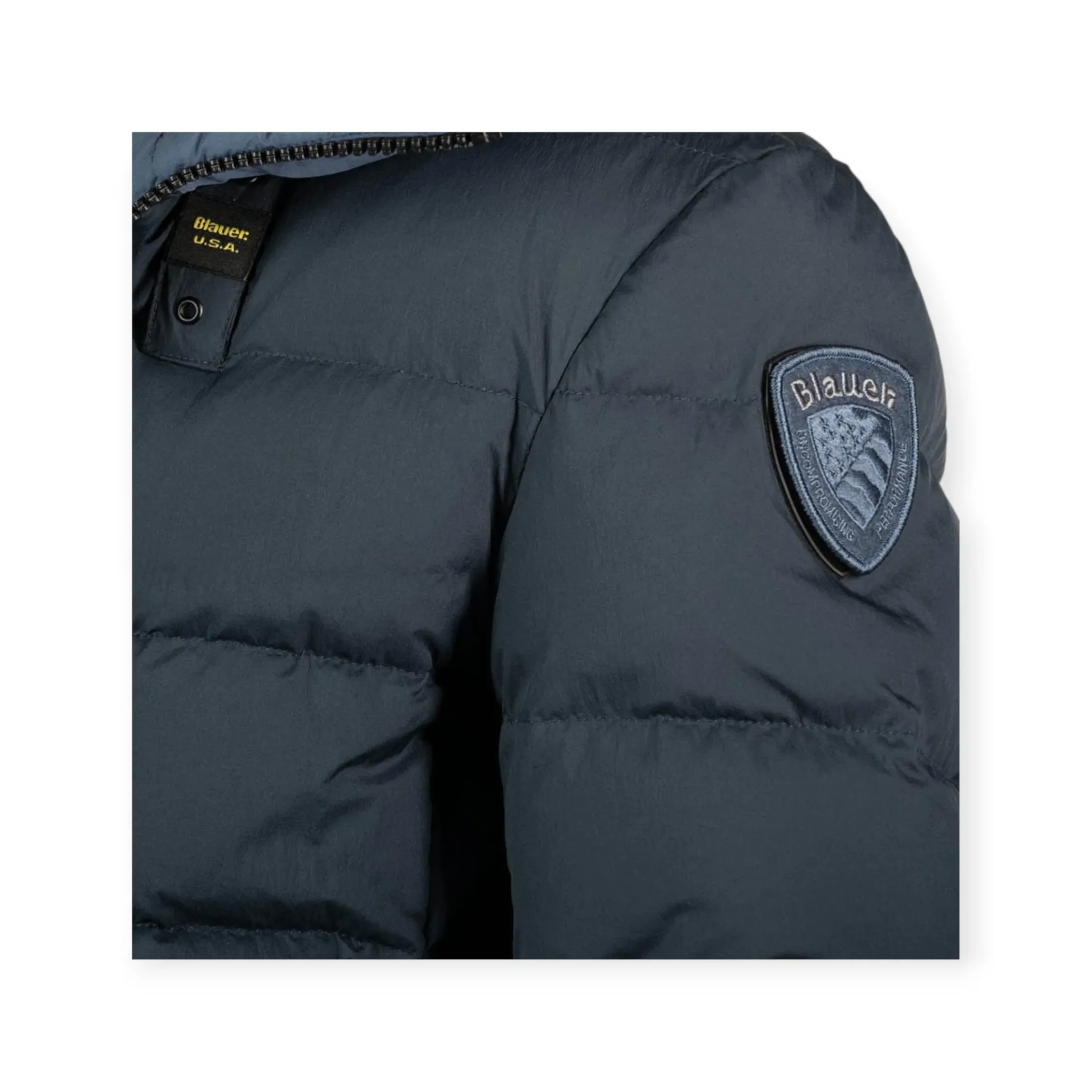Piumino in nylon opaco imbottito piuma impunturato a righe orizzontali, con cappuccio fisso e coulisse nel bordo.Chiusura centrale con zip a doppio cursore.Altre due tasche davanti con zip. Coulisse con tubolare elastico sul fondo del capo. Doppio polsino di cui quello interno in nylon con elastico. Fodera liscia in nylon in contrasto colore, due tasche interne.Caratteristico passante Blauer in tono cucito sul petto a sinistra e patch Blauer con velcro sulla manica sinistra.Piumino 100% nylon e imbottitura piuma d’anatra bianca 90% e piuma 10%, 295 gr.