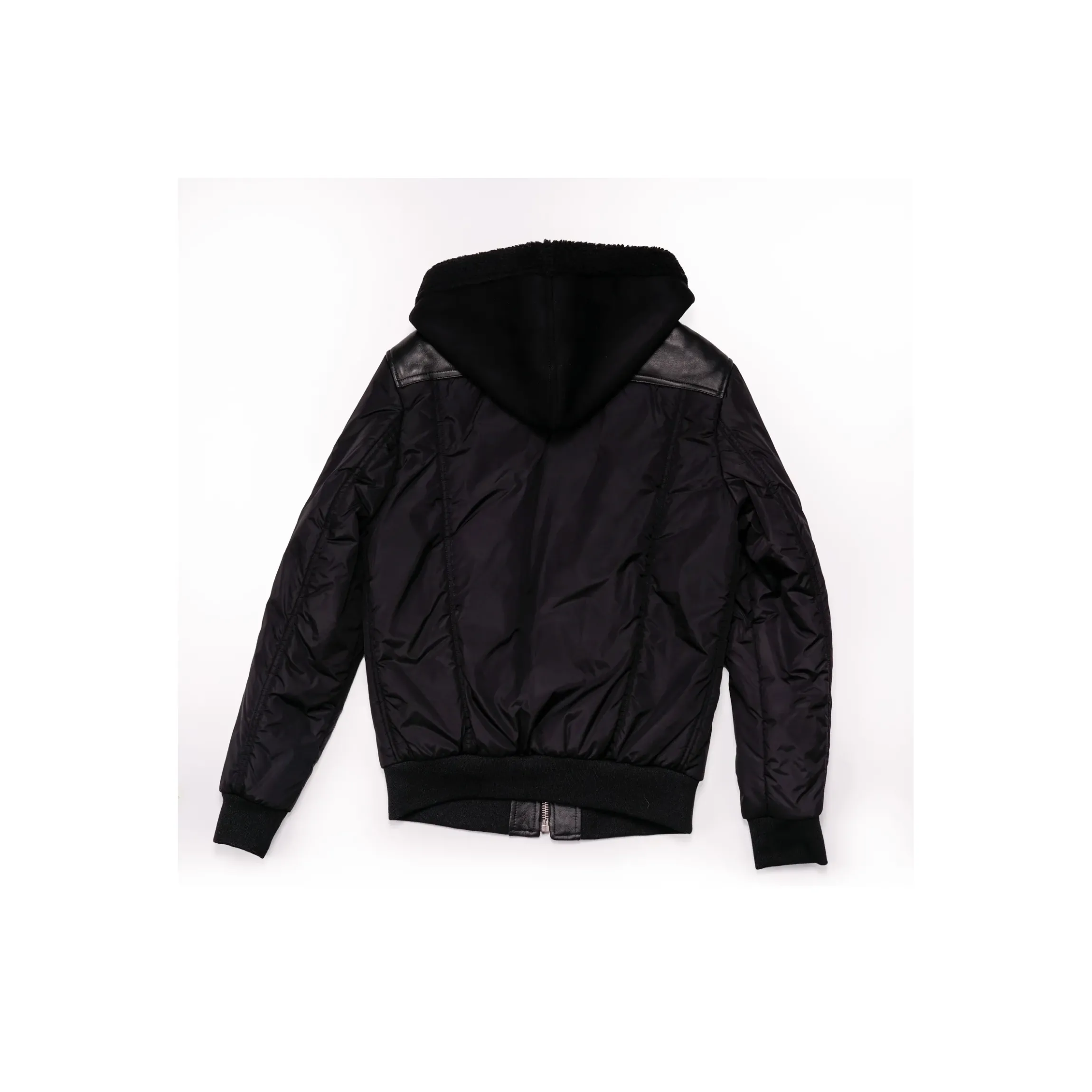 GIUBBOTTO UOMO DI COLORE NERO, IN NYLON CON INSERTI IN PELLE E CAPPUCCIO IN ECOMONTONE. CHIUSURA FRONTALE CON CERNIERA.