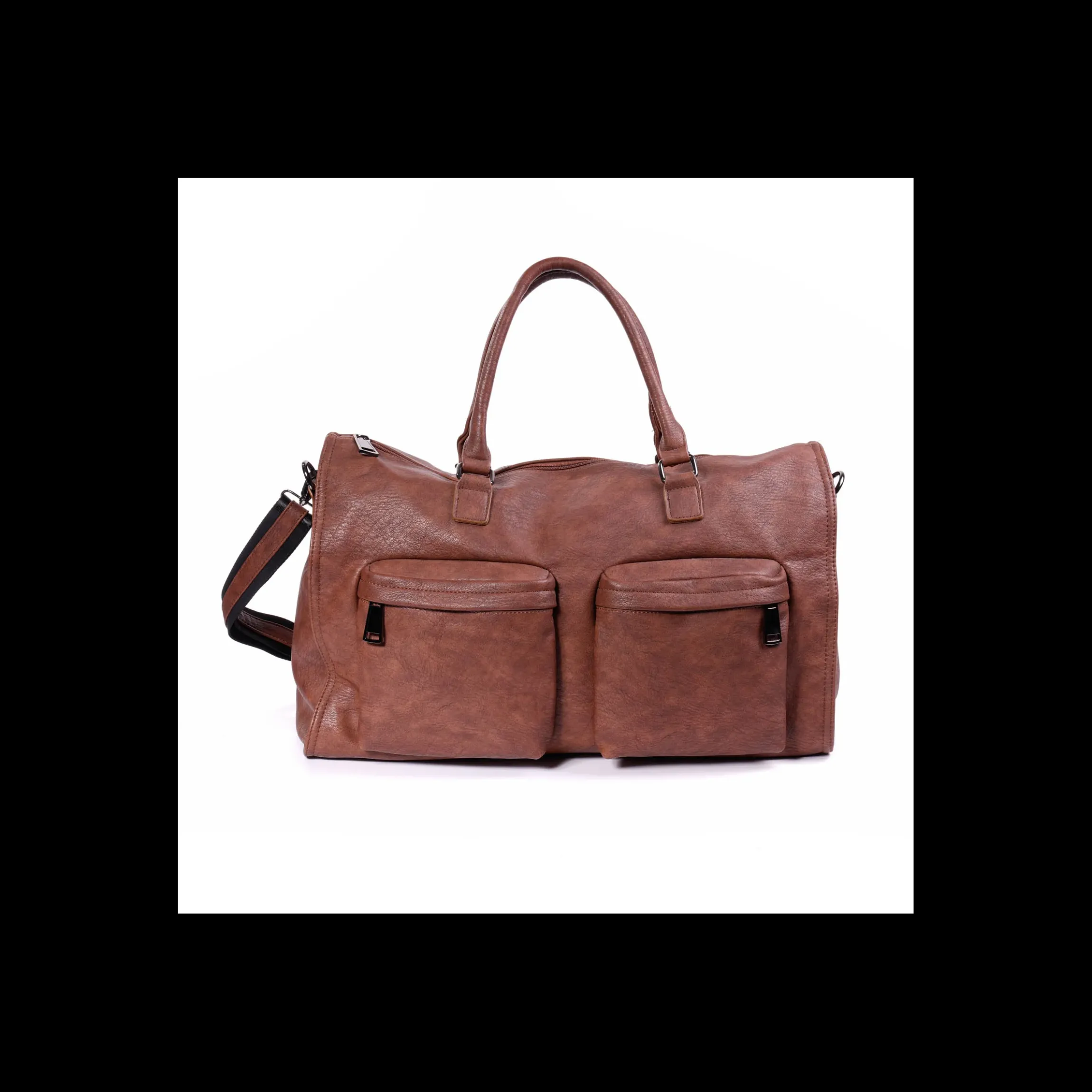 Borsone unisex MADE IN ITALY in eco-pelle colore marrone effetto vintage, doppia maxi tasca contenitore frontale, tasca posteriore esterna con zip, tracolla in tela colore nero e eco-pelle colore marrone, capiente e leggero