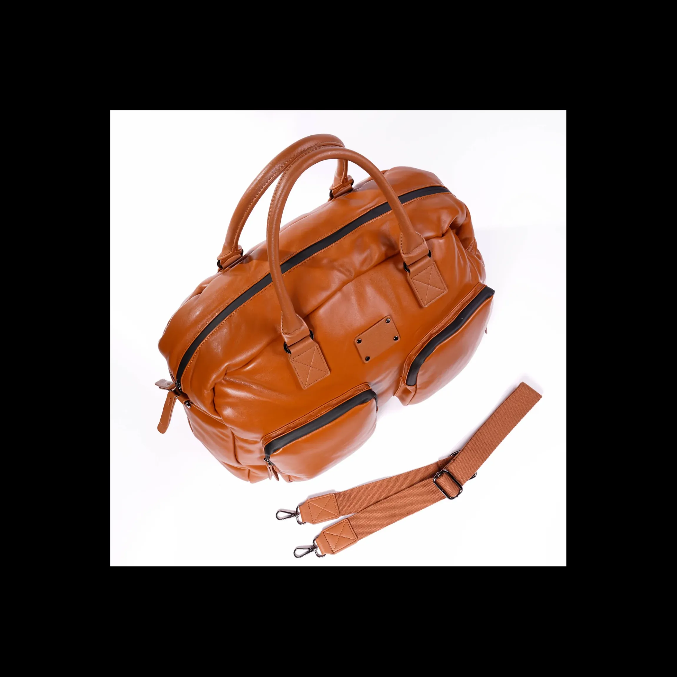 Borsone unisex MADE IN ITALY in eco-pelle imbottita colore cuoio, doppio manico , doppie tasche frontali con zip , tasca esterna con zip, tracolla regolabile