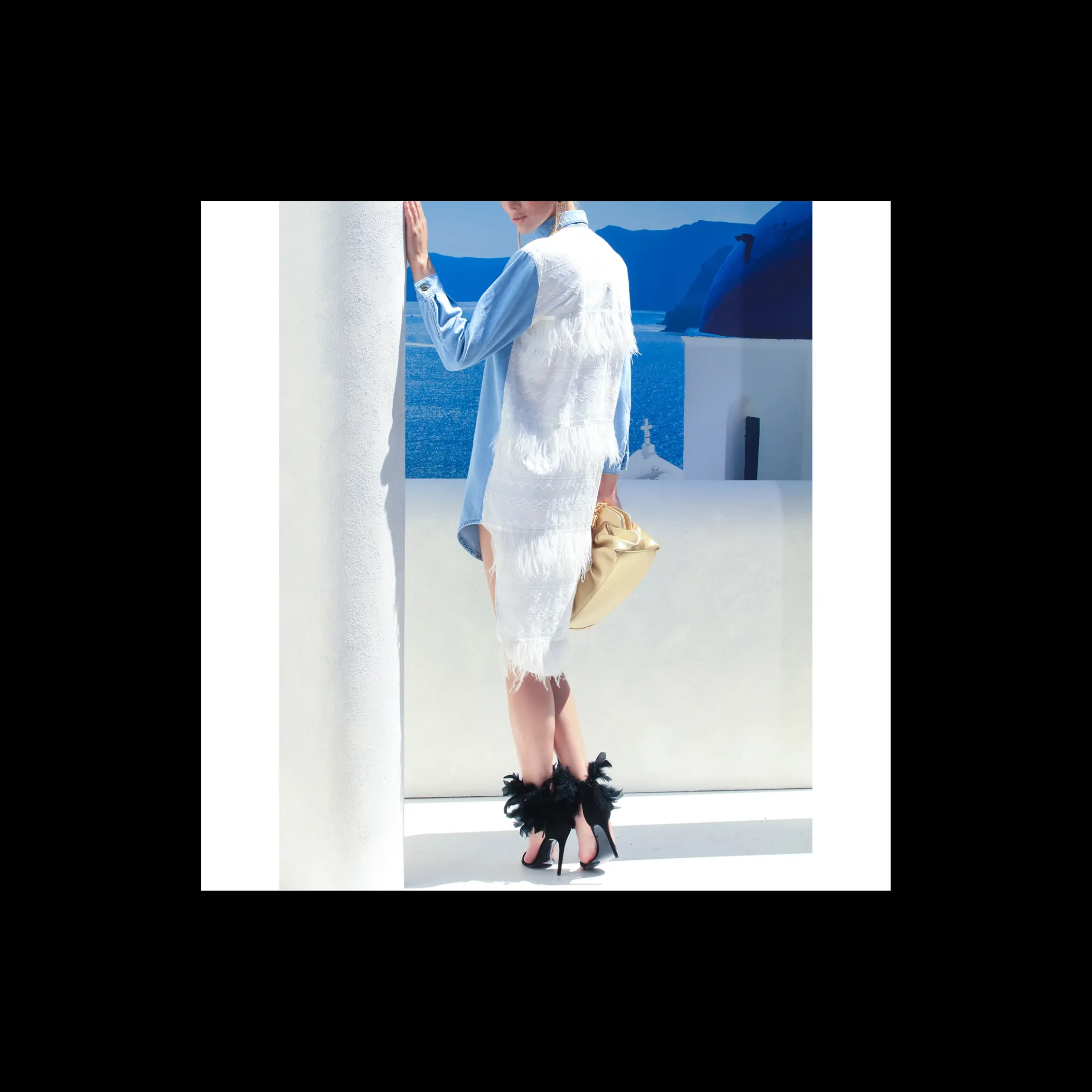 Camicione Giulia N,caratterizzato da doppio tessuto. Jeans color wash e cotone bianco con applicazione di piume. Vestibilità comoda.