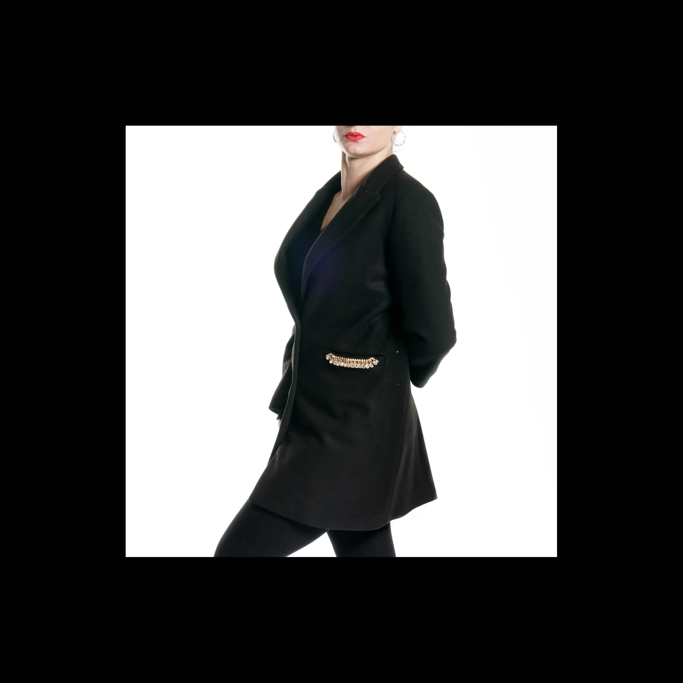 Cappottino Trash and LUXURY in panno colore nero, doppio bottone, collo a lancia, interno in raso colore ocra, maxi applicazione metallica con pietre e strass colore oro su tasche