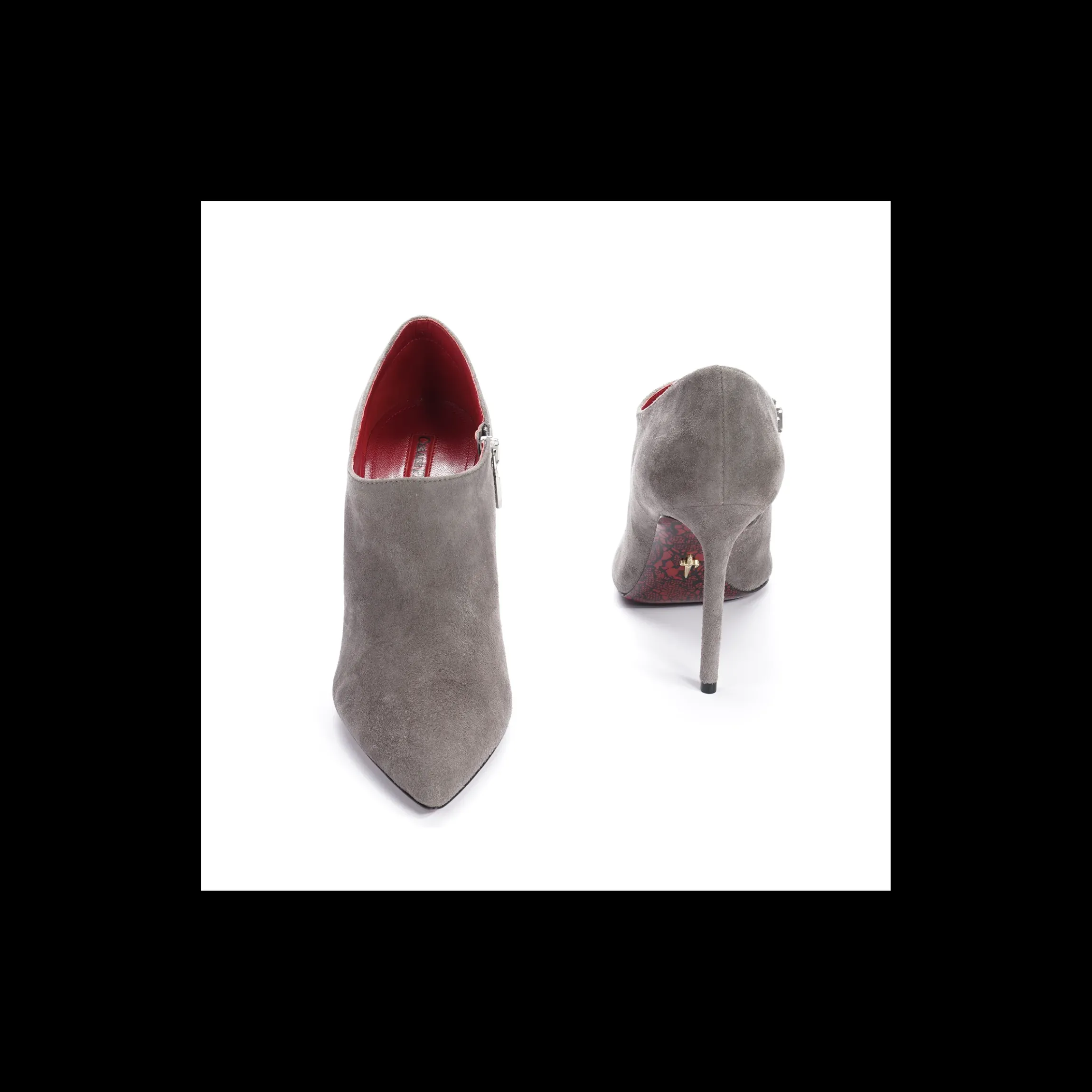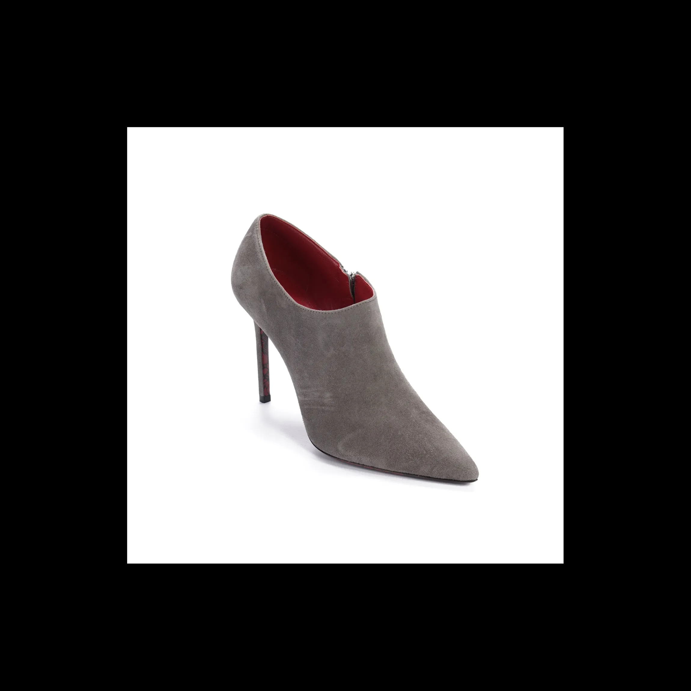 Tronchetto Cesare Paciotti Made in Italy in camoscio colore grigio. Dettaglio di chiusura con zip laterale interna. Tacco a spillo di 10 cm e fondo in cuoio. Praticità e stile pre un brand che accontenta la donna sicura di sé.
