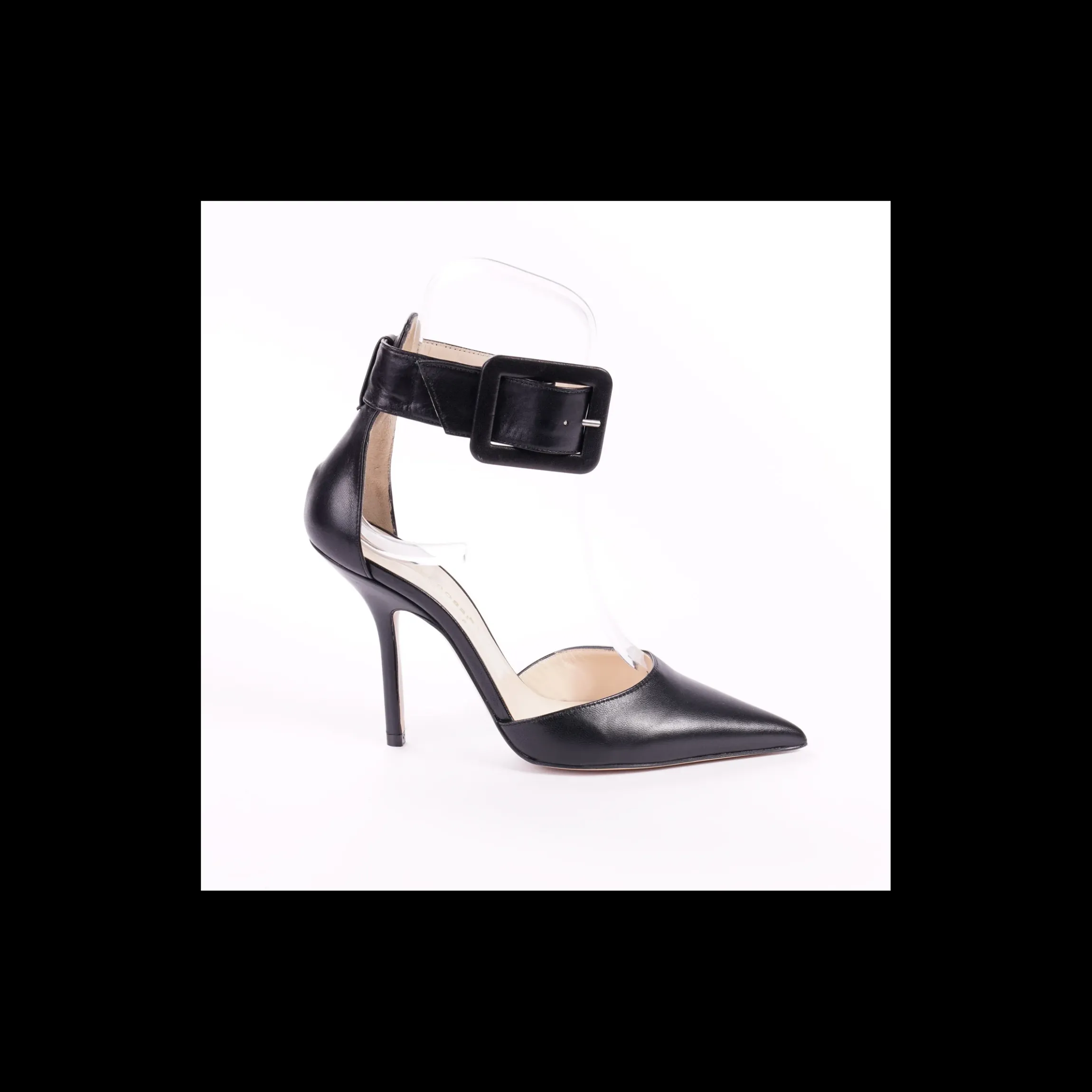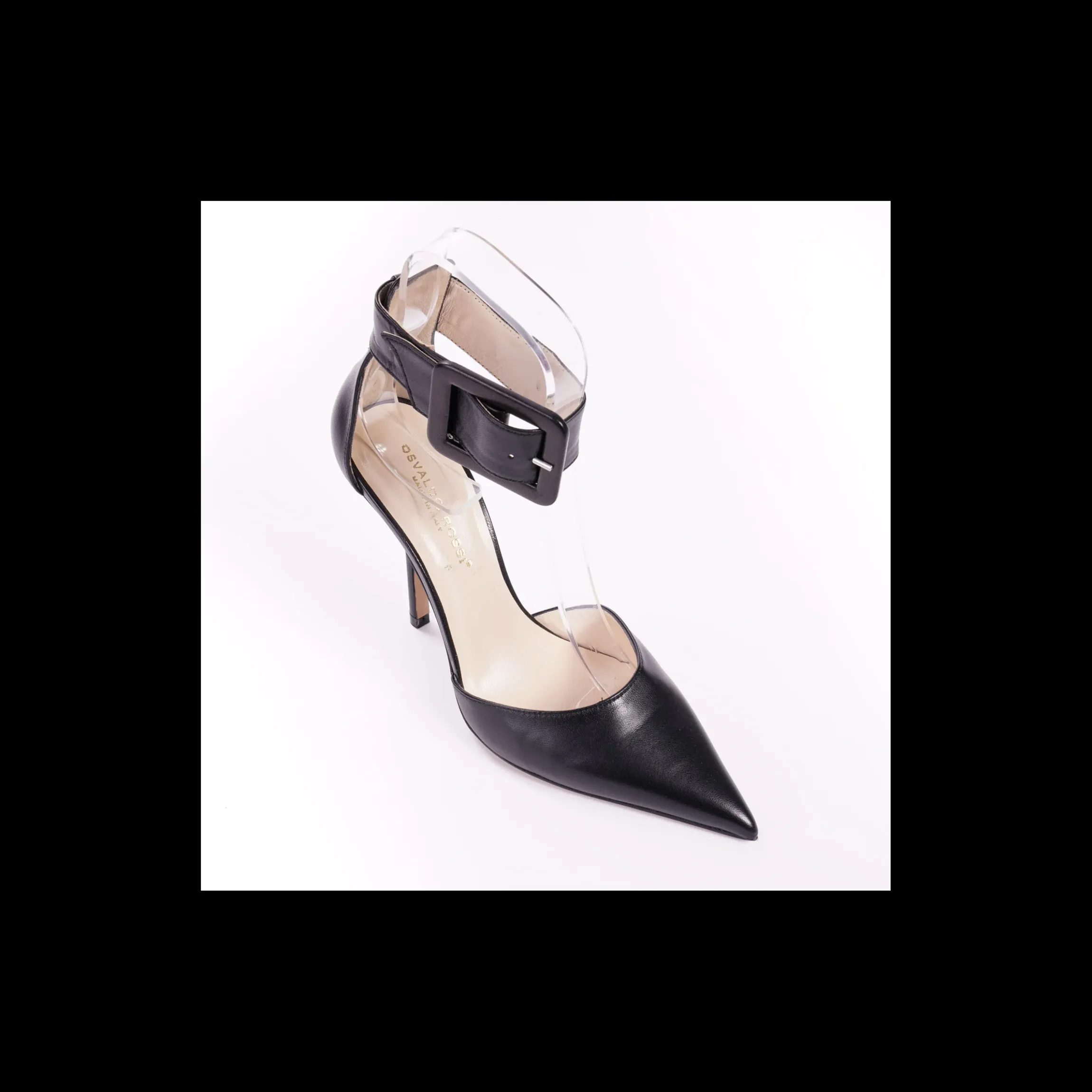 Dècolettè OSVALDO ROSSI in pelle colore nero, a punta, cinturino alla caviglia, maxi fibbia, interno in pelle, fondo cuoio