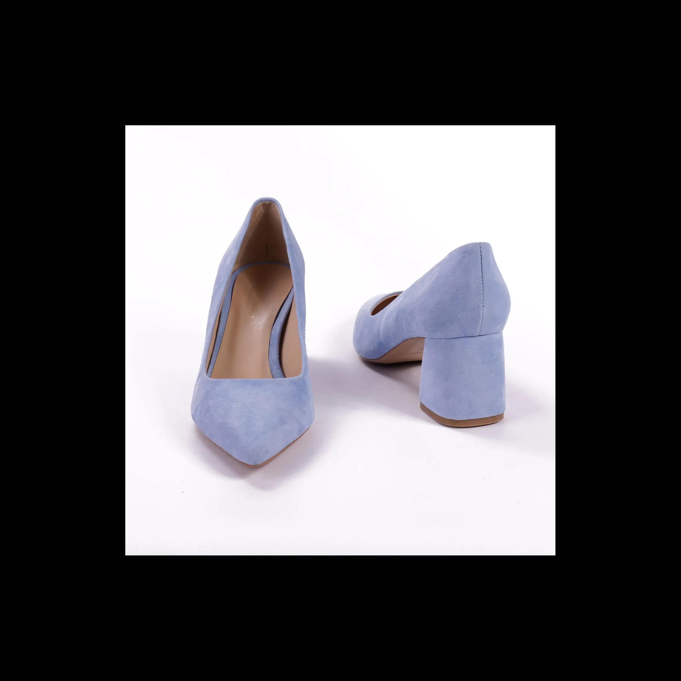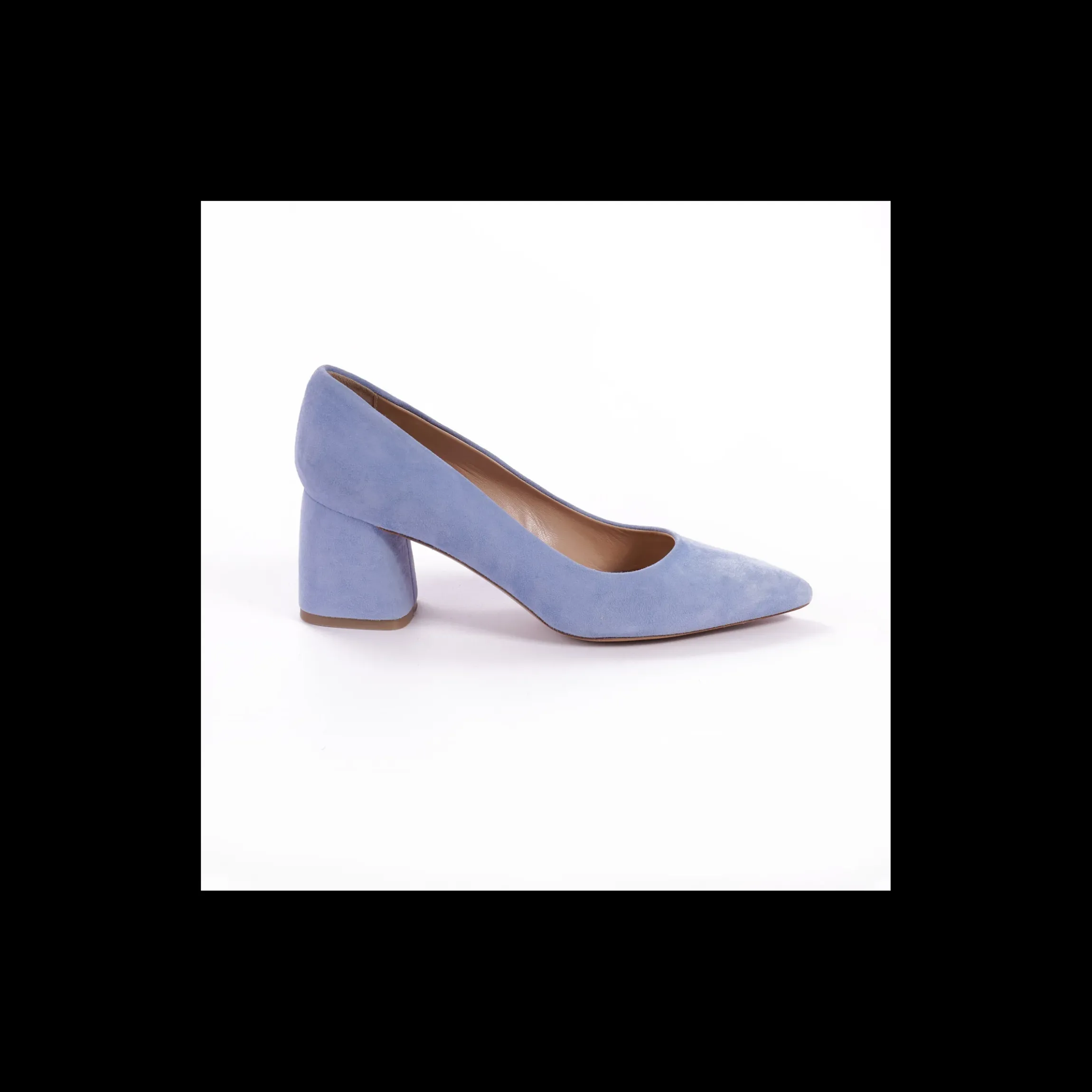 Dècolettè OSVALDO ROSSI in camoscio colore cobalto, a punta, tacco a blocco, interno in pelle, fondo cuoio