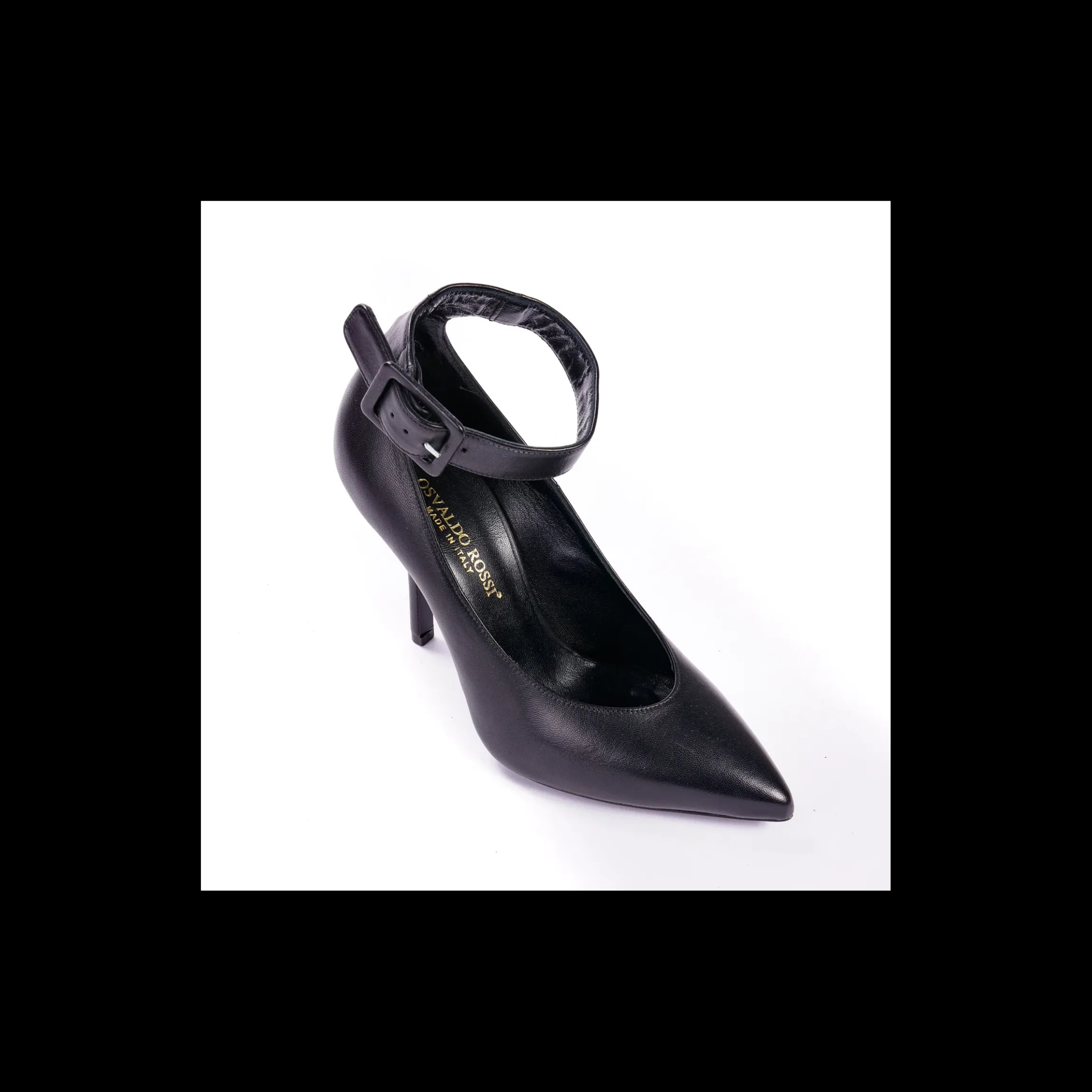 Dècolettè OSVALDO ROSSI in pelle colore nero, cinturino alla caviglia con fibbia in pelle, a punta, interno in pelle, fondo cuoio, tacco 9 cm