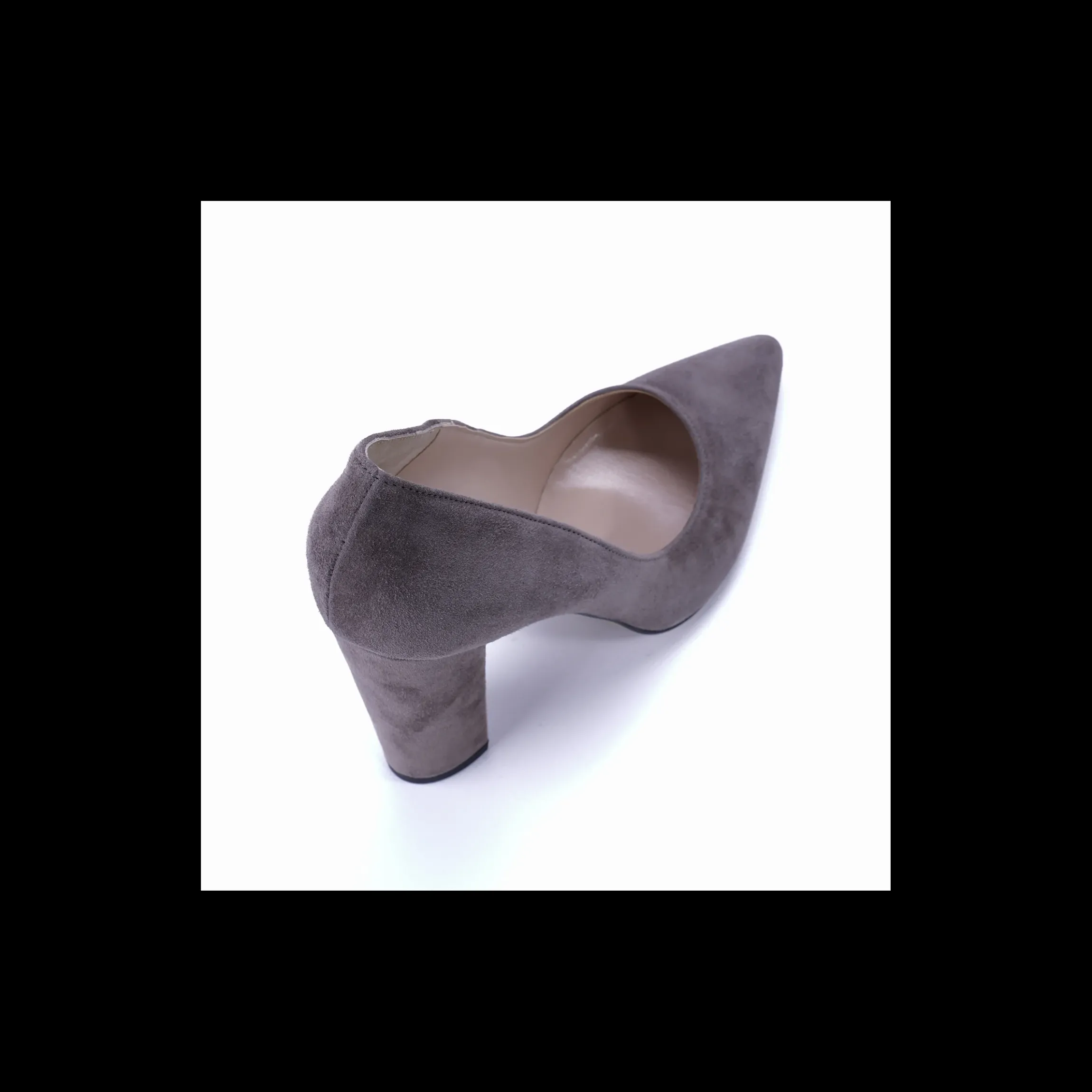 Décolleté Andrea Osvaldo Rossi Made in Italy in camoscio colore grigio. Tacco a blocco di 10 cm e fondo in cuoio. Un brand italiano garanzia di qualità e di confort.