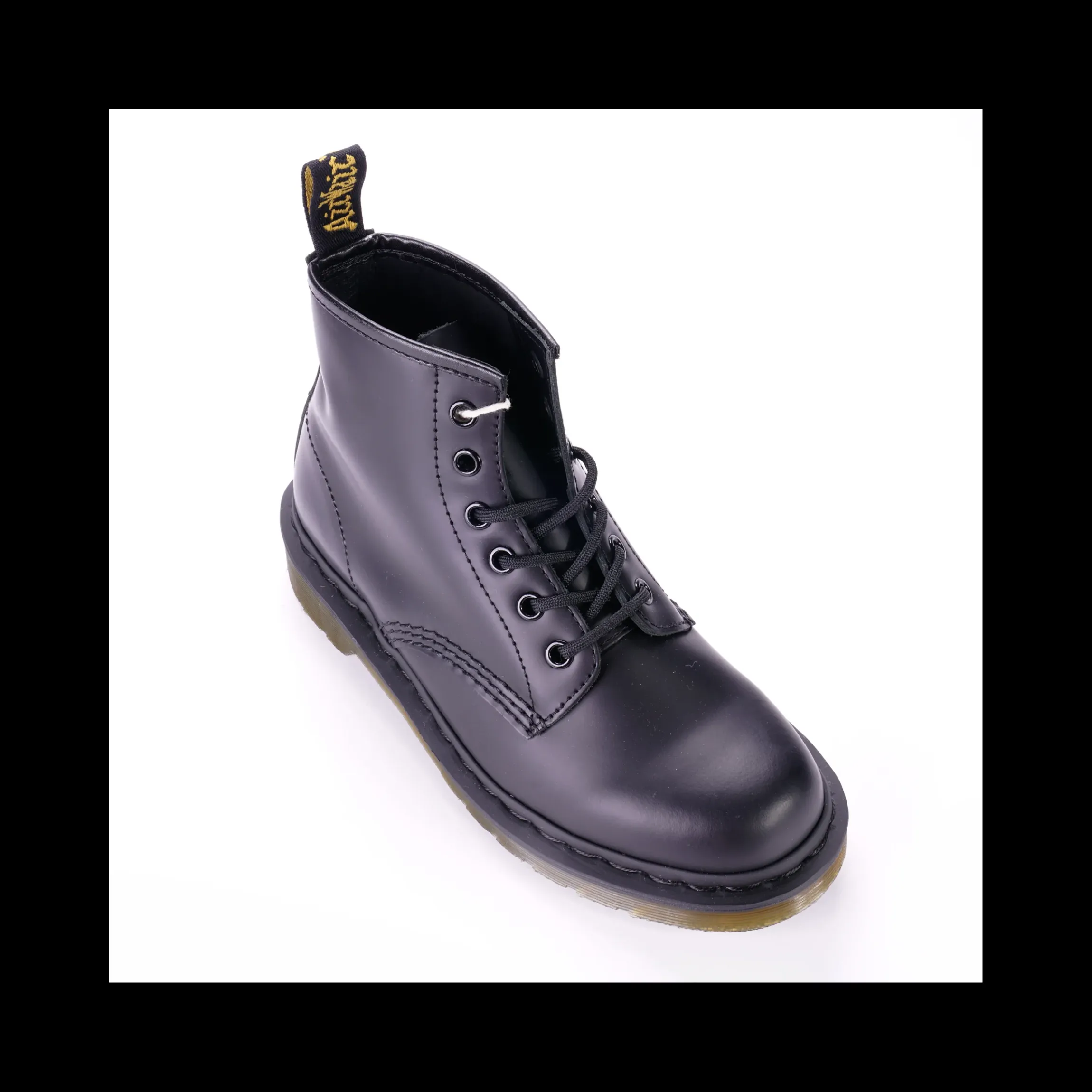Con i suoi 6 occhielli, il modello 101 non copre tutta la caviglia ma presenta comunque l’inconfondibile silhouette Dr. Martens. Pulito, netto e solido, questo stivaletto combina la praticità della calzatura da lavoro con linee classiche e una spiccata personalità.