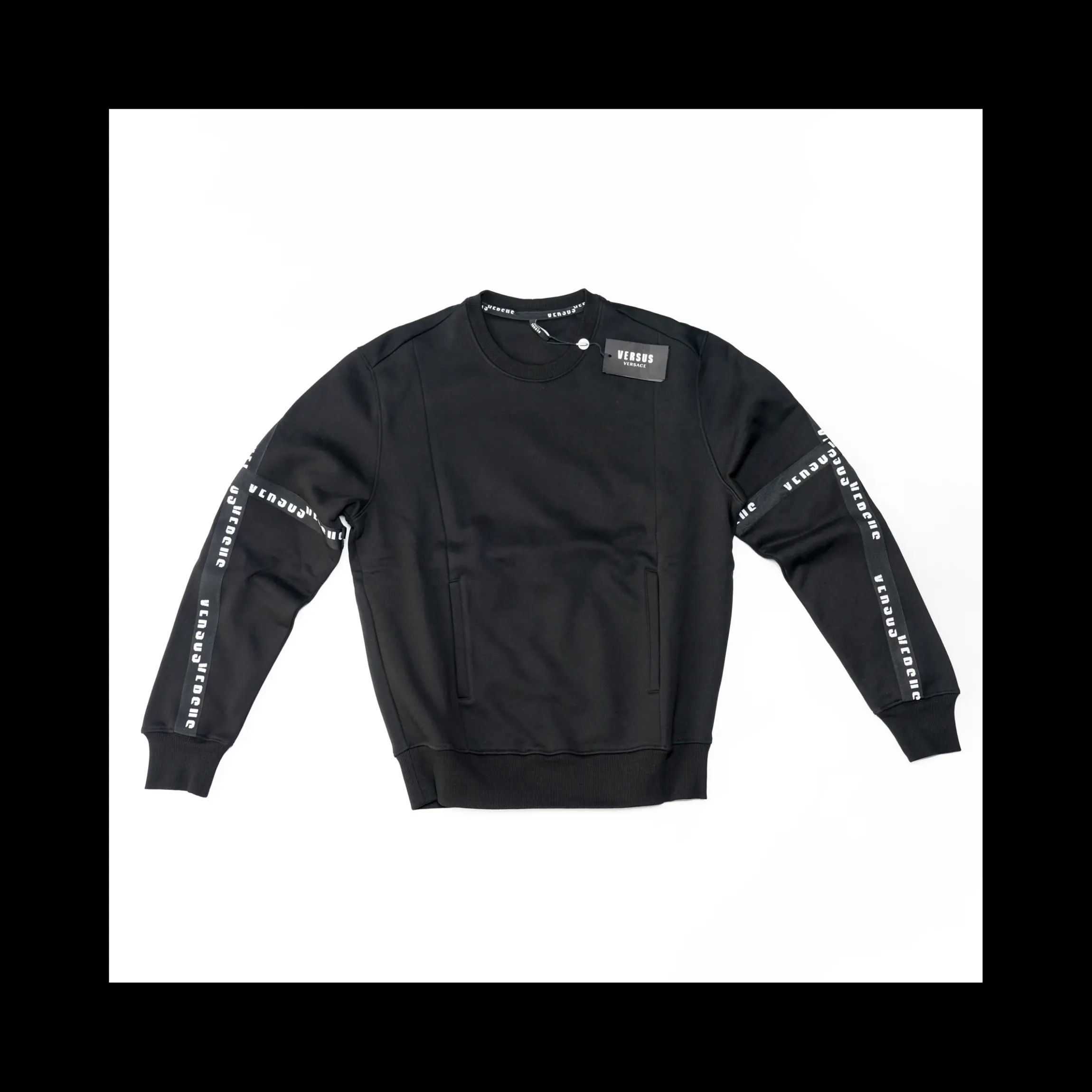 Felpa VERSUS VERSACE uomo in 100% cotone colore nero, tascone frontale, dettagli logo maxi stampe su maniche in colore bianco ,vestibilità comoda