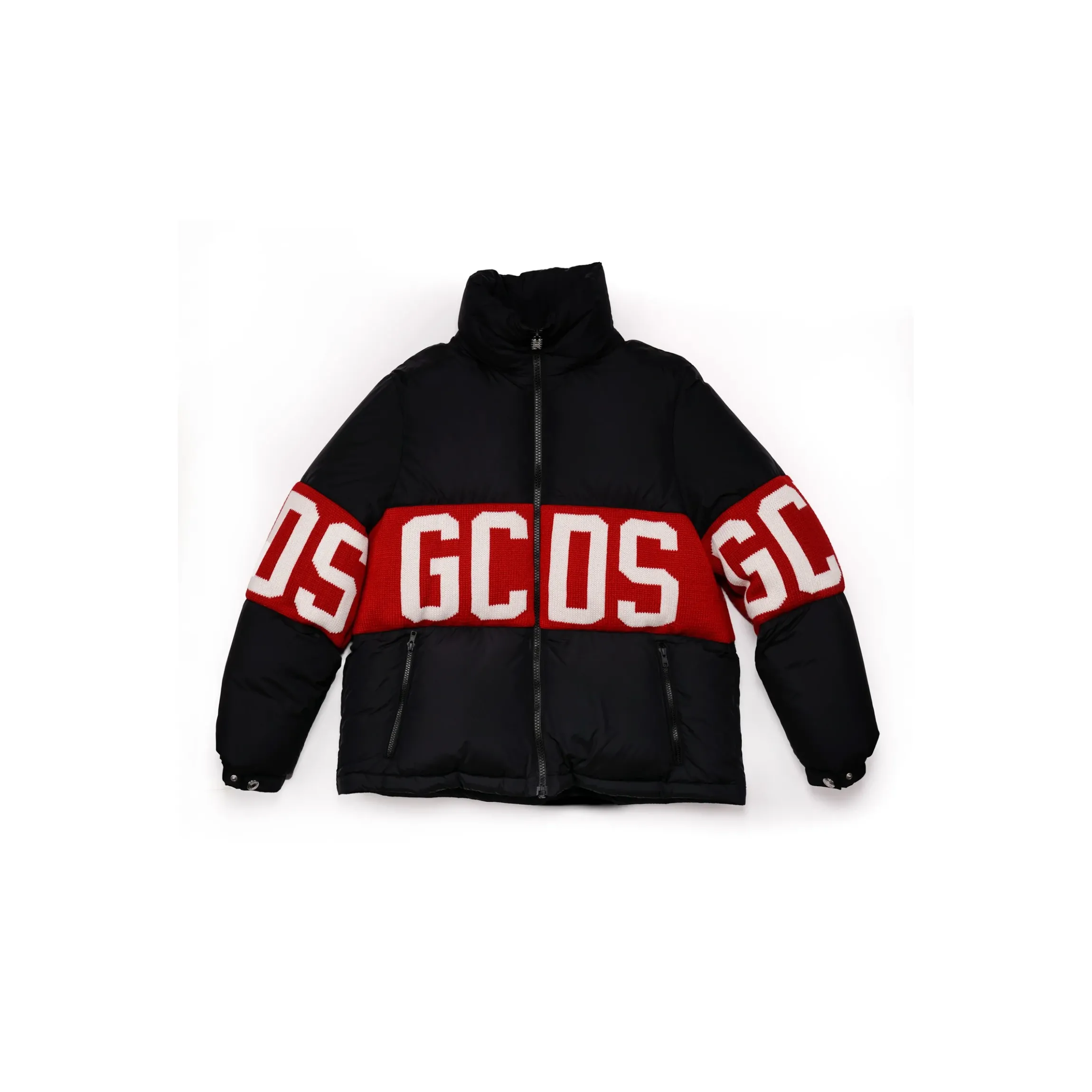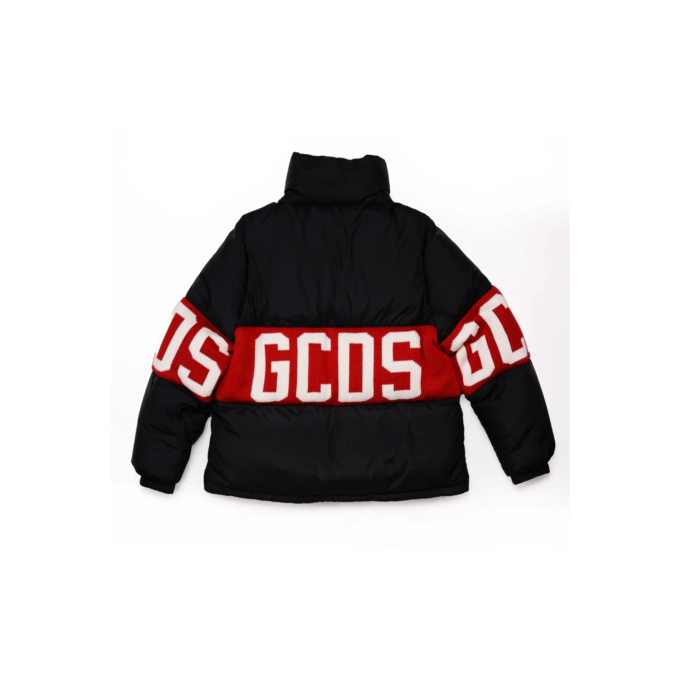 GCDS Piumino in nylon opaco, con imbottitura a boudin e collo alto, con inserto banda logo in maglia nei classici colori bianco su rosso. Tasche a filetto con zip nera a vista. Regolazione interna con coulisse elastica. Sulle maniche regolazione con elastico e bottoni automatici. Internamente, tasca elastica sul fondo e taschino con pratica zip. Imbottitura in piuma d’ oca