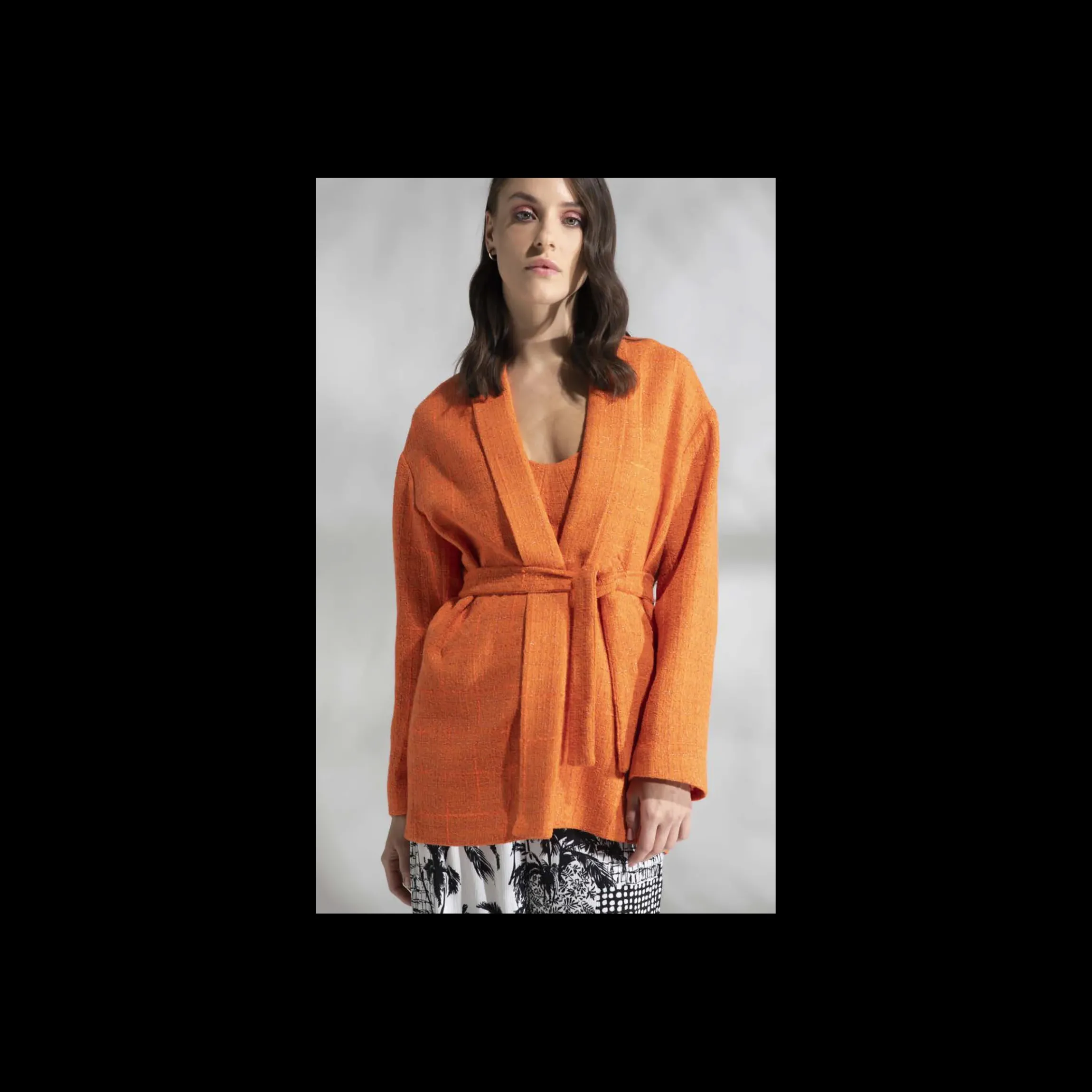 GIACCA IN COTONE GIULIA NATI , DI COLORE ARANCIO , IN COTONE FODERATO, MICROFANTASIA TINTA SU TINTA, VESTIBILITA’ OVER, CINTA DELLO STESSO TESSUTO.