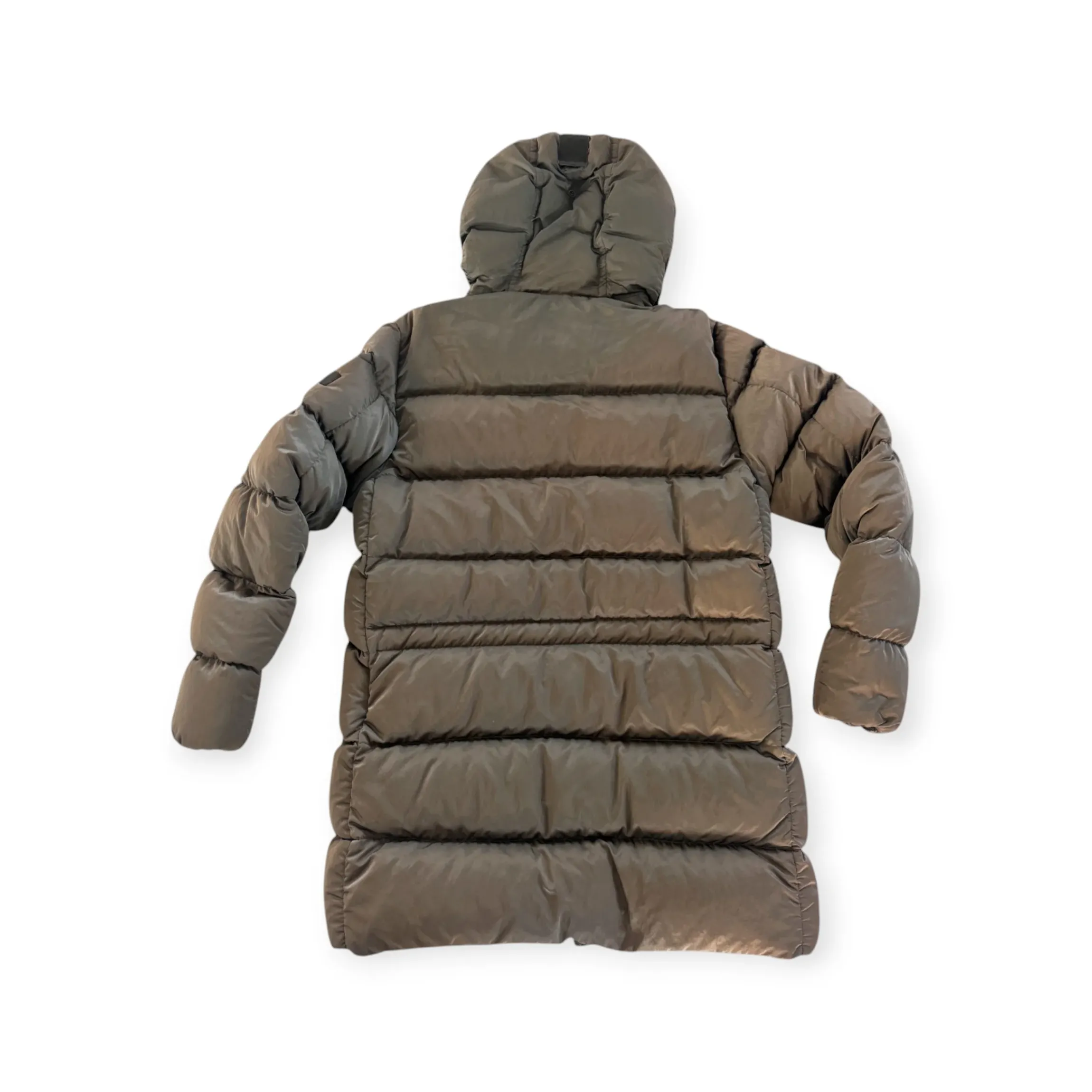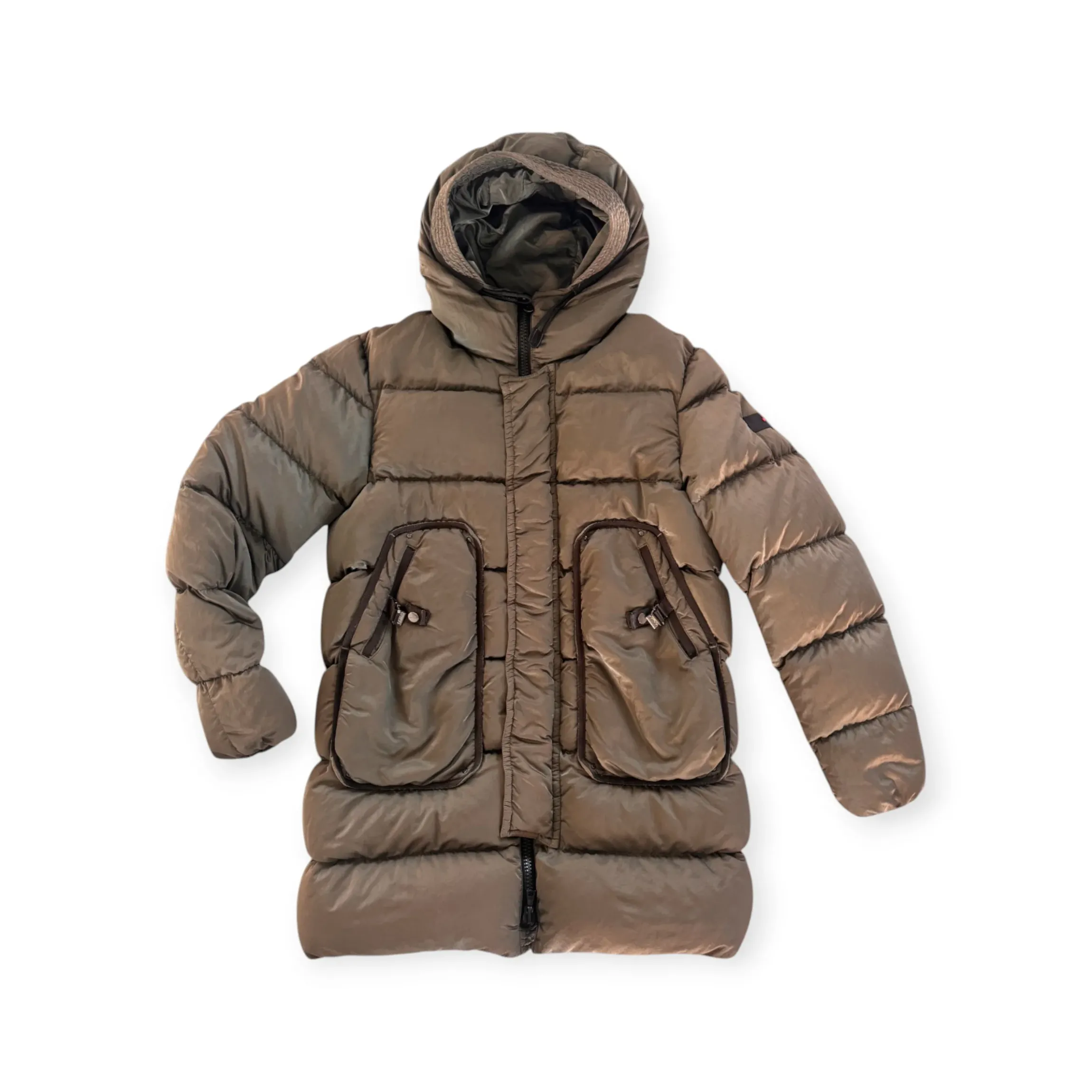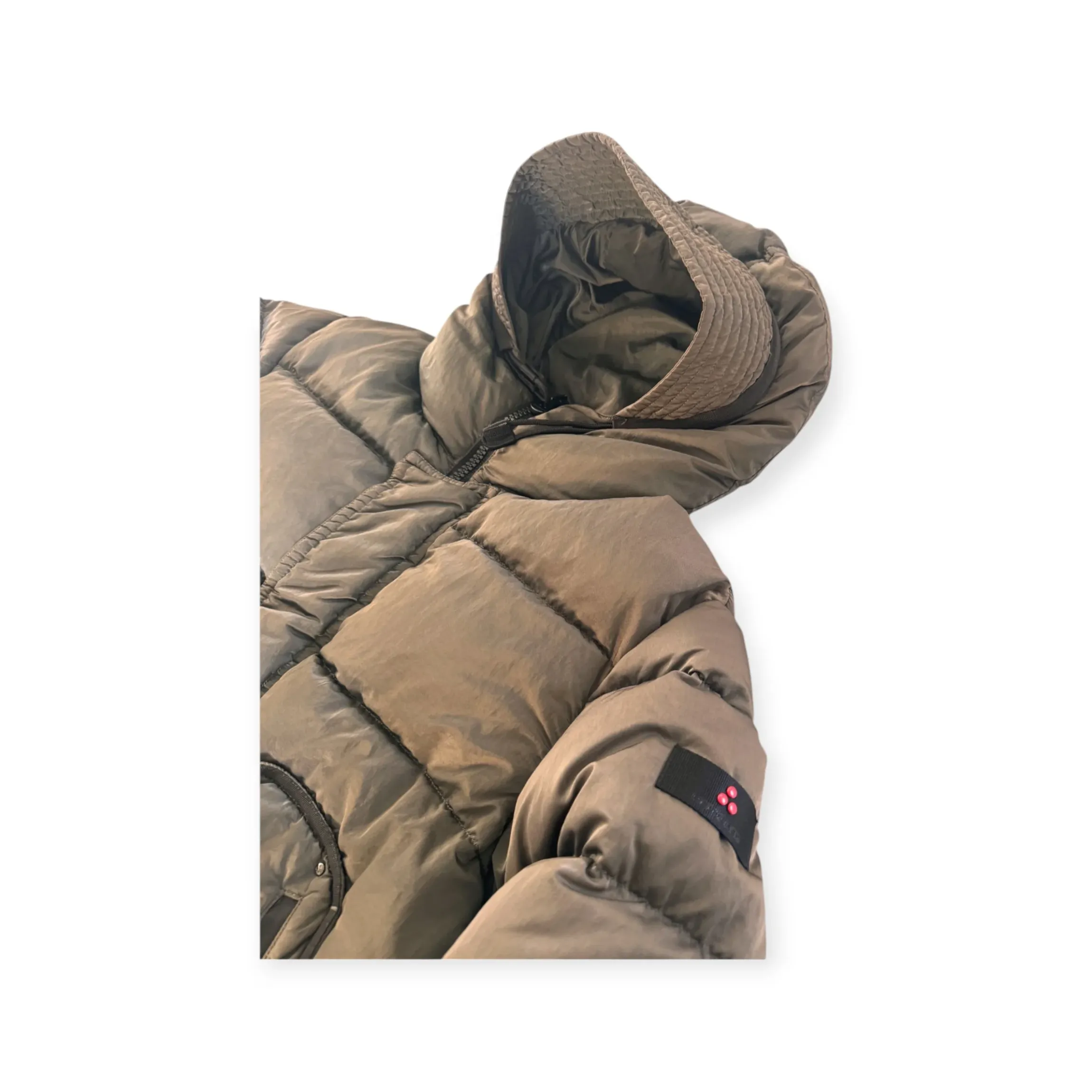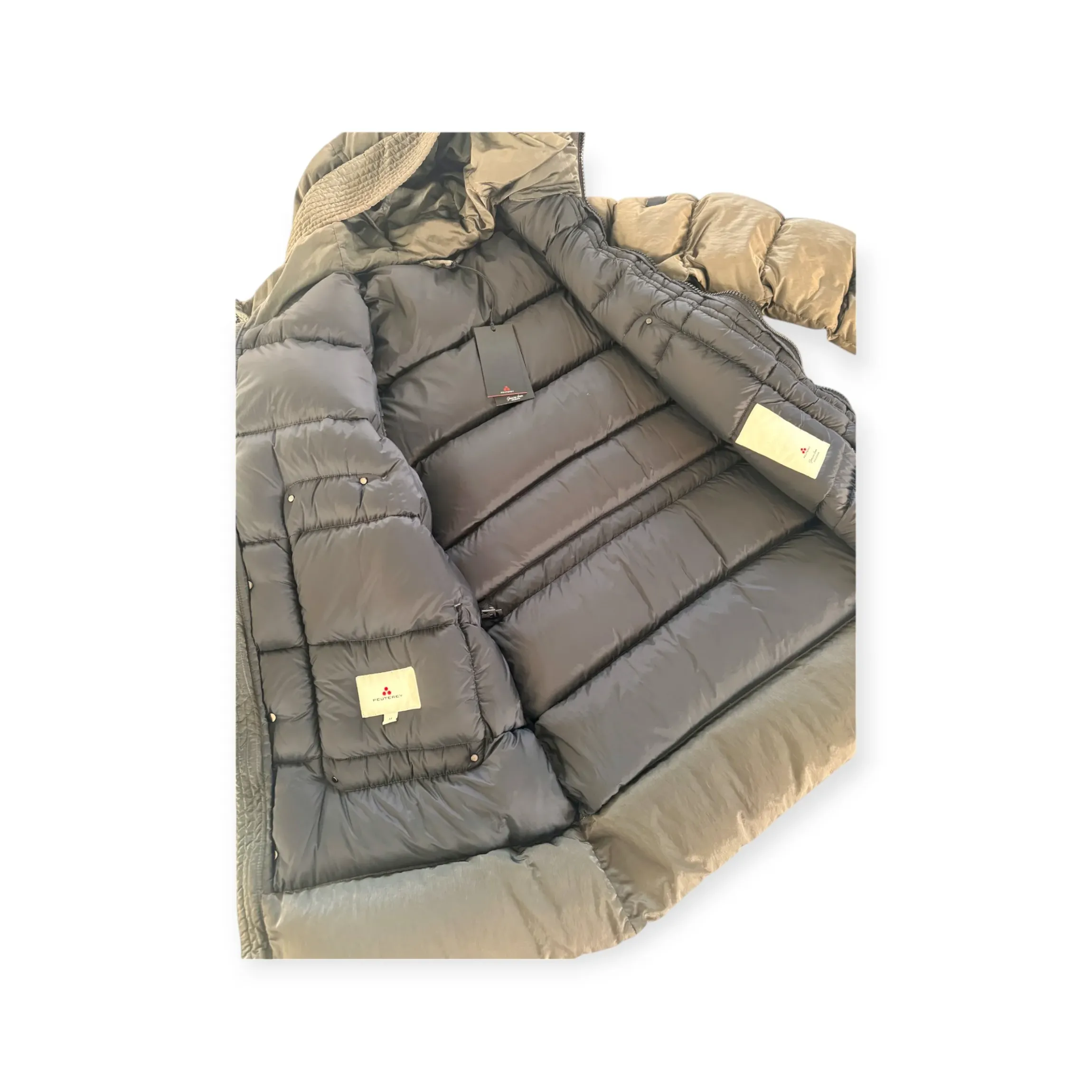 Giaccone PEUTEREY Quidel KS PPT uomo colore verde militare chiaro con cappuccio e coulisse regolabile, scaldamani laterali imbottiti in morbido tessuto, dettagli cromati metallici, chiusura frontale con zip e bottoni a scomparsa, imbottitura in vera piuma.