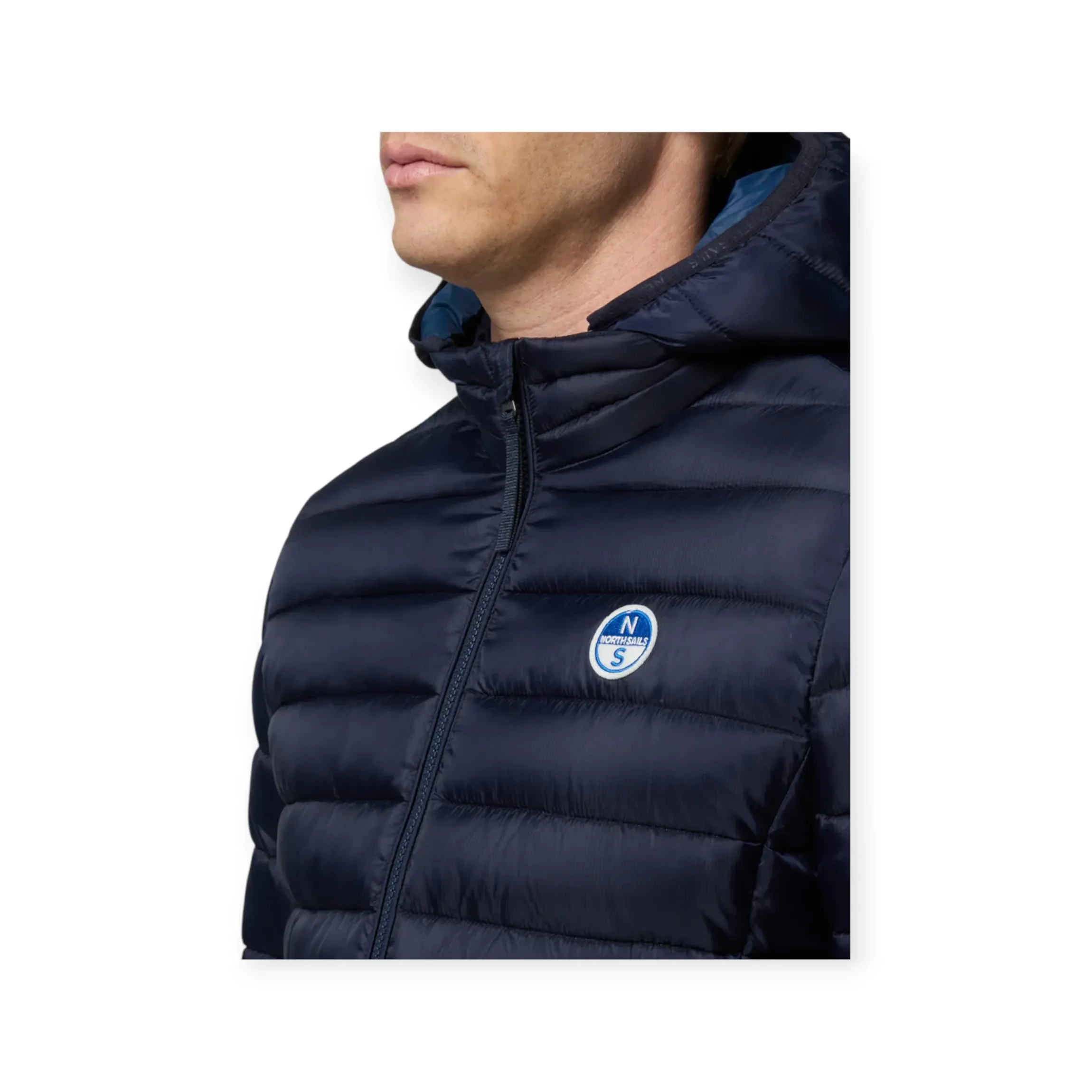GIUBBINO UOMO SKYE HOODIE NORTH SAILS, realizzato in tessuto miicro-ripstop riciclato con rivestimento idrorepellente e imbottitura in REPREVE, che riduce la quantità di plastica dispersa in mare. Si caratterizza per il cappuccio removibile da indossare in caso di pioggia, la trapuntatura che trattiene il calore, logo in feltro sul petto, chiusura con zip, finiture stretch logate, tasche invisibili con chiusura con zip e fodera a contrasto con maxi stampa. Disponibile nei colori blu, nero e verde militare