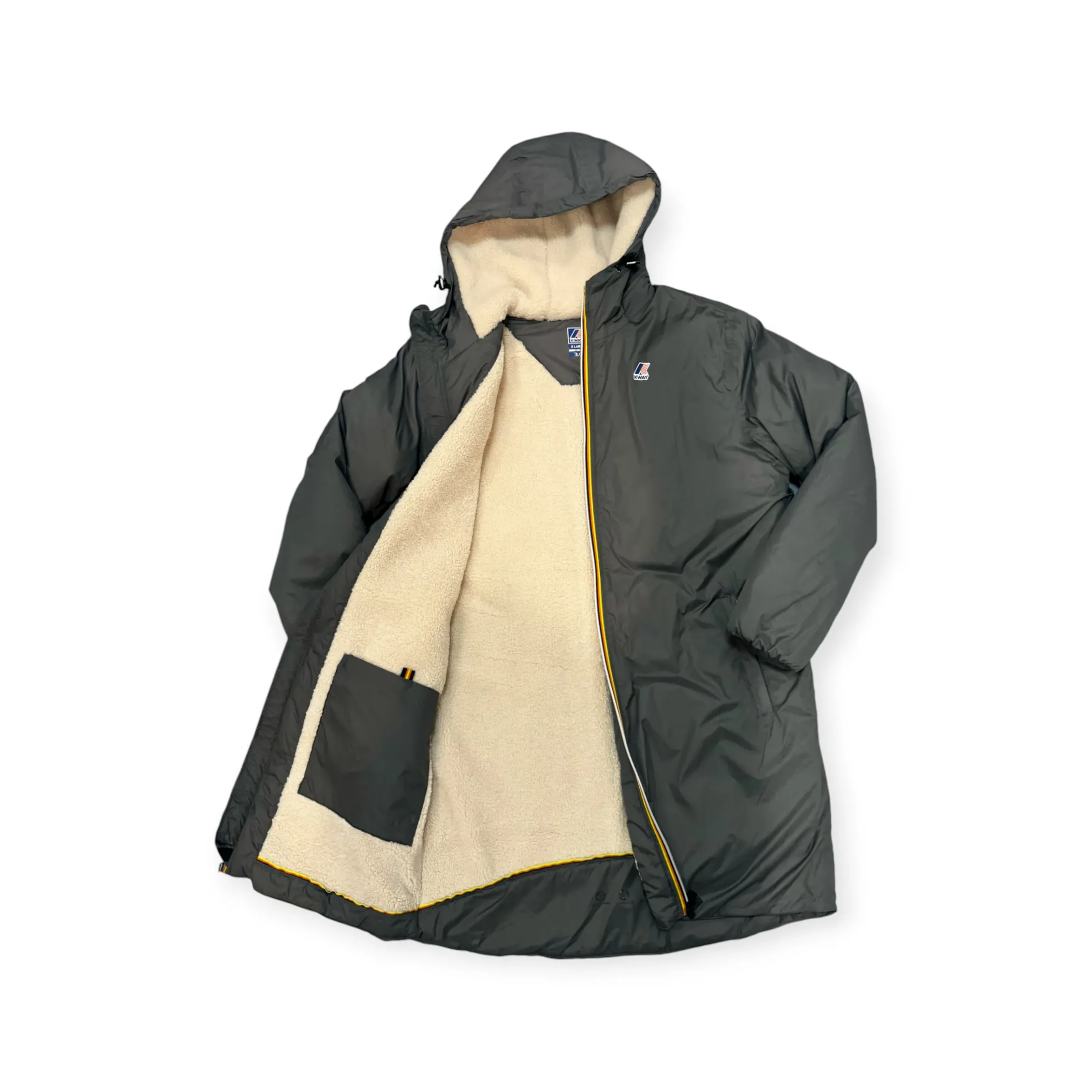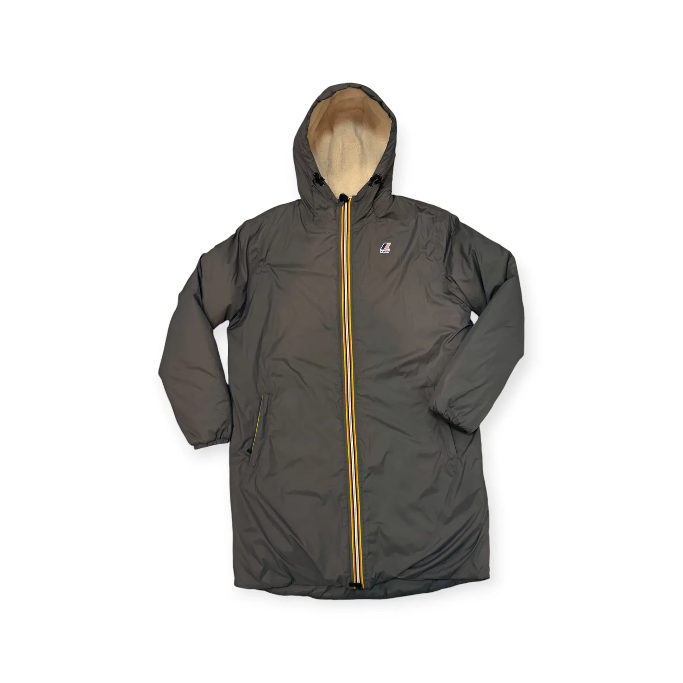 K-WAY LE VRAI 3.0 EIFFEL ORSETTO UOMO, l’ impermeabile dedicato e pensato per la stagione più fredda. Il modello si caratterizza per l’ estrema funzionalità e i dettagli grafici distintivi come il tape a righe multicolor che impreziosisce la zip. Realizzato in nylon ripstop impermeabile, idrorepellente, antivento e traspirante, rifinito con rivestimento in sherpa con texture ancora più soffice e piacevole al tatto. Il capo si presenta con cappuccio regolabile con corda elastica, chiusura con zip, patta interno antivento, polsi con elastico, 2 tasche frontali con zip e logo stampato sul petto. Disponibile nel colore grigio