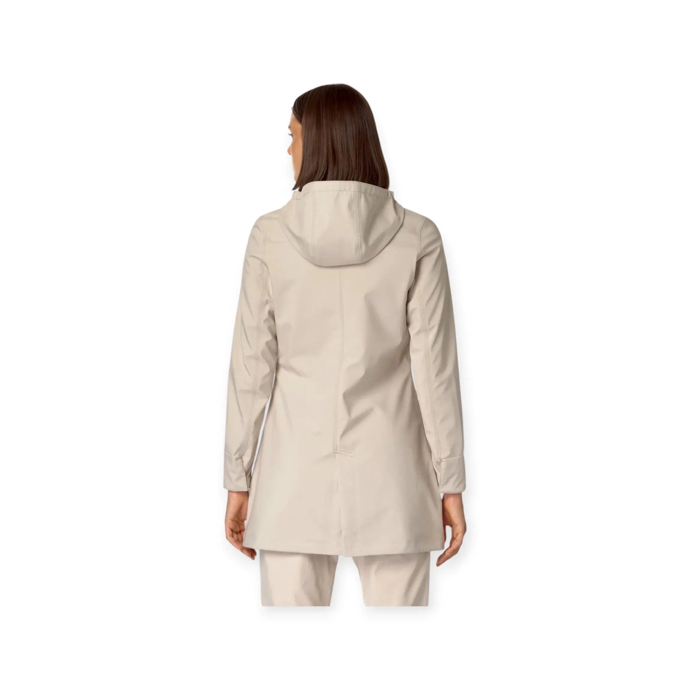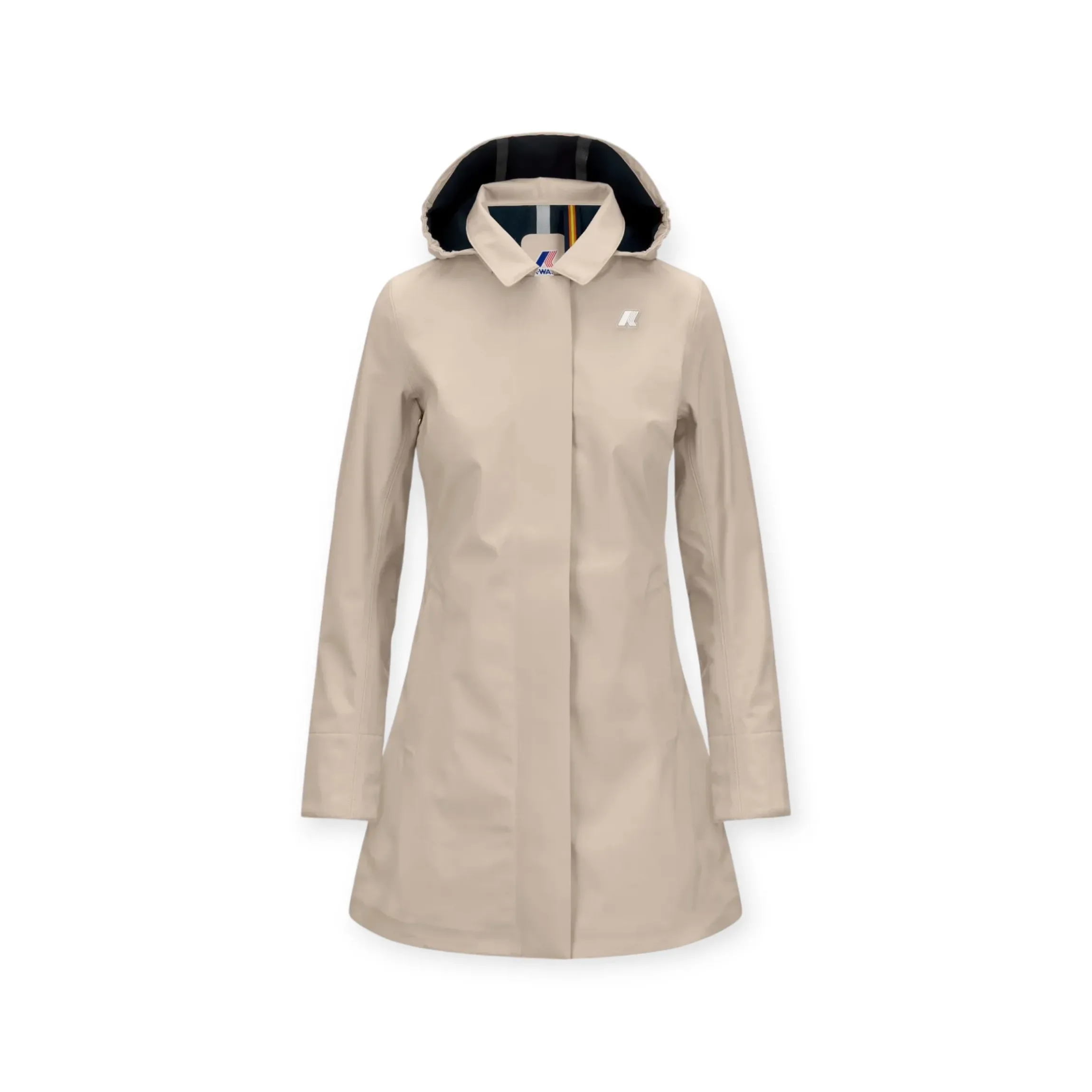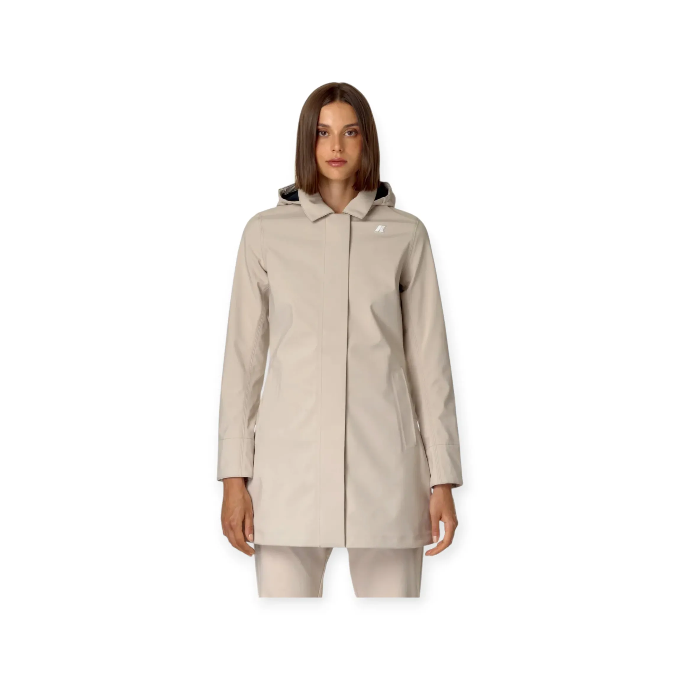 K-WAY MATHI BONDED LUNGO NEW DONNA trench fit slim con colletto e cappuccio removibile, membrana interna isolante in micro pile resistente all’ acqua e perfetto per il cambio stagione. Impermeabile, idrorepellente e antivento, logo in silicone bianco.