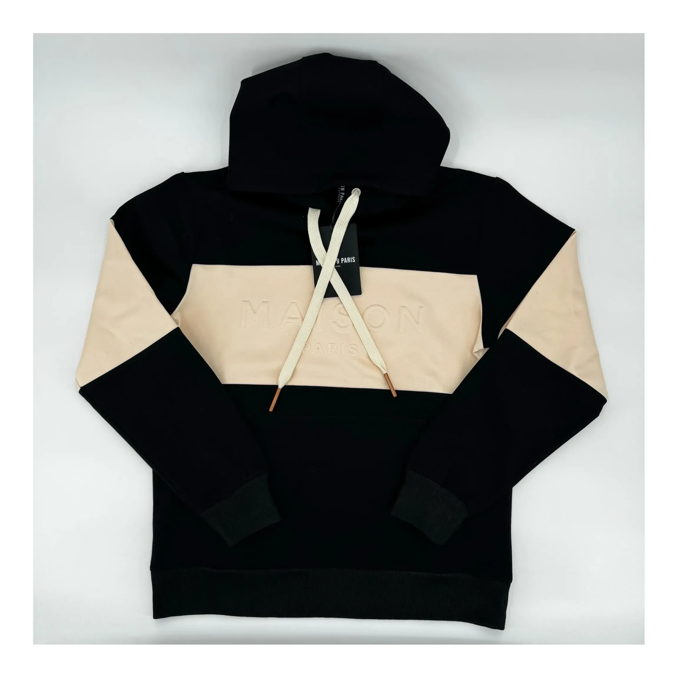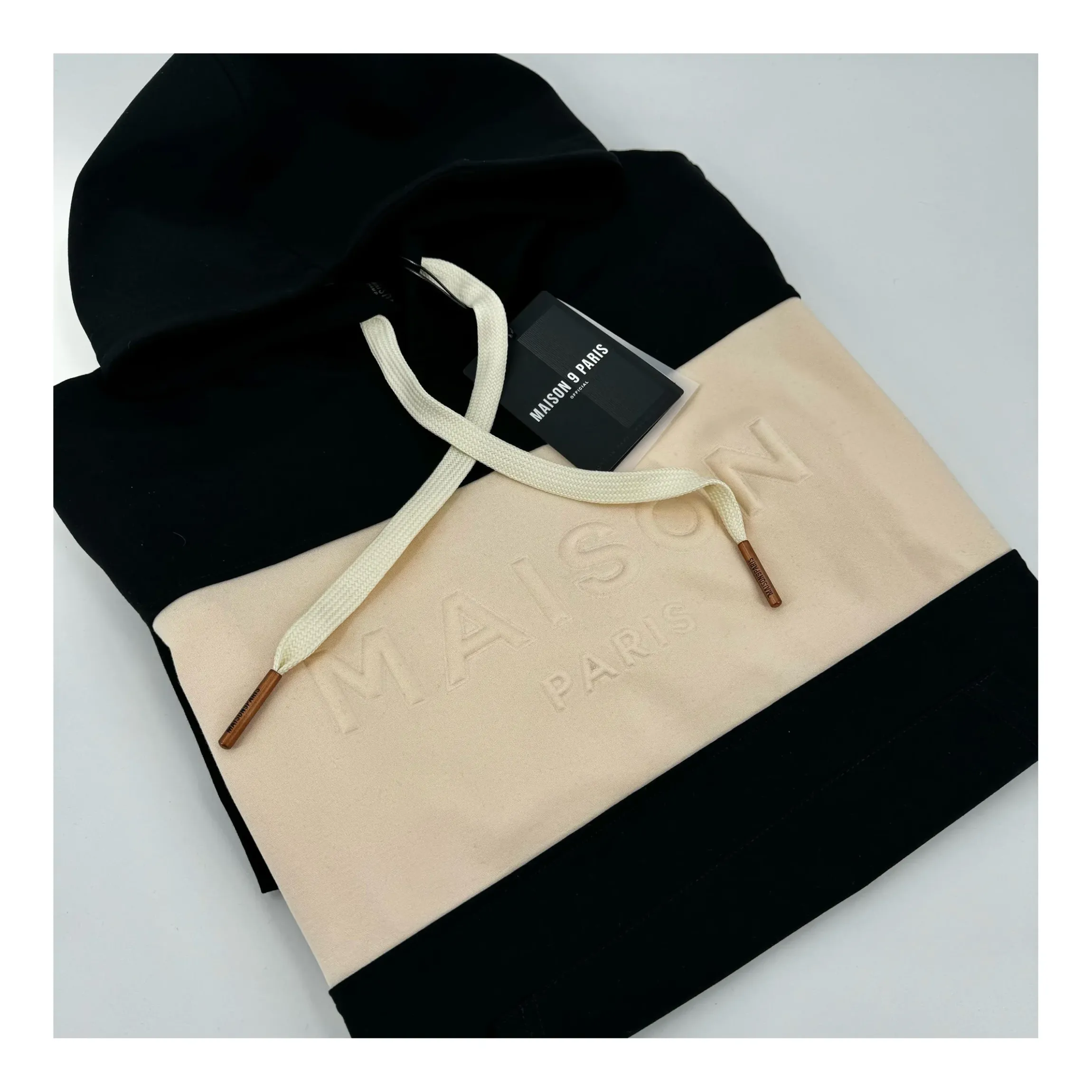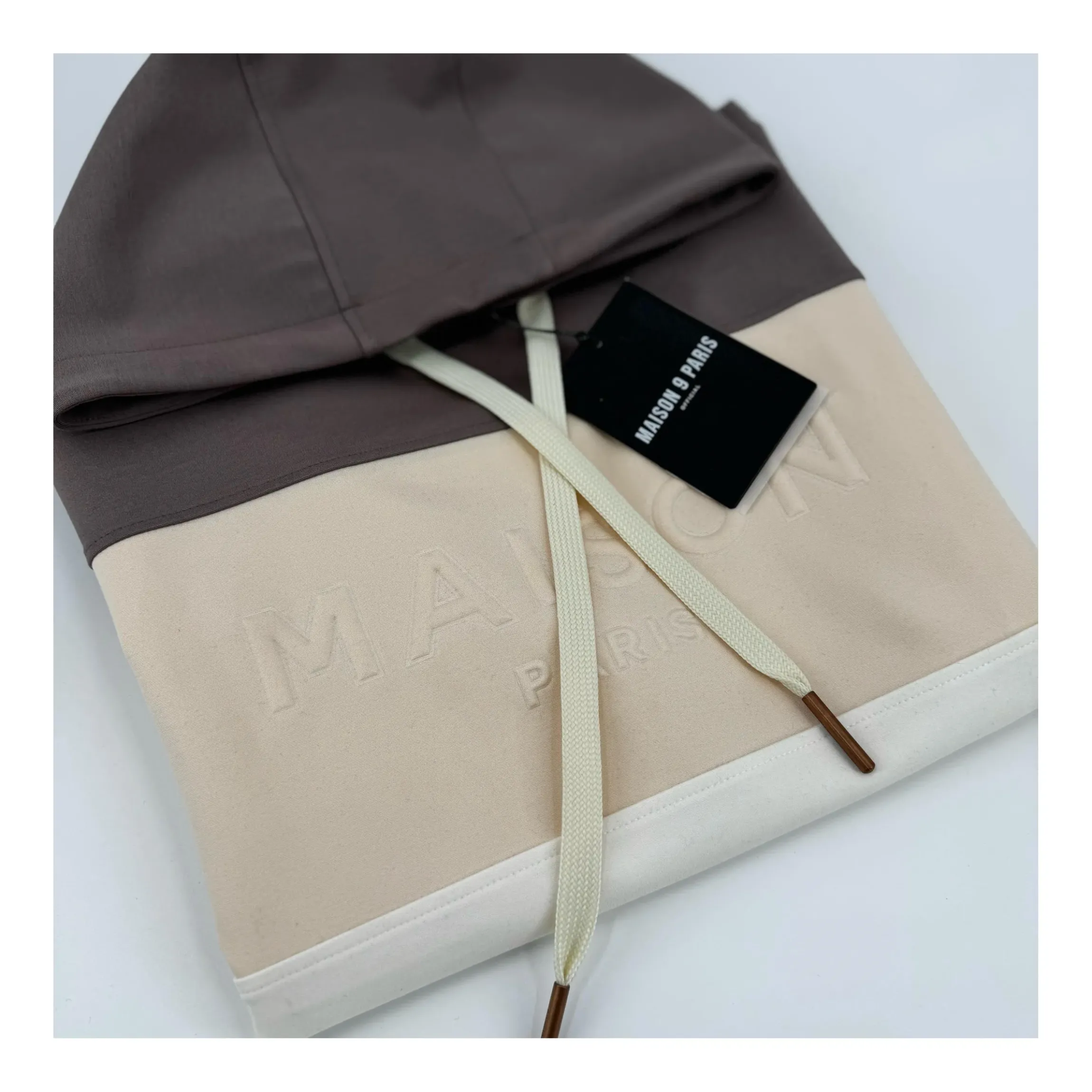 MAISON9 PARIS felpa con cappuccio uomo in 100% cotone, con fantasia a righe e cappuccio con coulisse logato bronzo. Il capo a maniche lunghe e ha la scritta logata in rilievo frontale, tasca a marsupio e polsini e fondo a costine.
