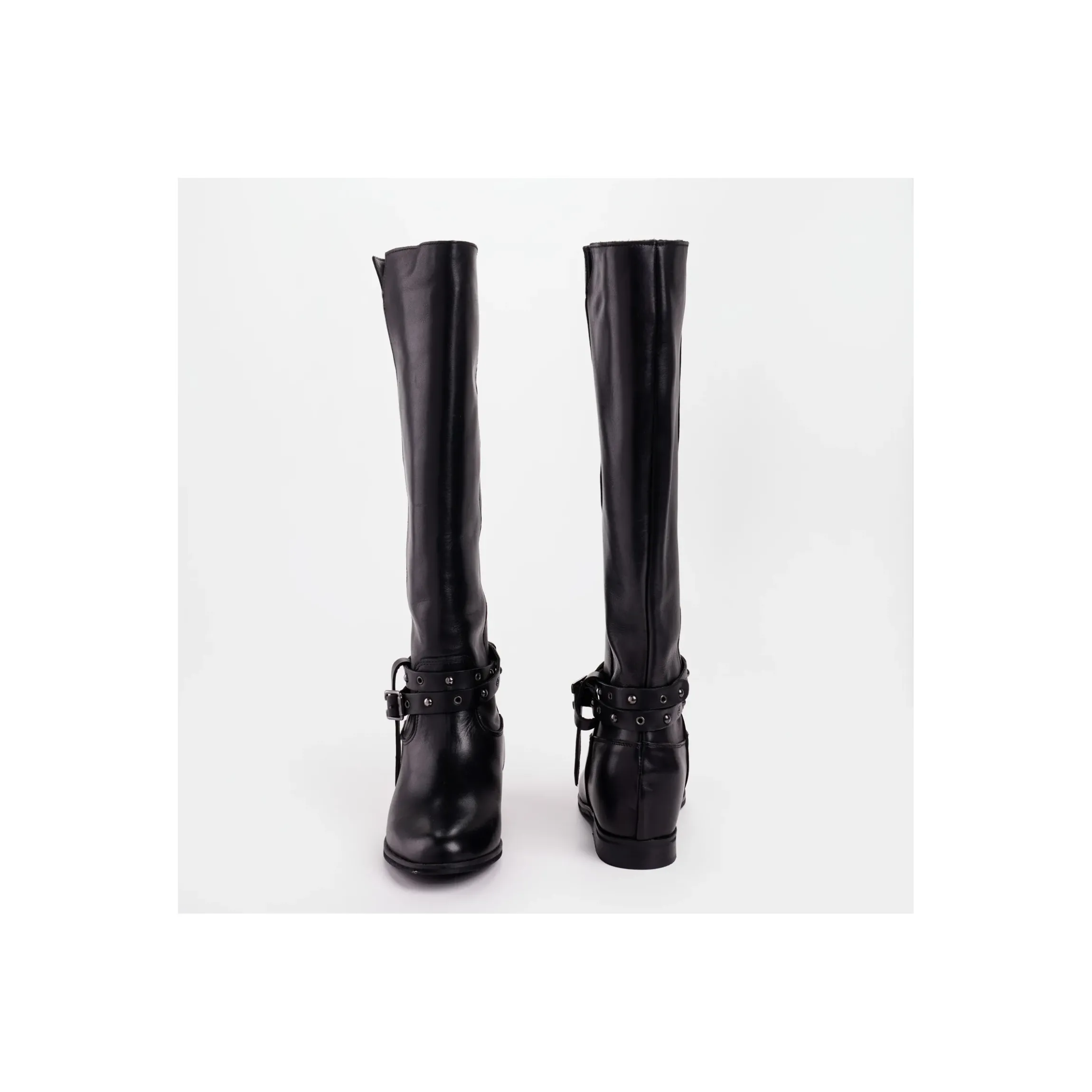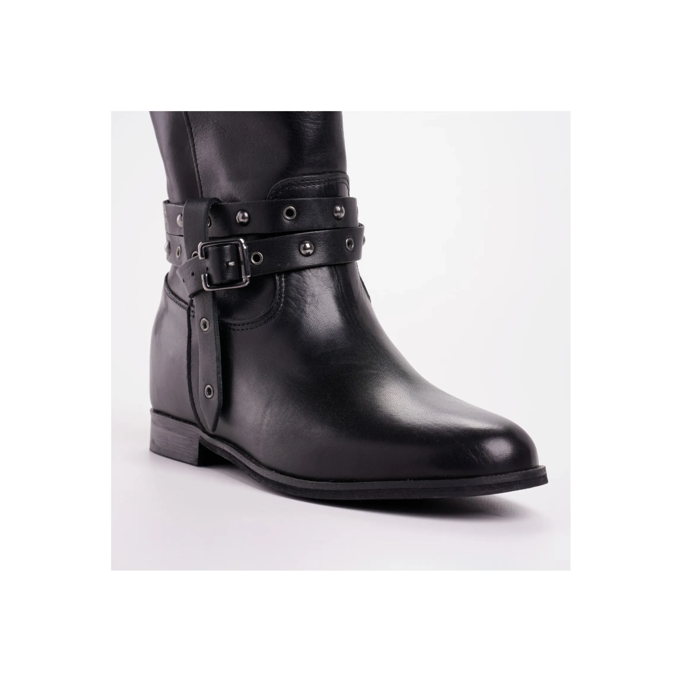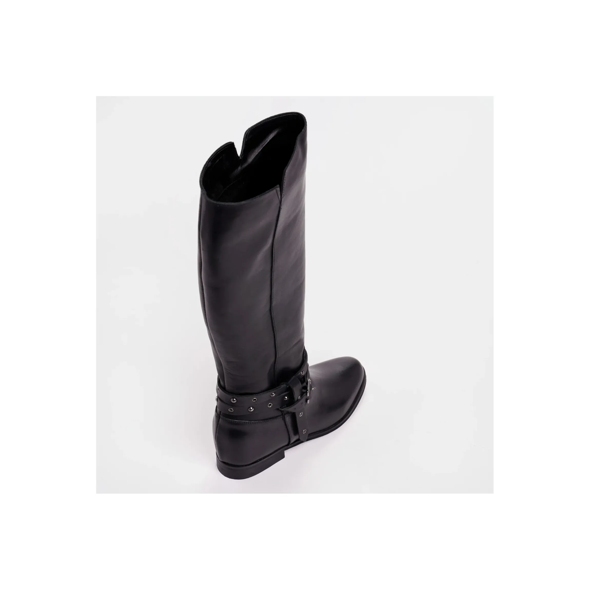 TACCO BASSO COMODISSIMO, IL PELLE DI COLRE NERO, CON DETTAGLI APLLICATO INTORNO ALLA CAVIGLIA. PELLAMI PREGIATISSIMI CHE RENDONO LA CALZATA DI QUESTO STIVALE PERFETTA PER OGNI SITUAZIONE.