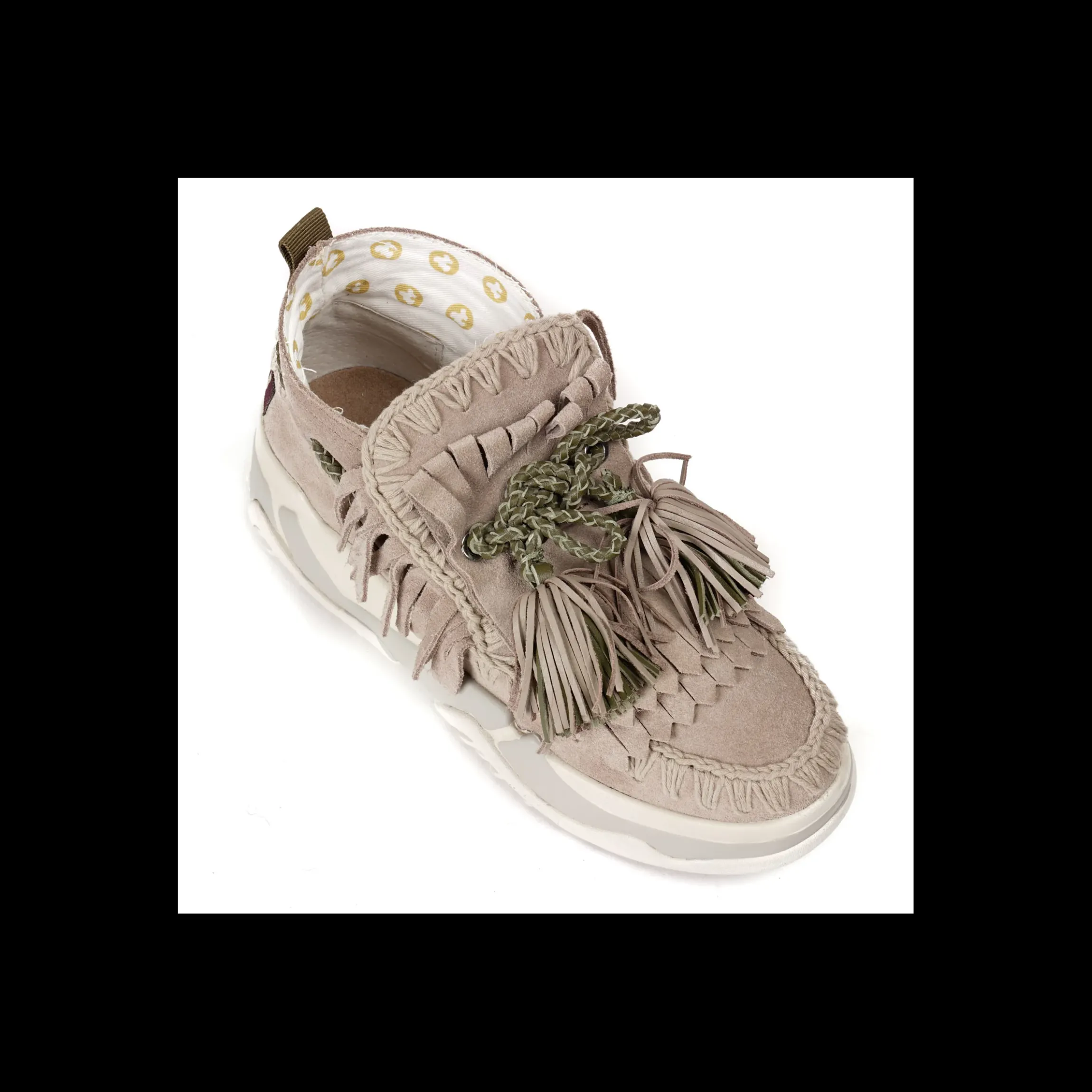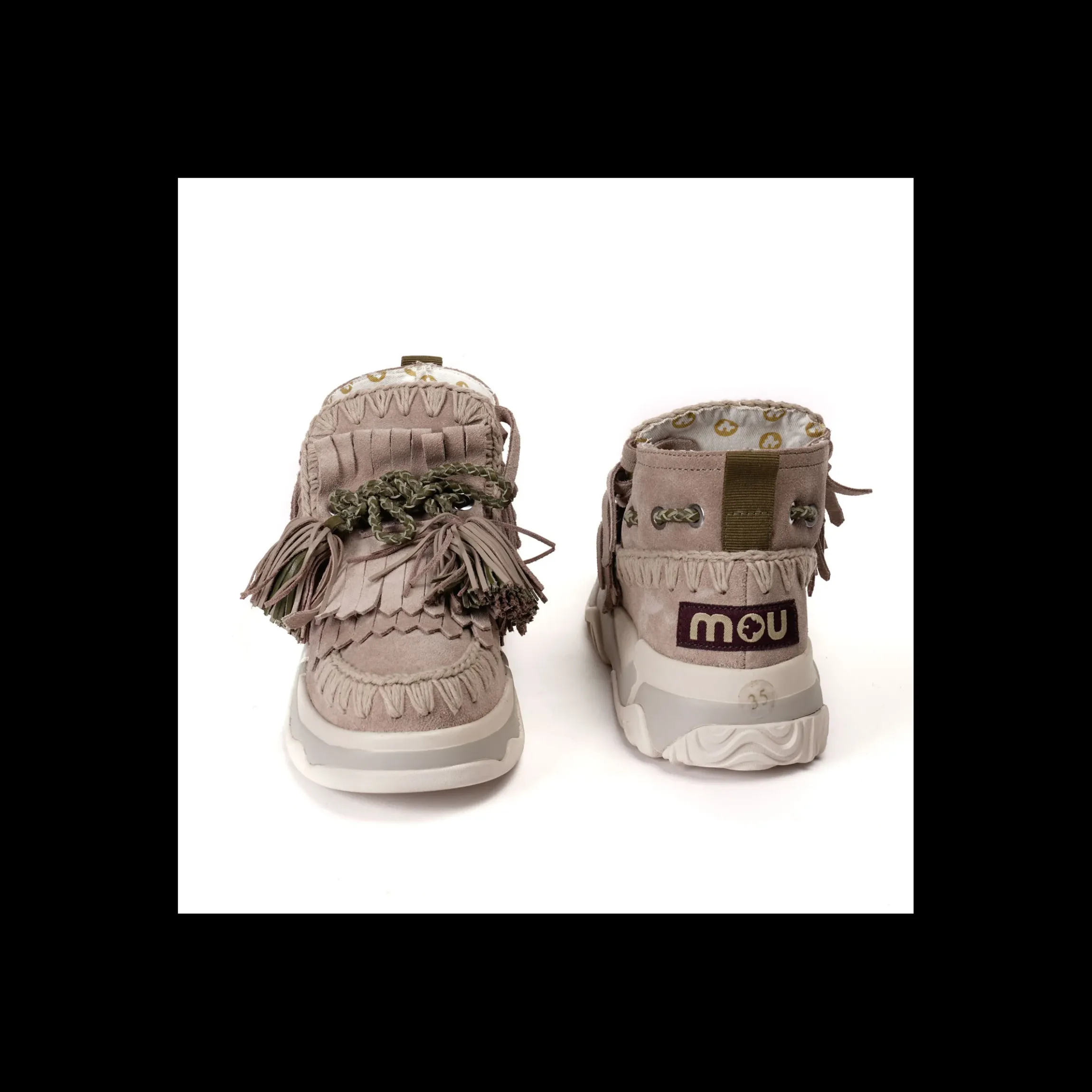 MOU ESKIMO TRAINER, BIMBA, IN CAMOSCIO CON FRANGINE. INTERNO IN TELA, PARA IN GOMMA ALTA . ICONICA CUCITURA ALL’UNCINETTO.