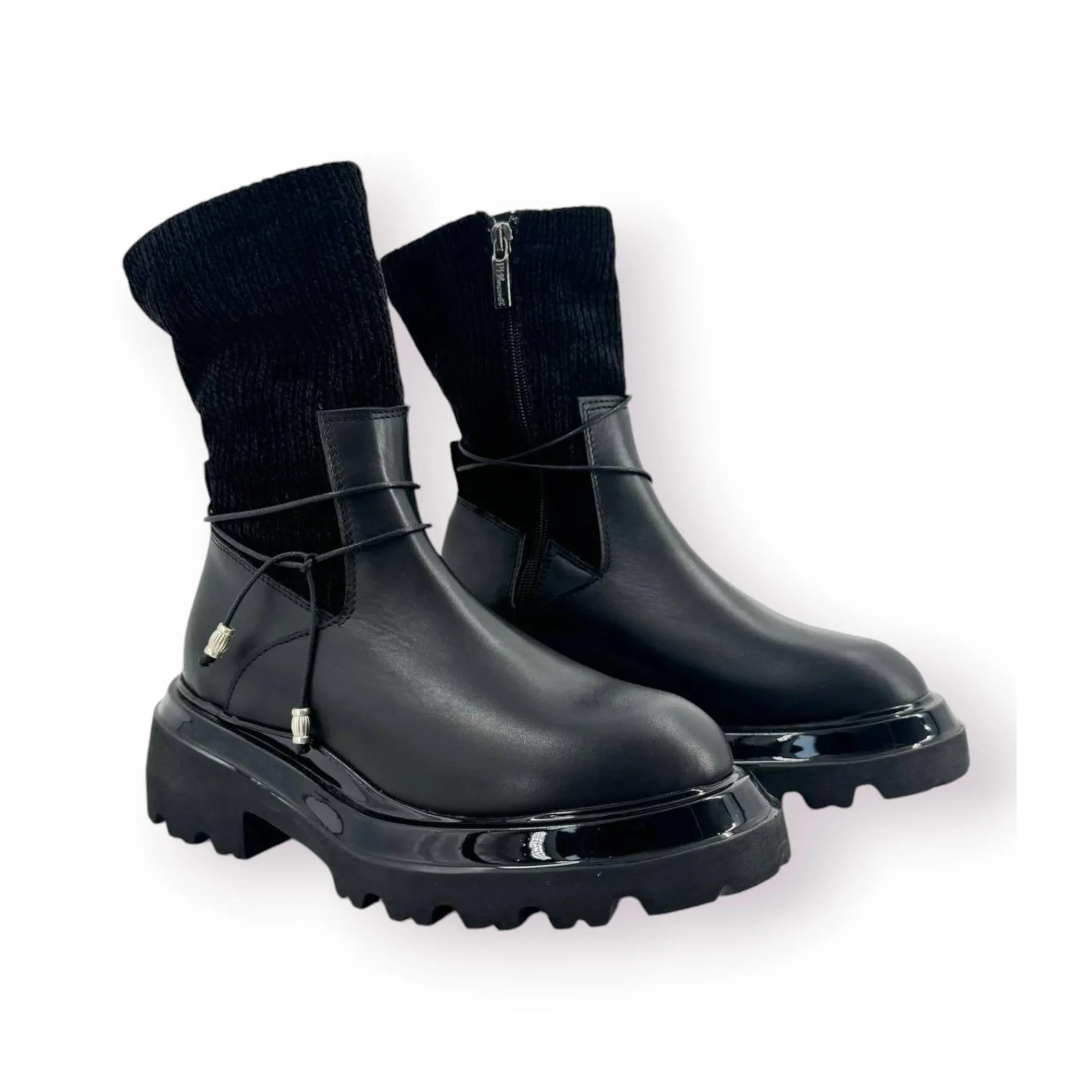 PIERFRANCESCO VINCENTI BOOT DONNA NERO IN PELLE E VELLUTO made in Italy, si presenta con tomaia in pelle, con struttura calzino in velluto nella parte superiore. Chiusura con zip laterale interna, suola in gomma con inserti in vernice e para carrarmato.