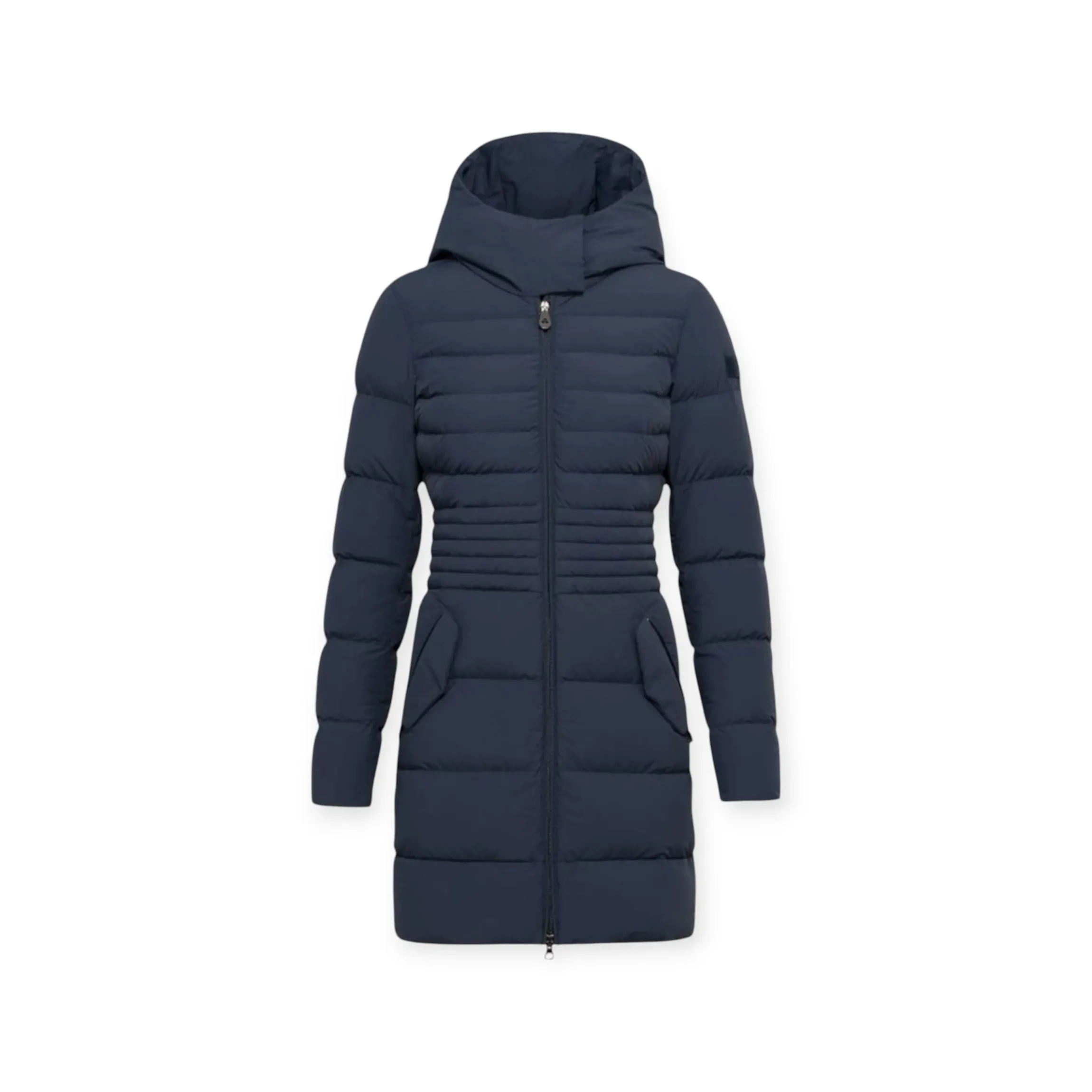 Piumino lungo donna PEUTEREY con cappuccio, in tessuto trapuntato e imbottitura in piuma. Chiusura centrale con zip, tasche con doppia chiusura zip e bottoni, affiancato in vita. Disponibile nel colore blu