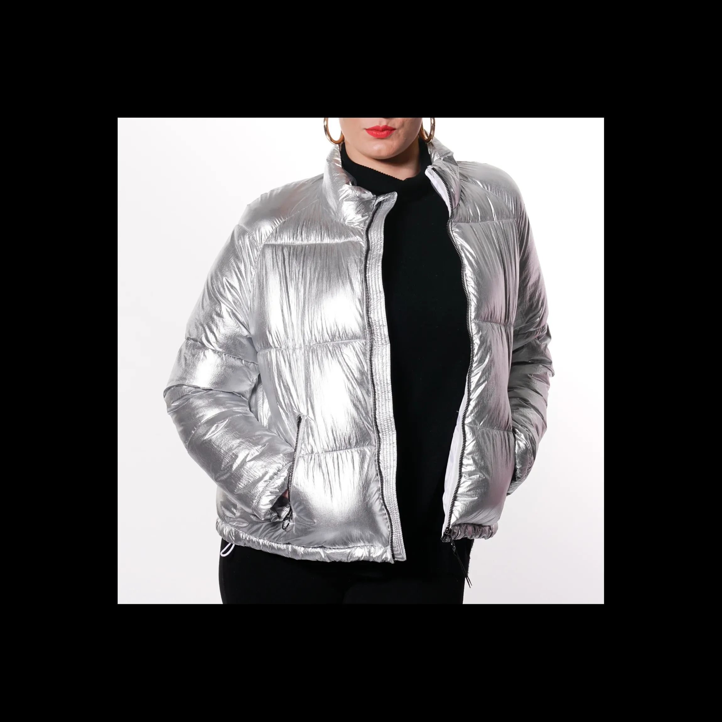 Piumino F**K donna colore argento, collo a ciambellina, taglio a trapezio, zip centrale metallica con maxi occhiello cromato colore argento, doppia coulisse laterale regolabile, logo plastico laterale 3D
