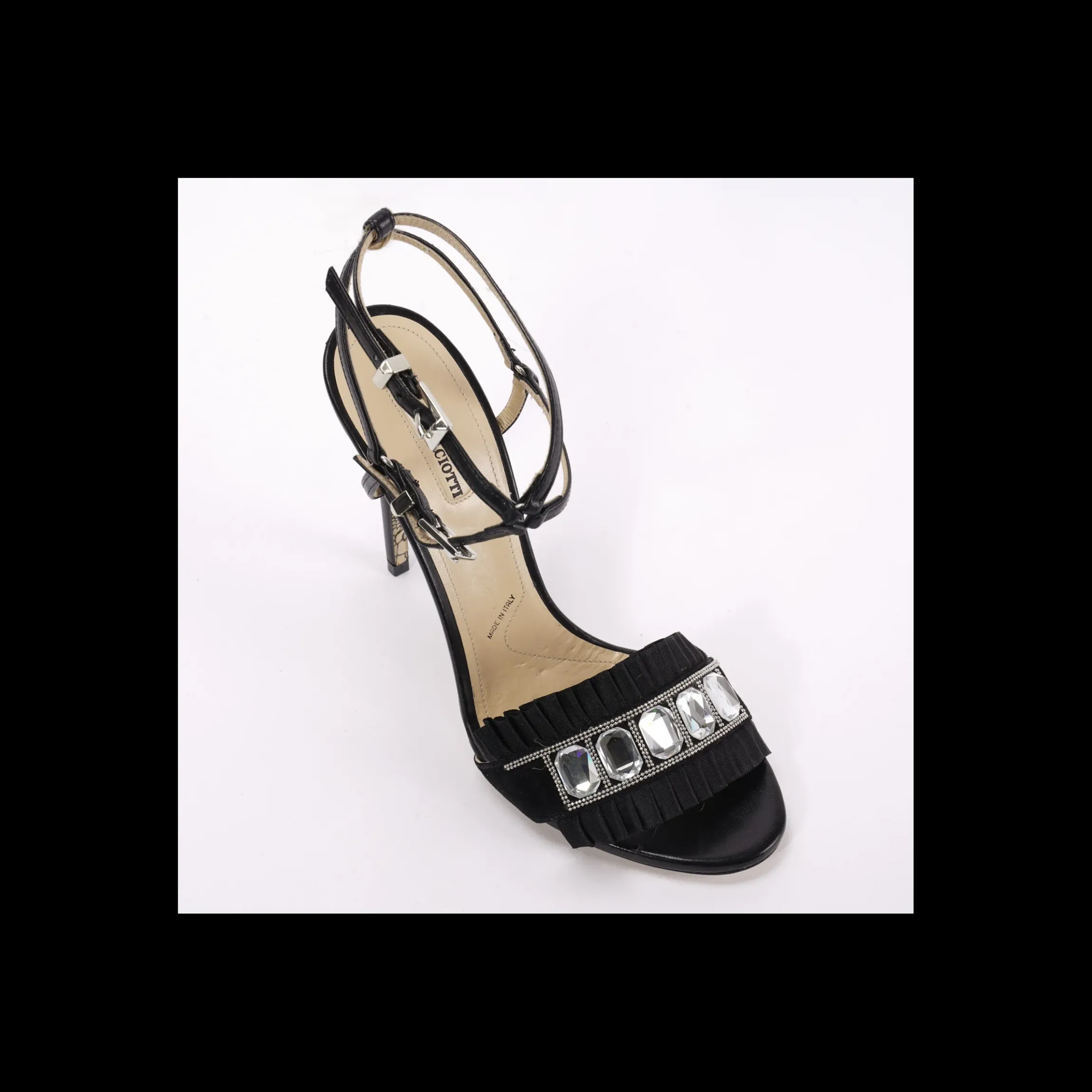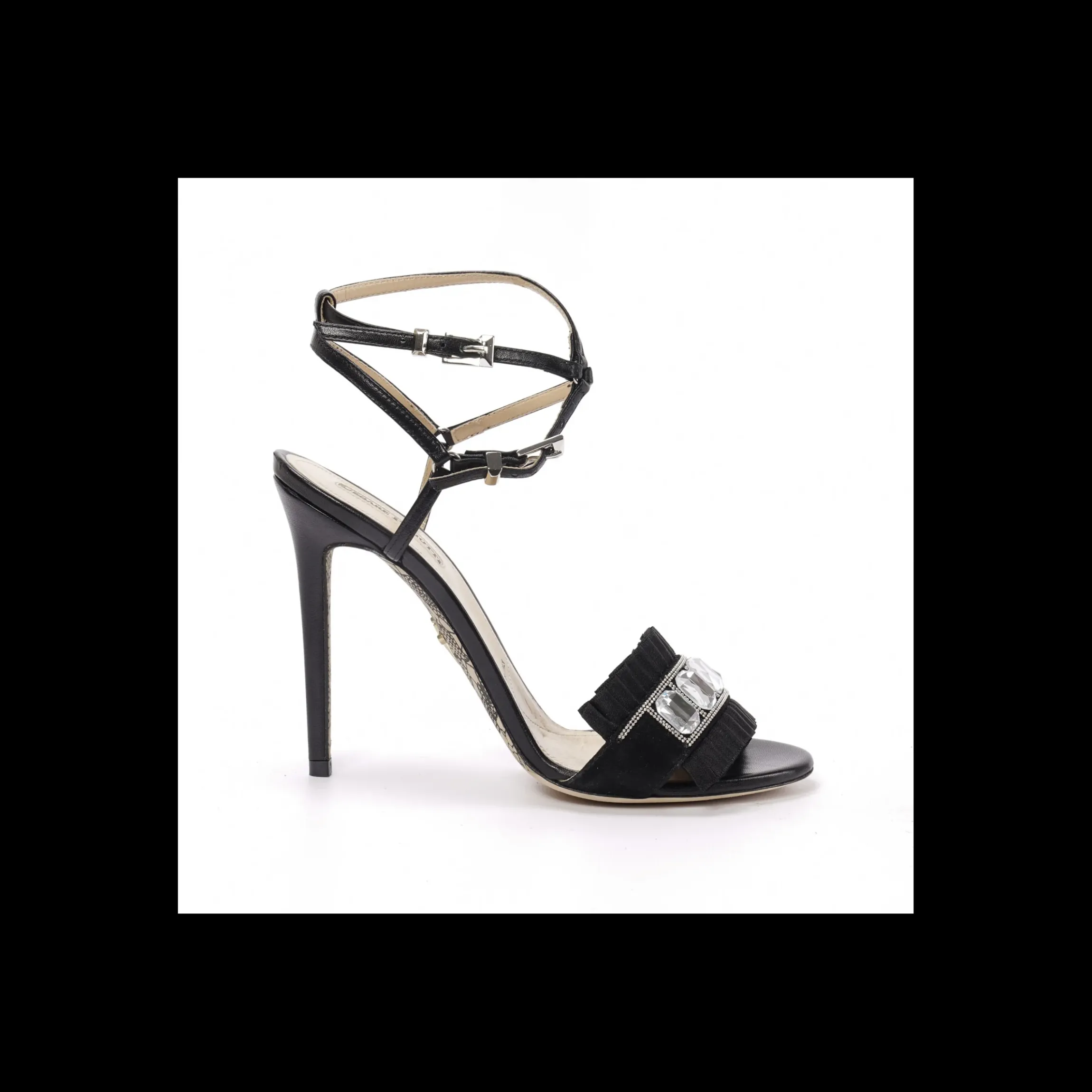 SANDALO CESARE PACIOTTI, CON FASCETTE IN PELLE INCROCIATE, E FASCIA IN CAMOSCIO CON DETTAGLIO GIOIELLO COLOR ARGENTO.