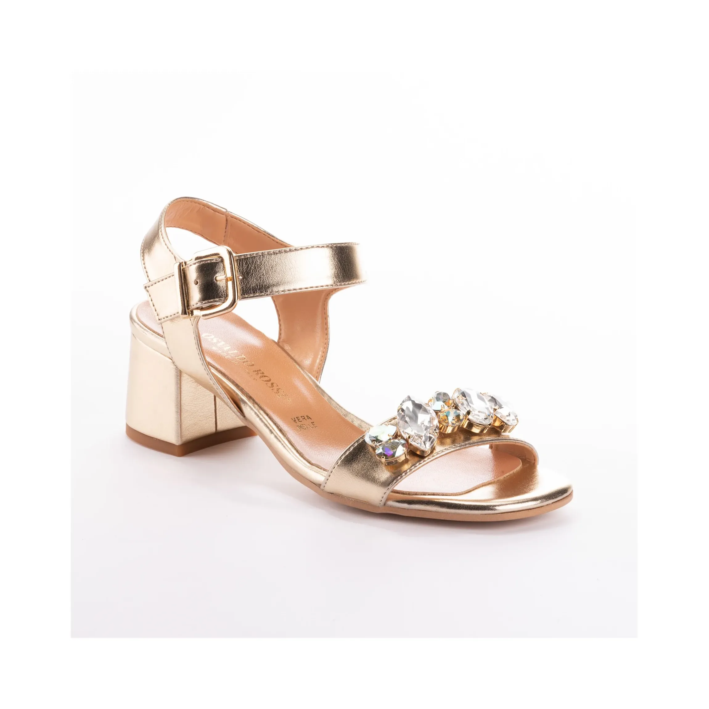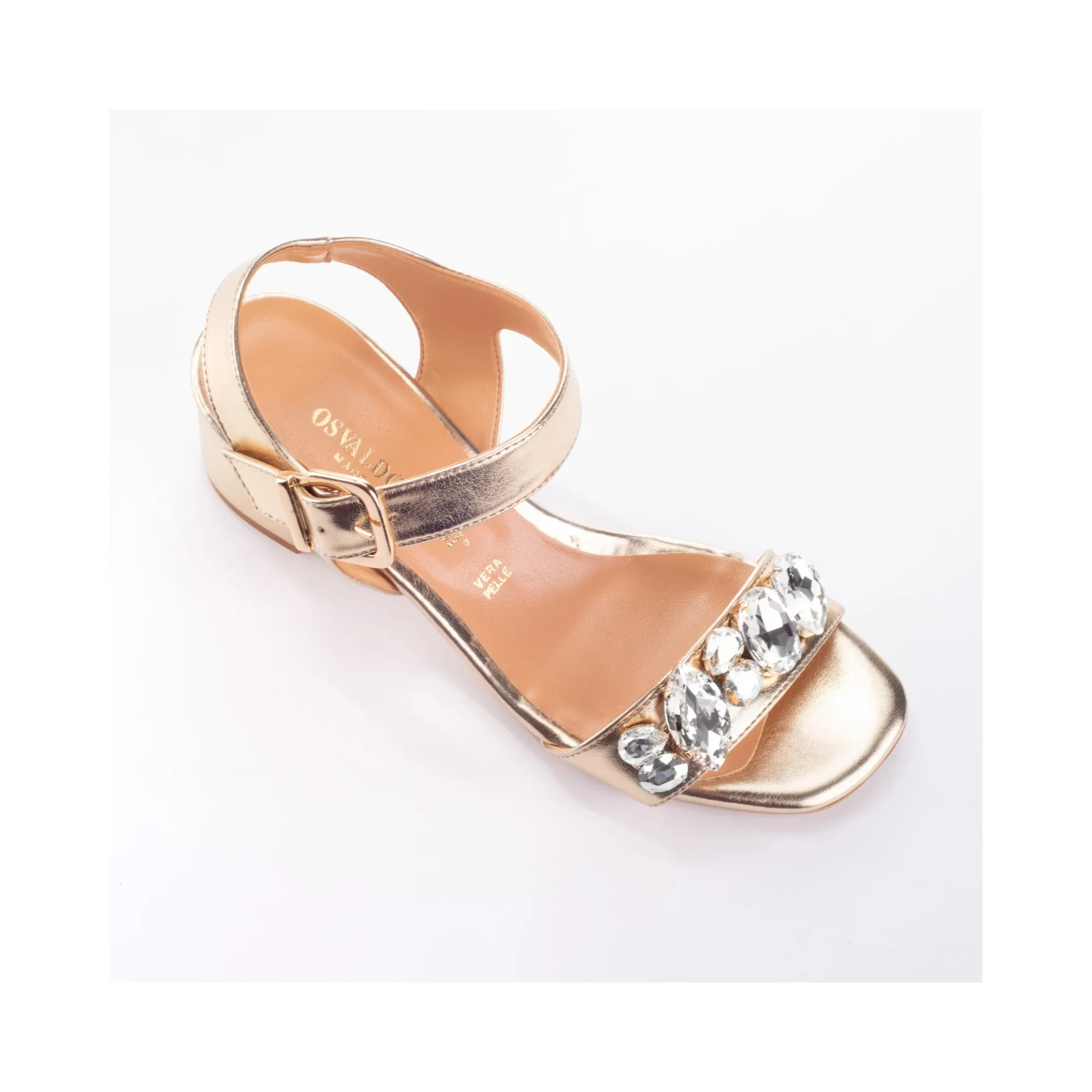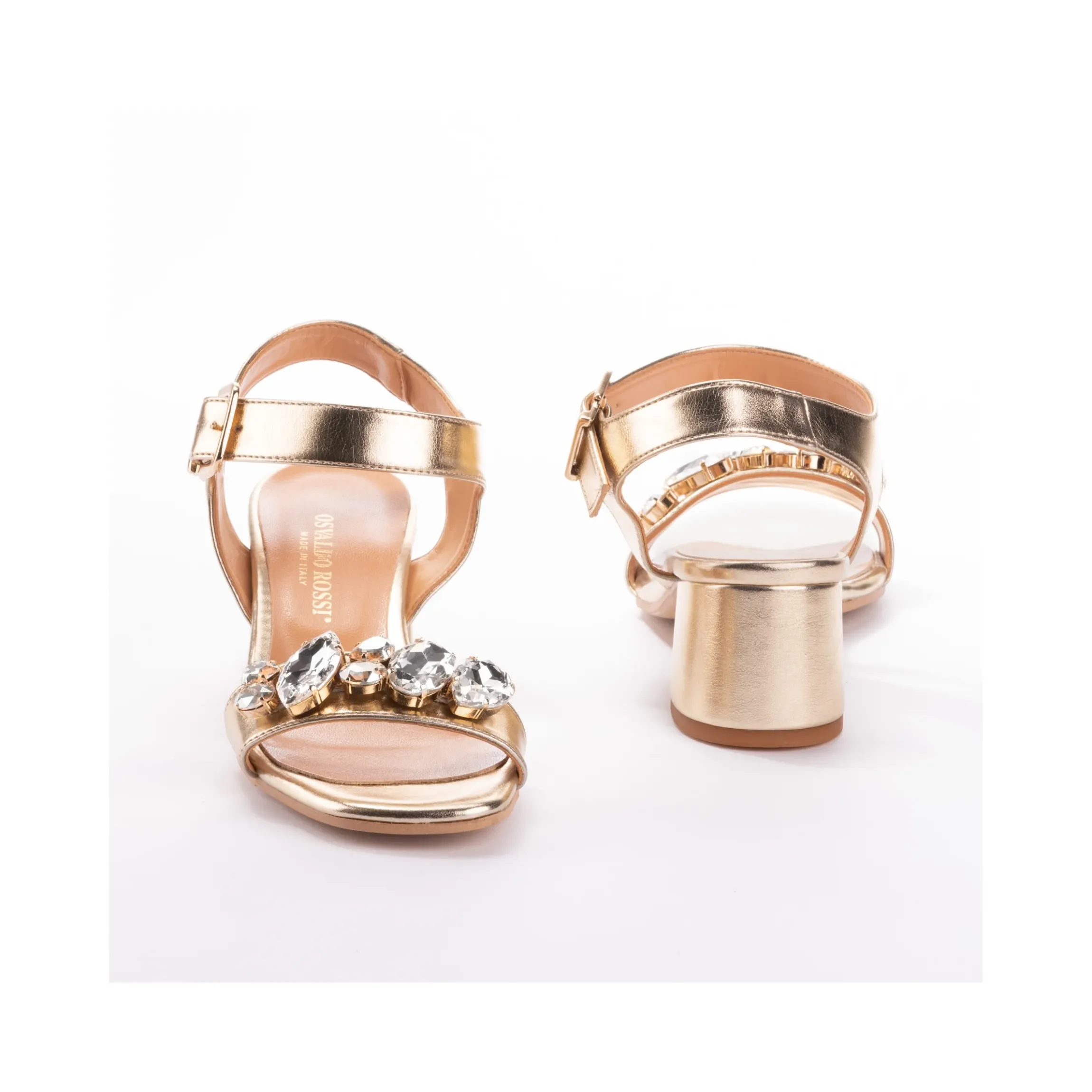 Sandalo Osvaldo Rossi Made in Italy, in pelle color platino. Cinturino con fibbia e dettaglio gioiello. Tacco a blocco di 5,5 cm.