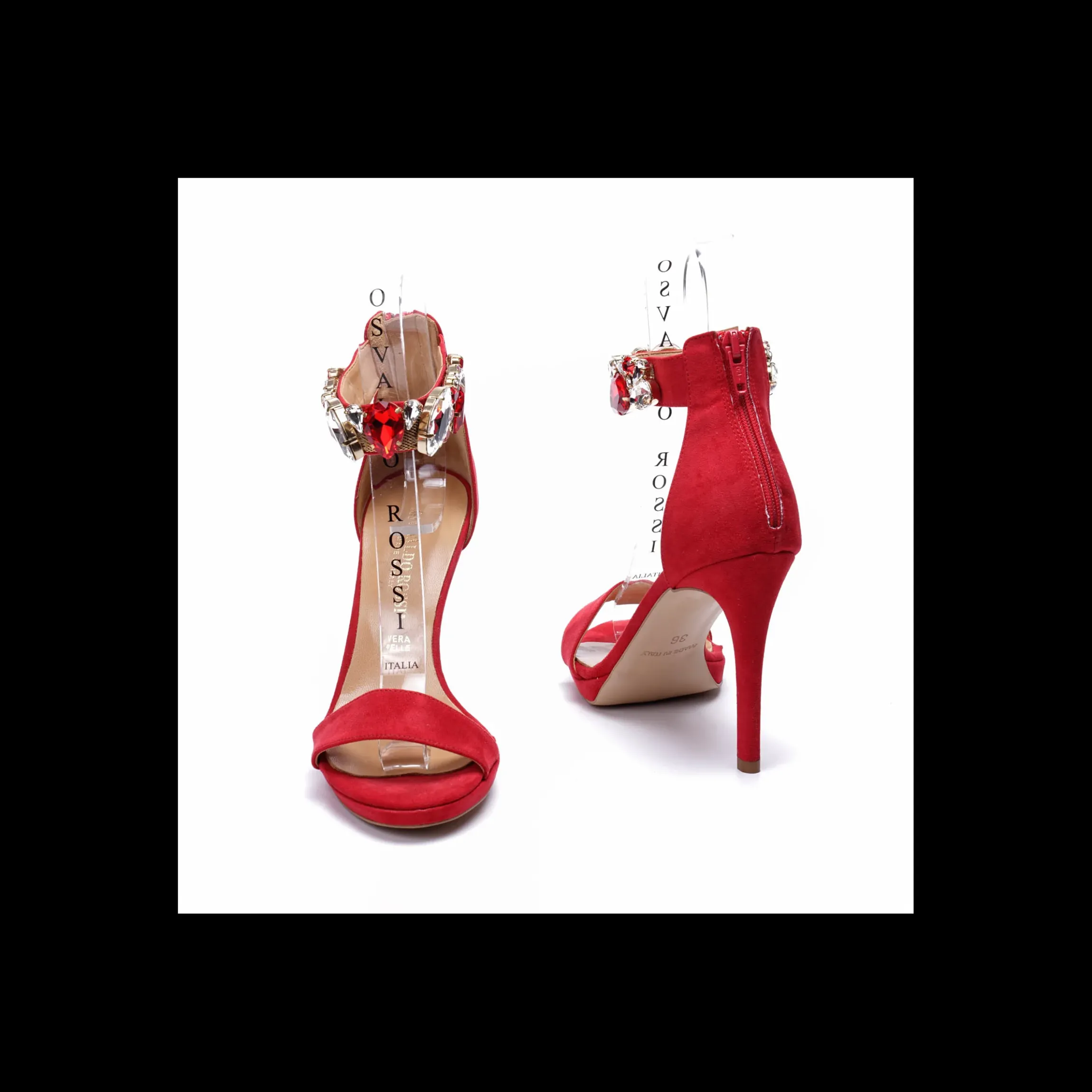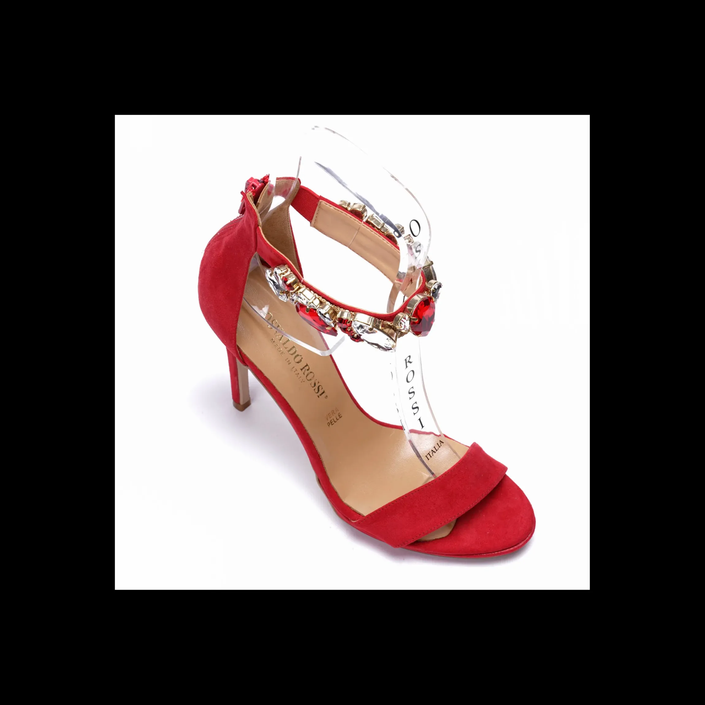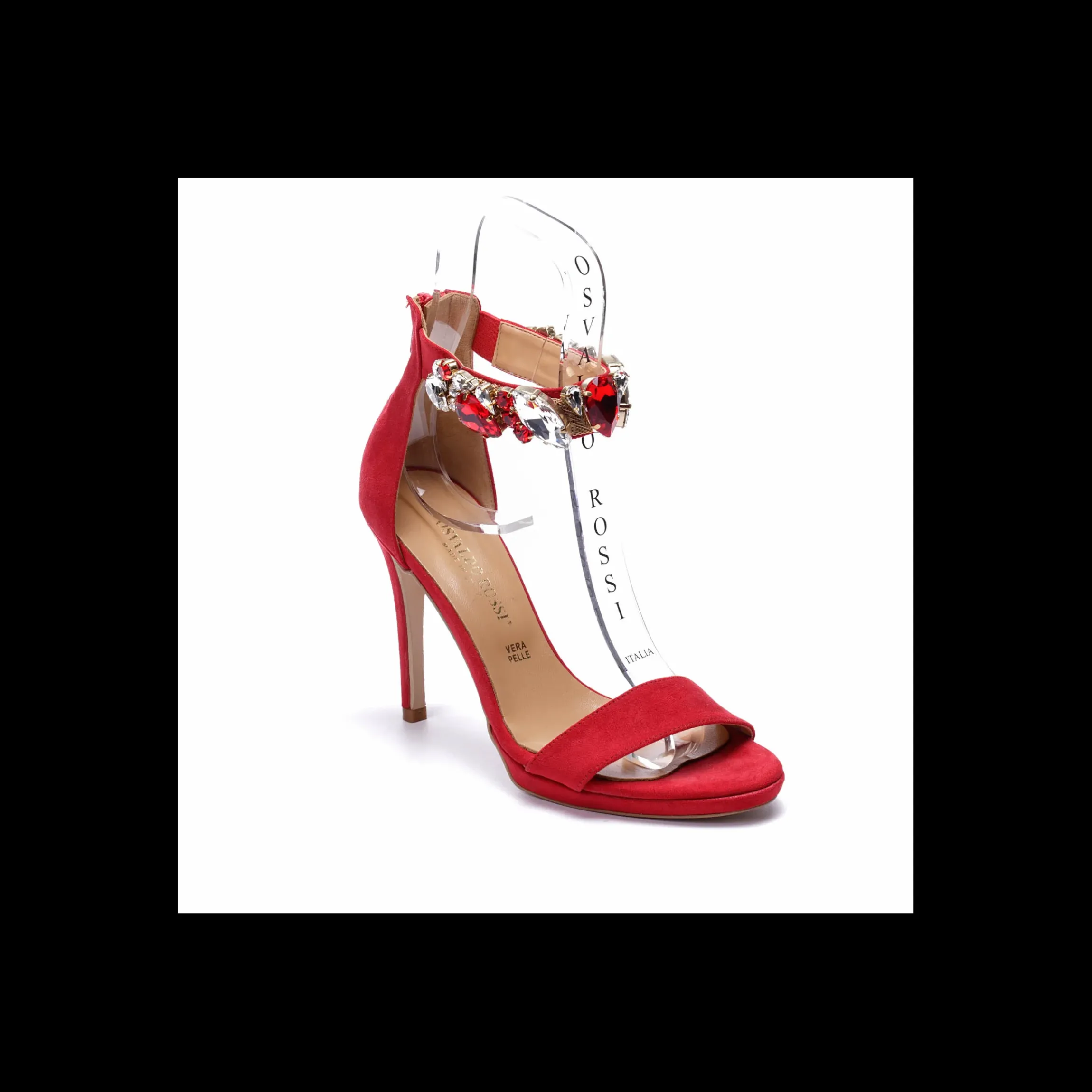 Sandalo Osvaldo ROssi, in camoscio , tacco a spillo cm 10 e piccolo plateaux di cm 1.Dettaglio maxy gioiello in caviglia.