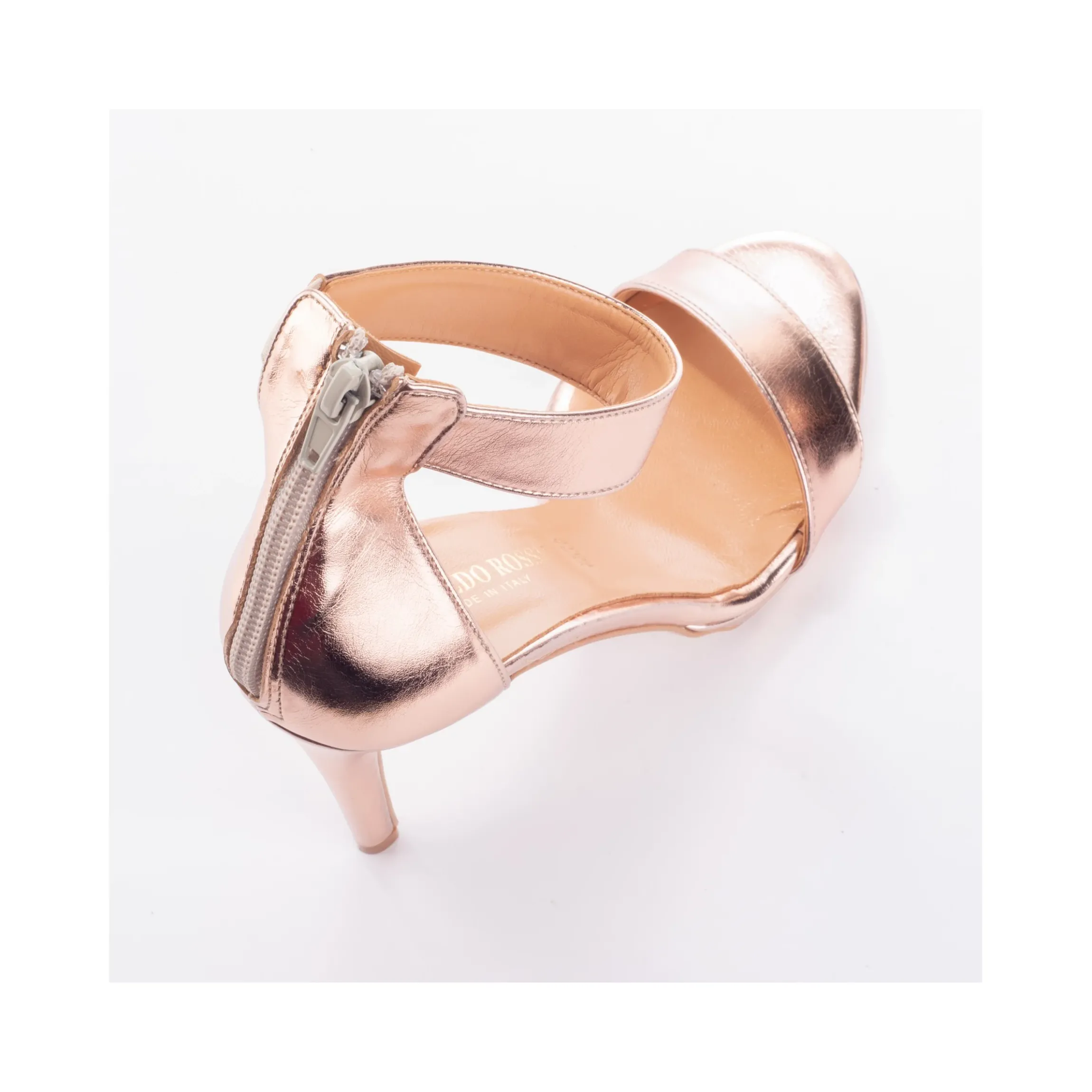 Sandalo Osvaldo Rossi Made in Italy, in pelle color gold rose. Cinturino in caviglia. Tacco a spillo di 10 cm e piccolo plateaux di cm 2.