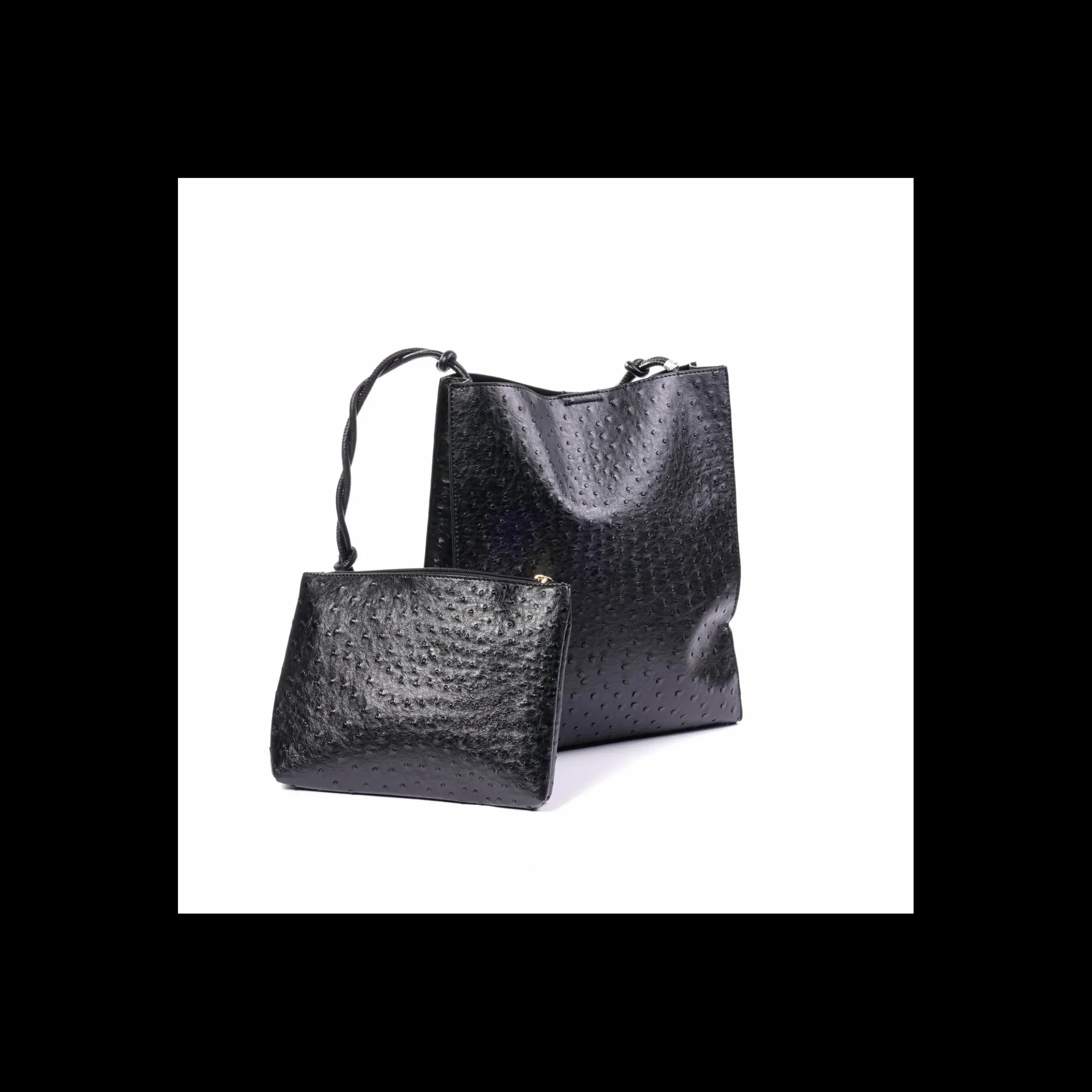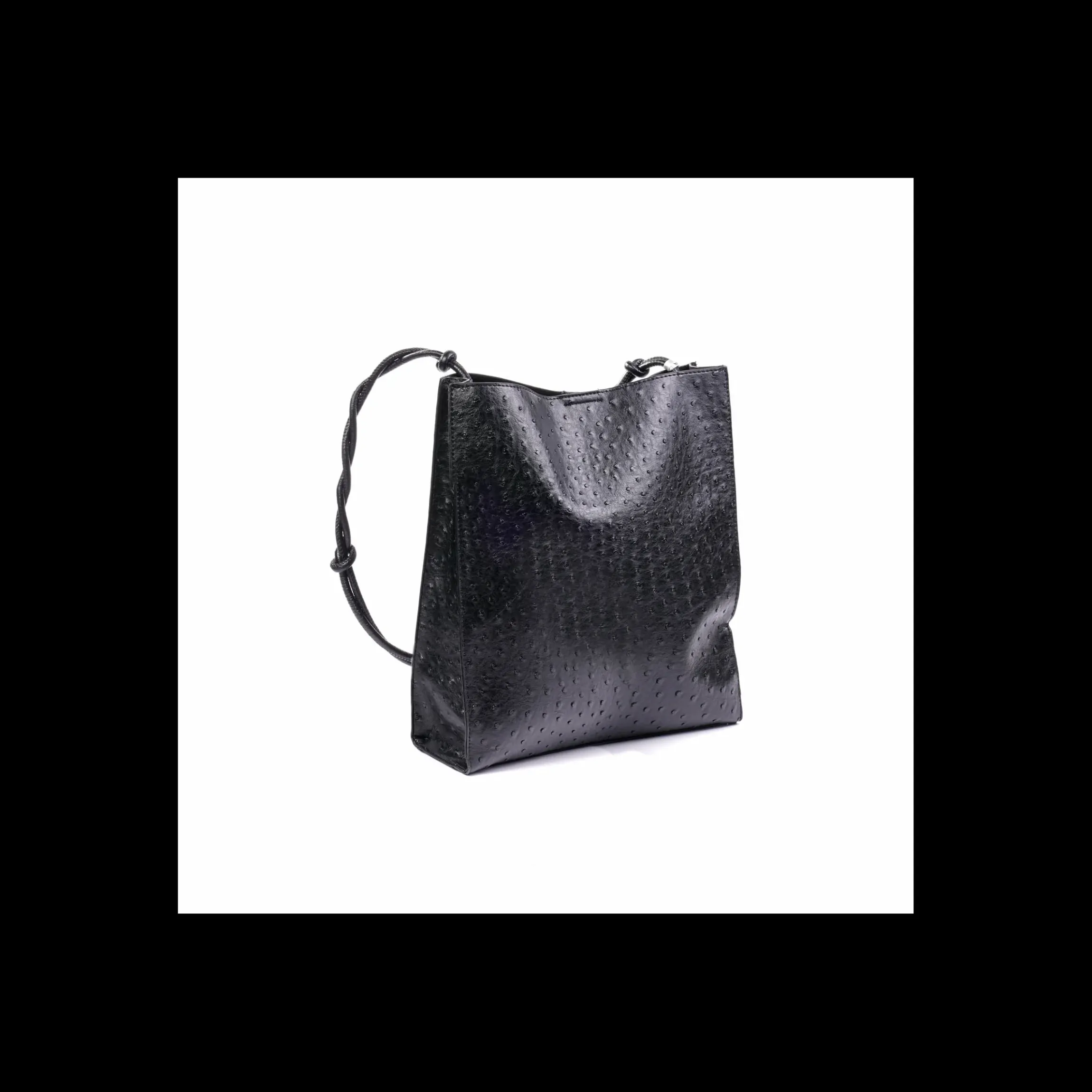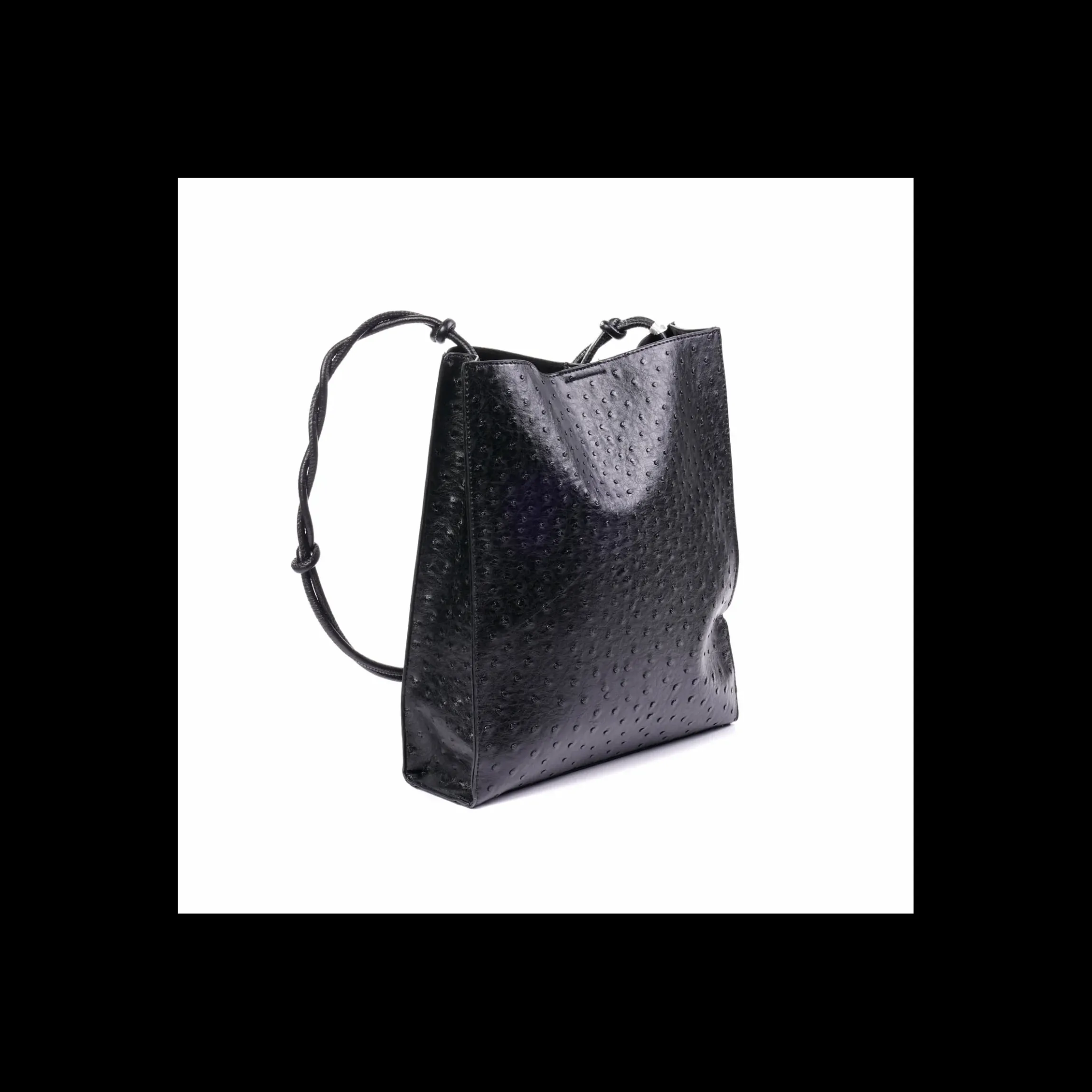 SHOPPER MADE IN ITALY in eco-pelle stampa struzzo colore nero , manico lungo intrecciato e annodato, pochette abbinata estraibile, tasca interna ampia con taschino multi funzione