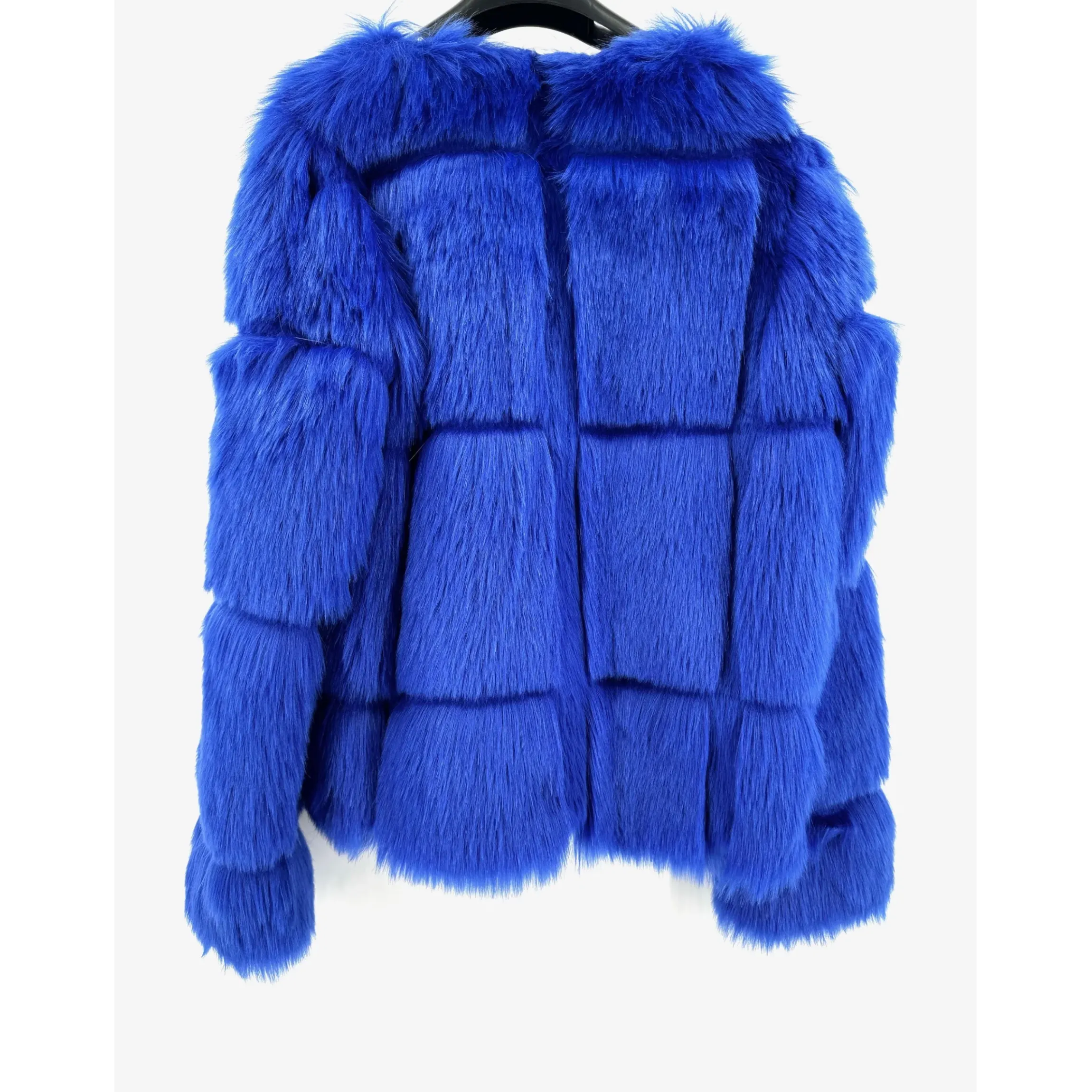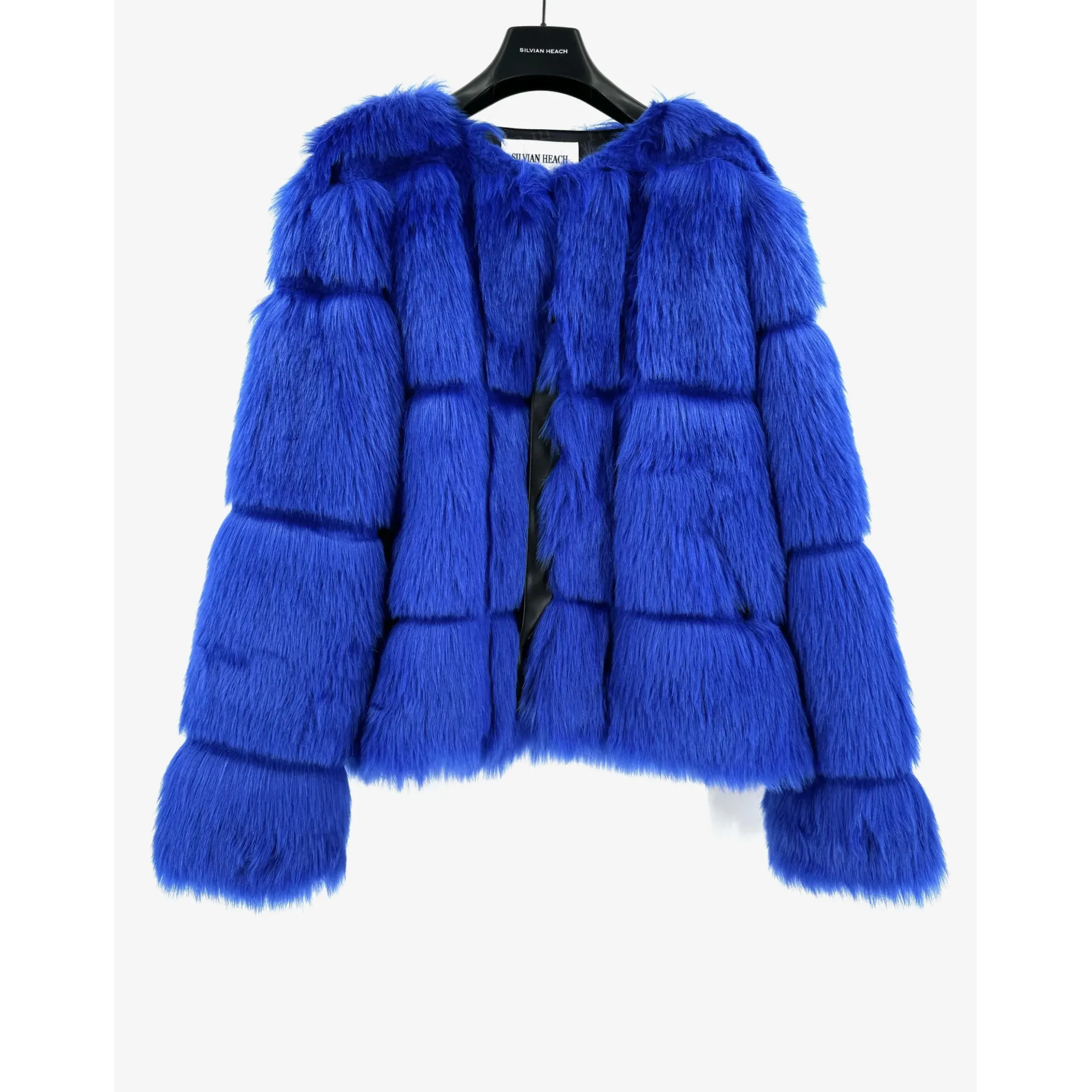 SILVIAN HEACH eco pelliccia corta di colore blu elettrico, con scollo tondo e manica lunga. Tasche verticali a scomparsa con profili in similpelle a contrasto, la chiusura è con i ganci.