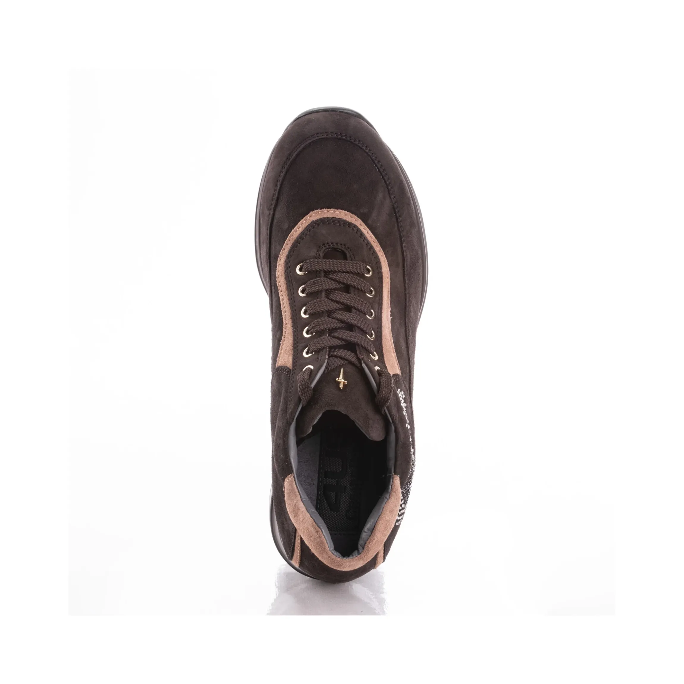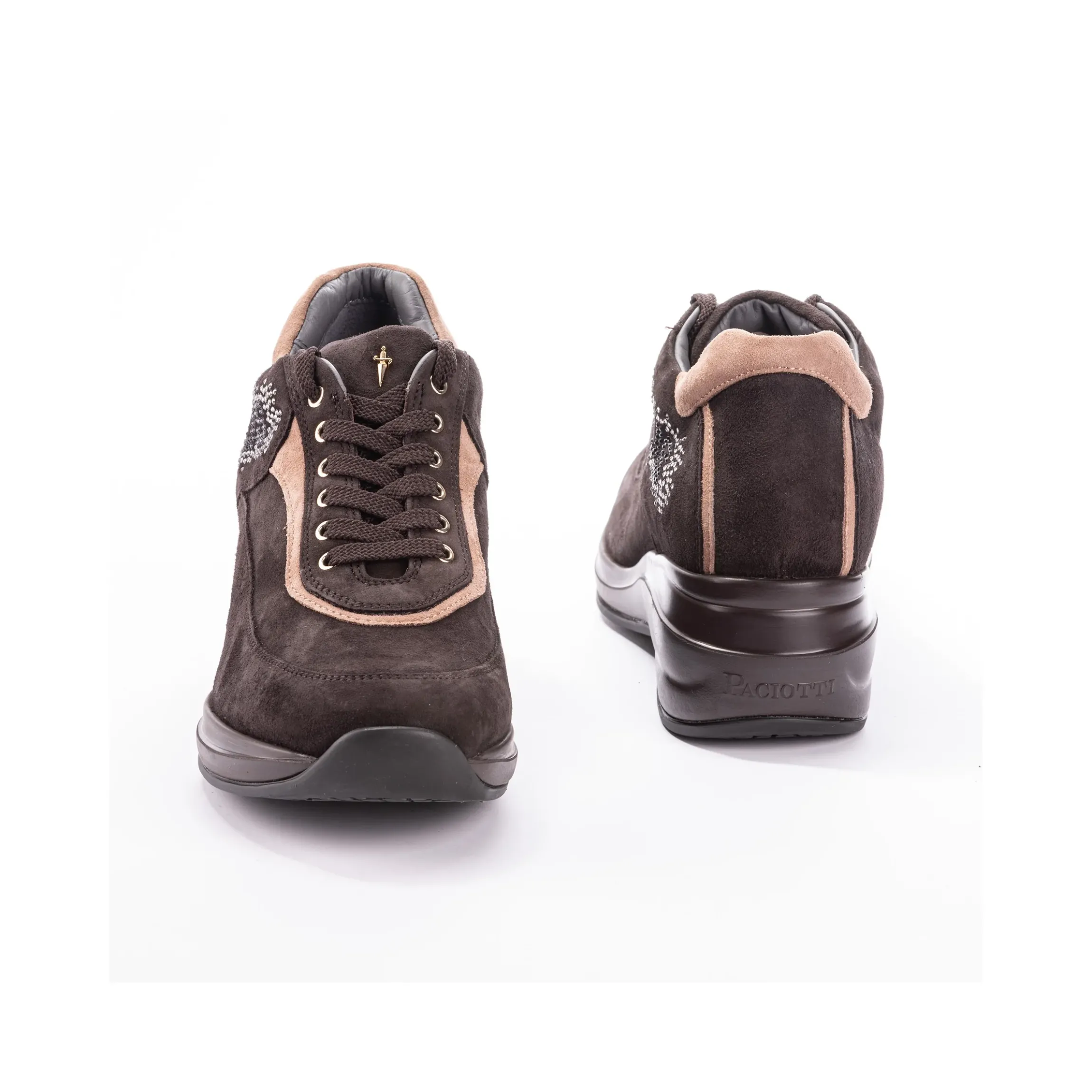 Sneakers Cesare Paciotti 4us in morbido camoscio marrone e dettagli beige, logo laterale di strass argentati, pugnale identificativo presente sulla linguetta in metallo, chiusura classica stringata, interno in pelle incluso di sottopiede estraibile, tutto su una suola molto comoda con zeppa di 4,5 cm in gomma.