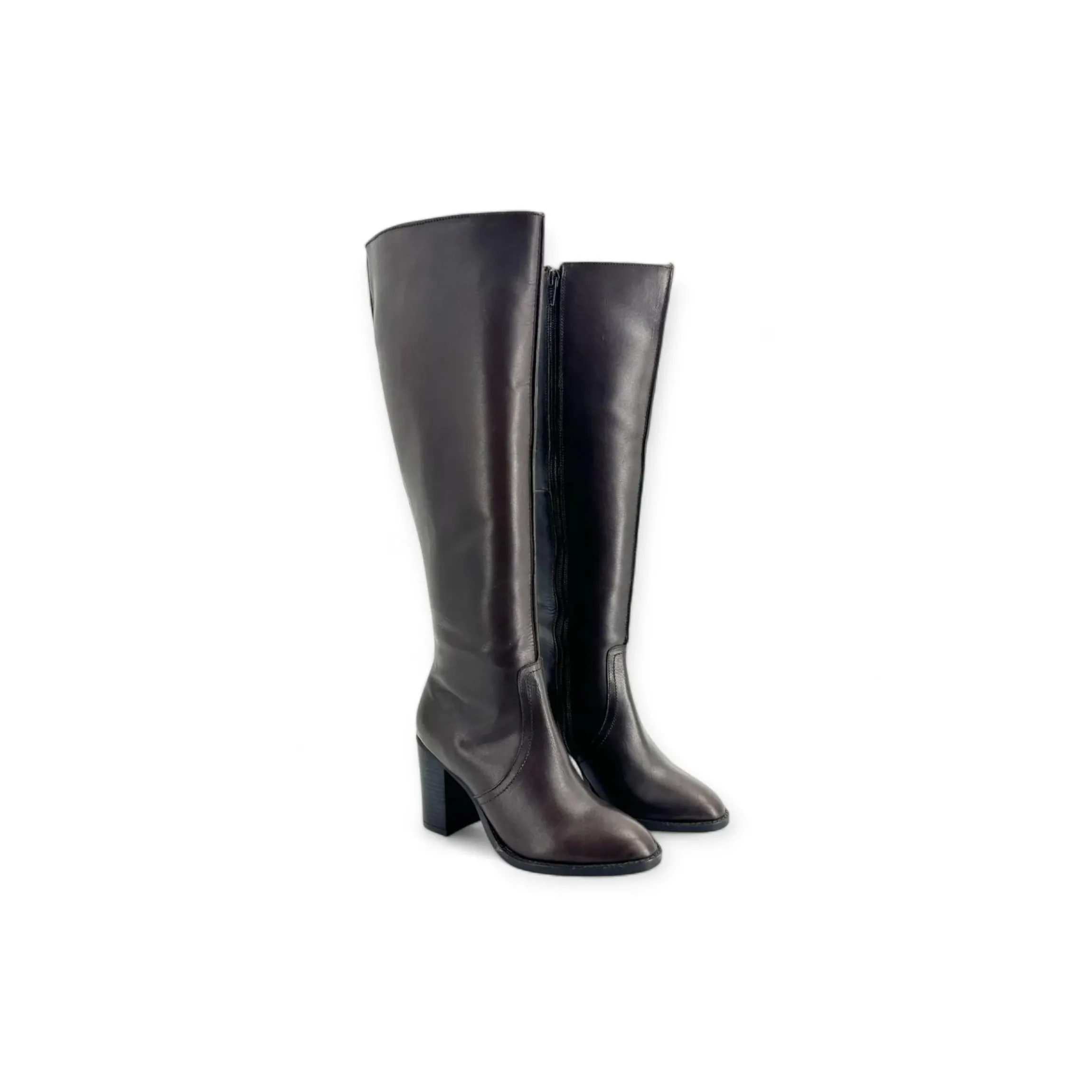 STIVALE DONNA IN PELLE CON CHIUSURA ZIP MILU’ MILANO di colore marrone, alti al ginocchio, con tacco grosso quadrato alto 8 cm e fondo gomma.