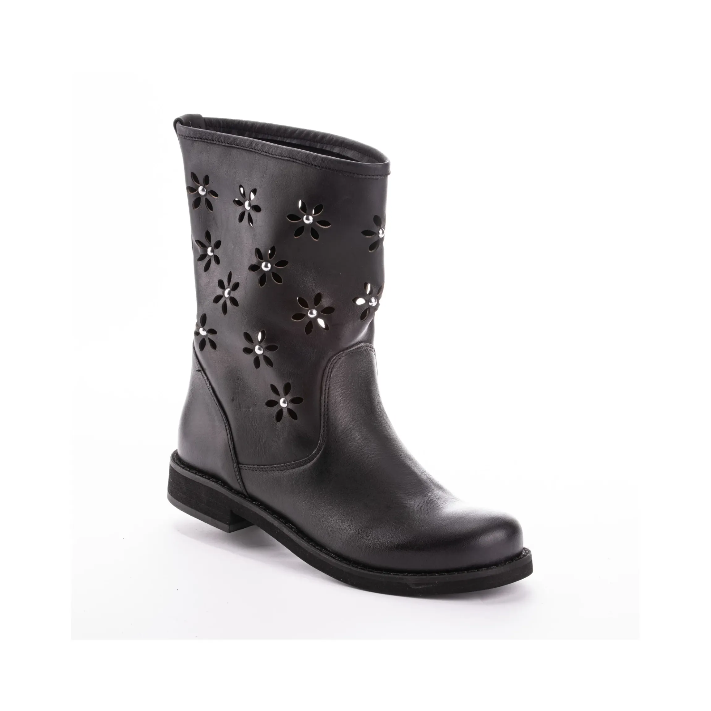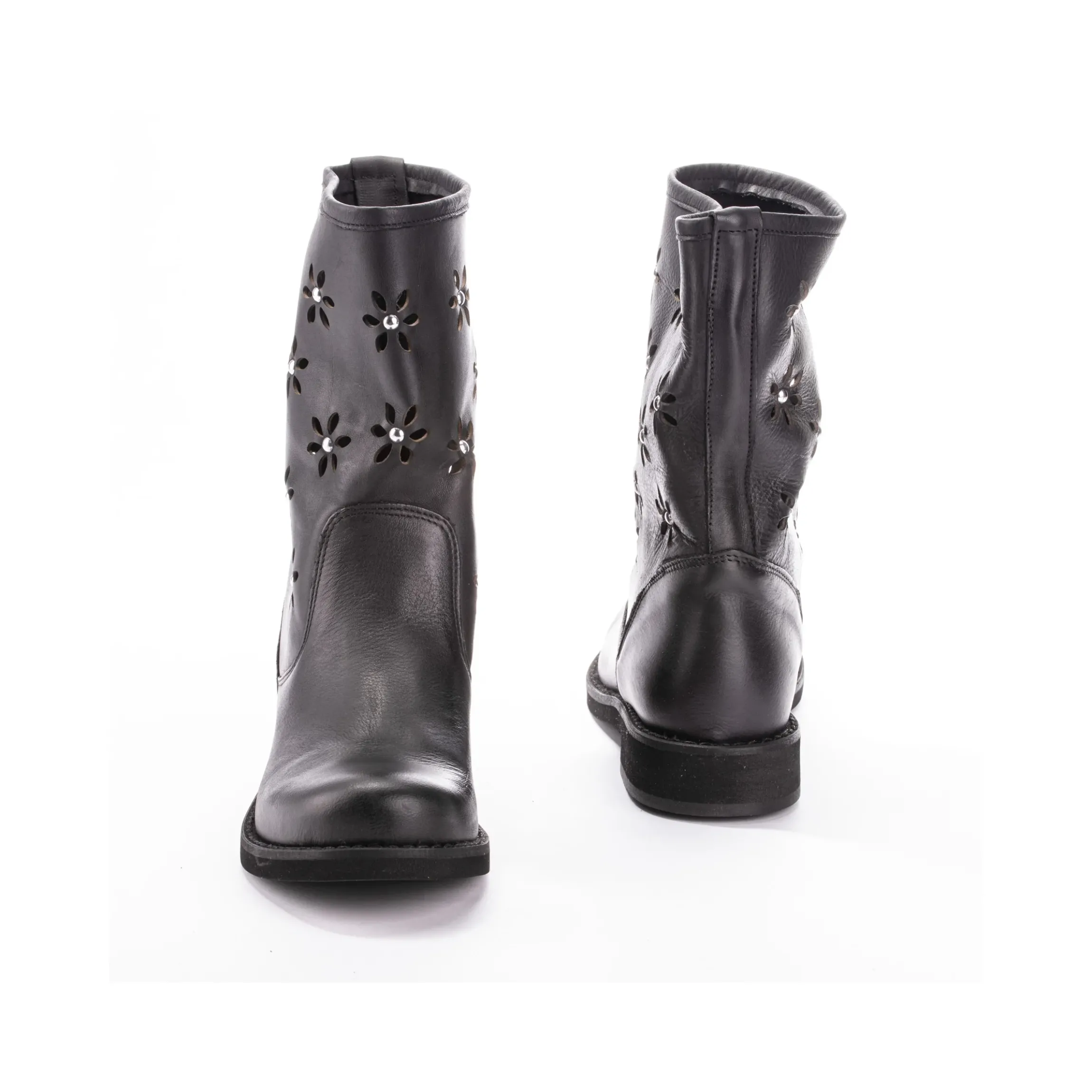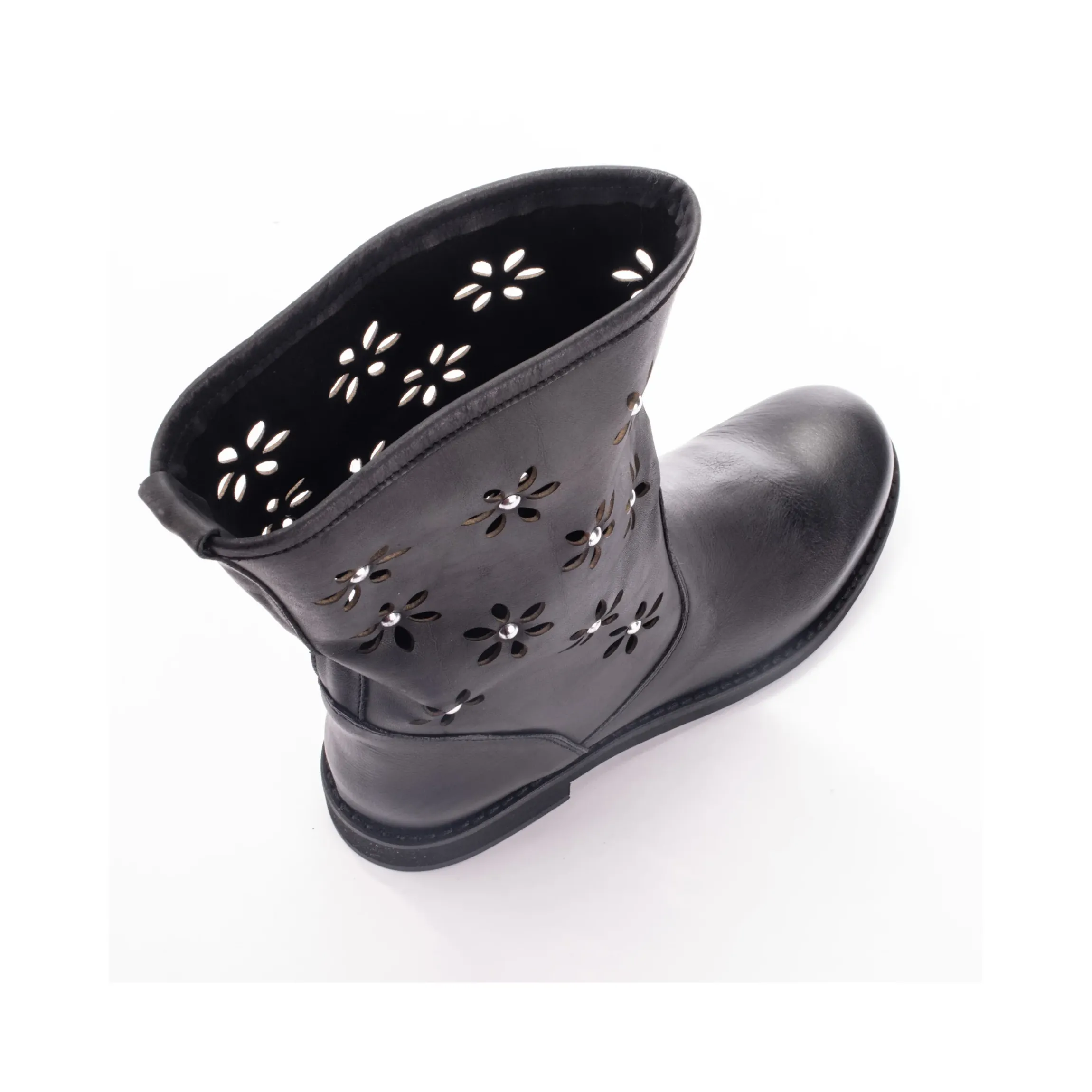 Stivaletto Boot Osvaldo Rossi Made in Italy in pelle nera con dettagli di fiori traforati e applicazione di perline.