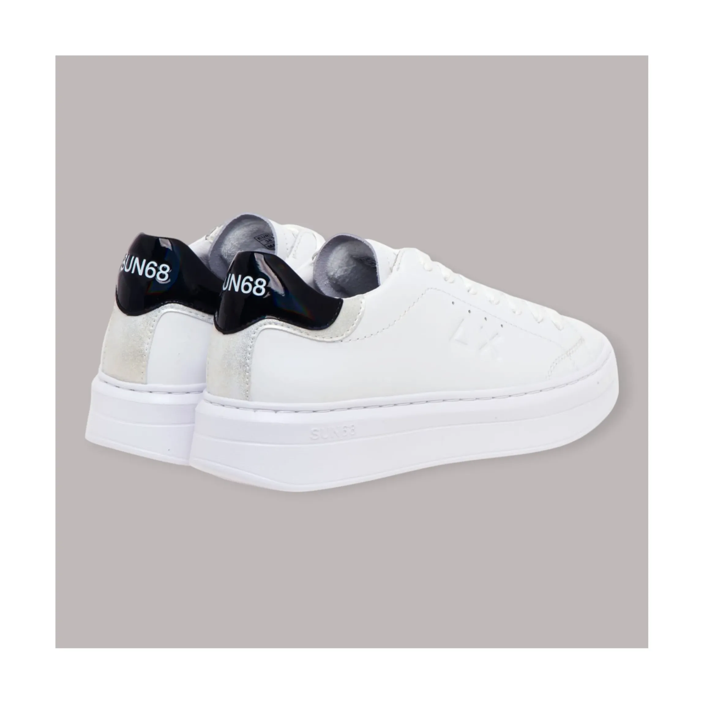 SUN 68 GRACE LEATHER SNEAKERS DONNA realizzata in pelle di colore bianco, con dettagli sul tallone in camoscio e vernice. Logo marchio stampato sulla linguetta e logo marchio inciso sul lato esterno. Tomaia completamente realizzata in pelle, plantare estraibile e fondo in gomma.