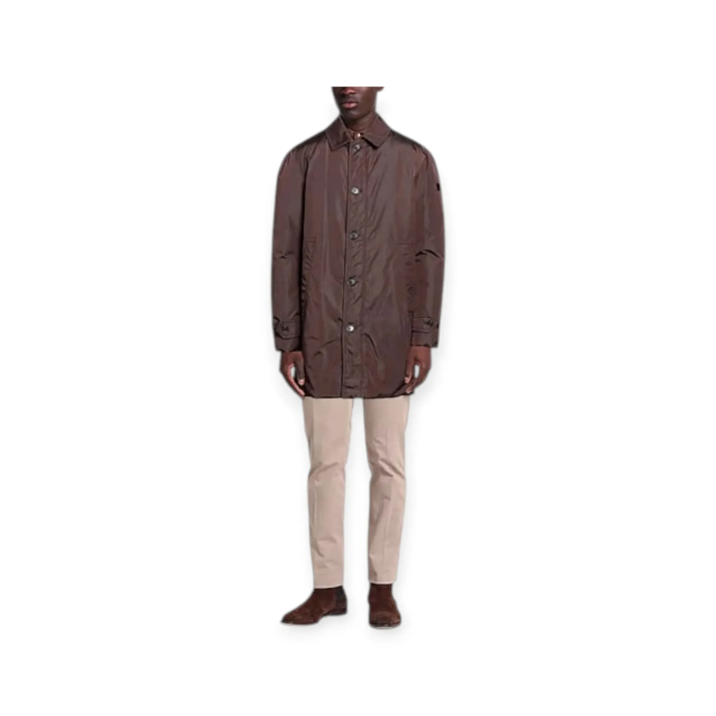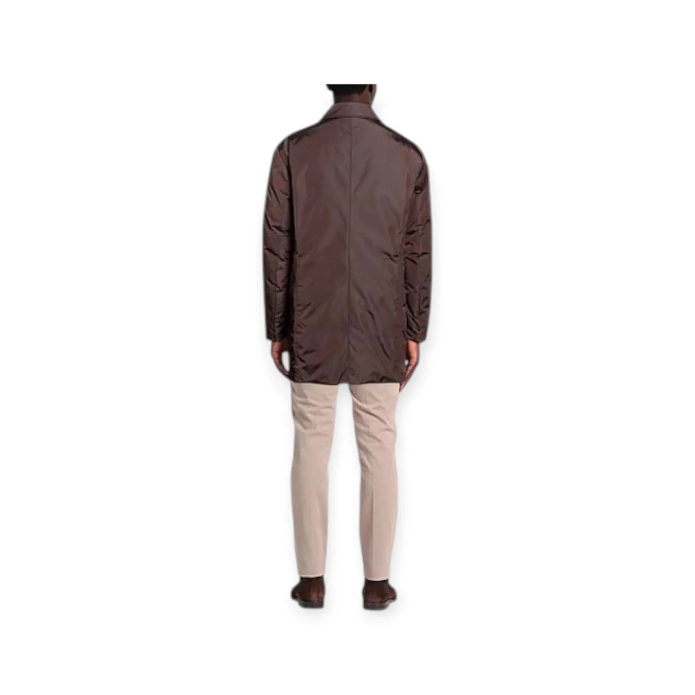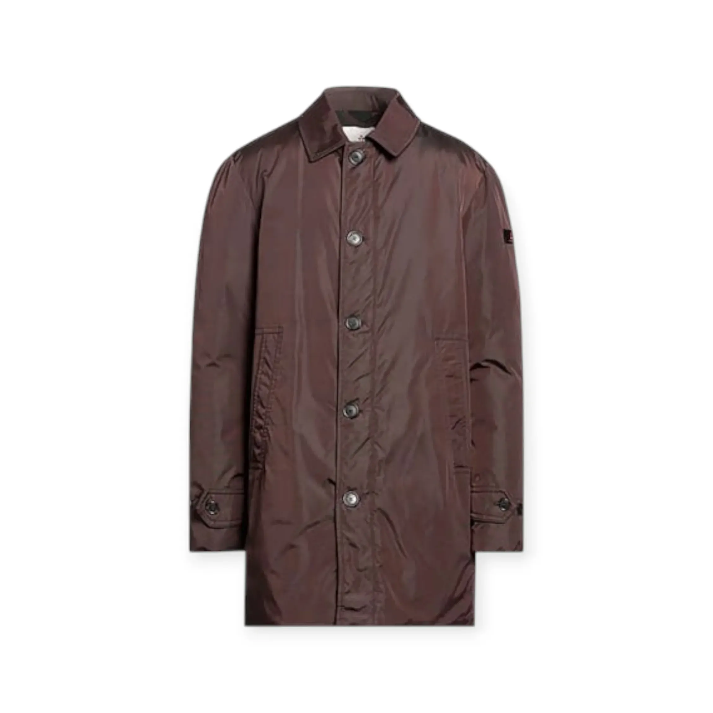 Giacca PEUTEREY da uomo in tessuto tecnico con imbottitura in piuma. Il modello si presenta con dettagli in panno, la parte inferiore del collo a camicia, la rifinitura interna della chiusura nascosta con zip a doppio cursore e bottoni, i profili delle tasche a filetto e i regolatori ai polsi. Disponibile nel colore marrone.