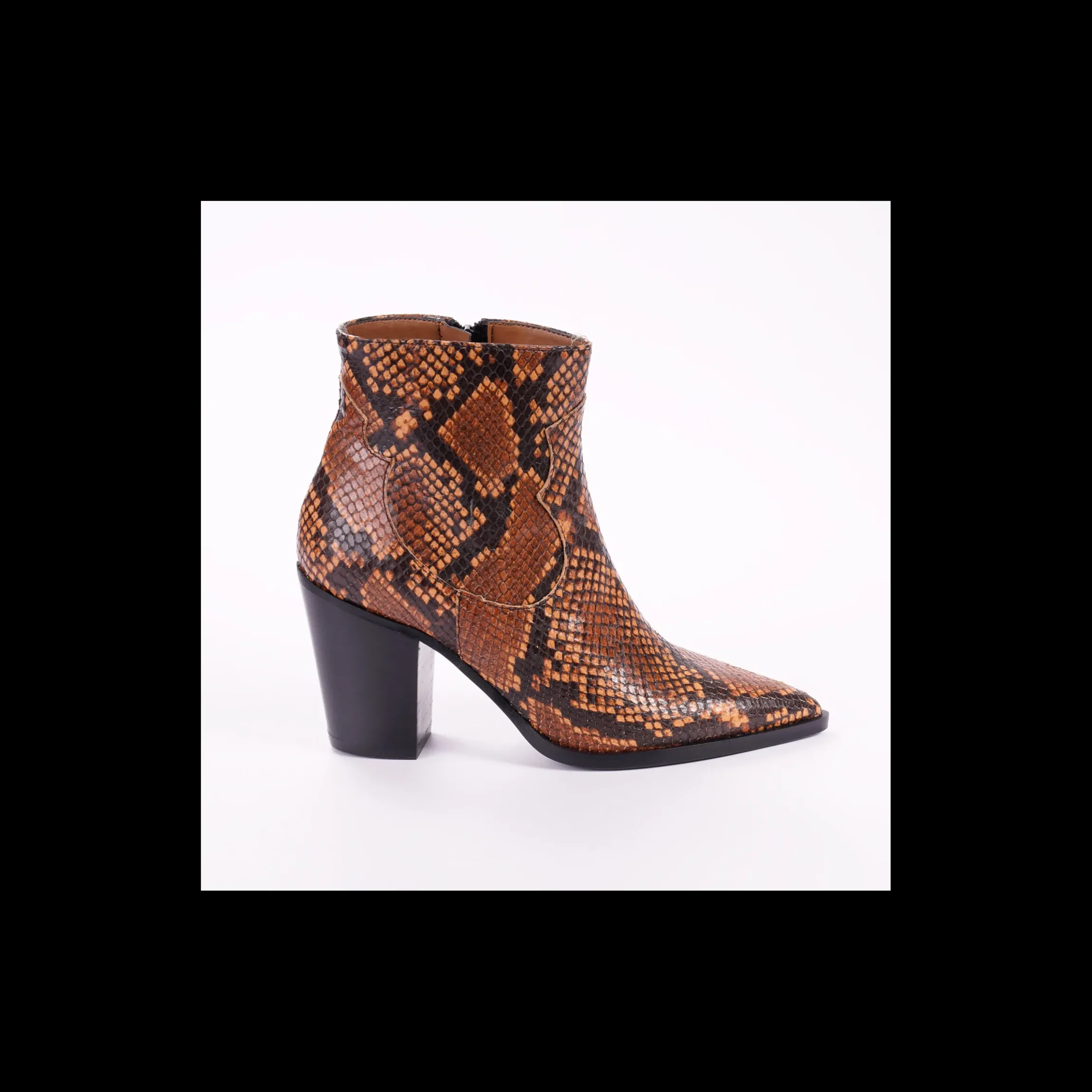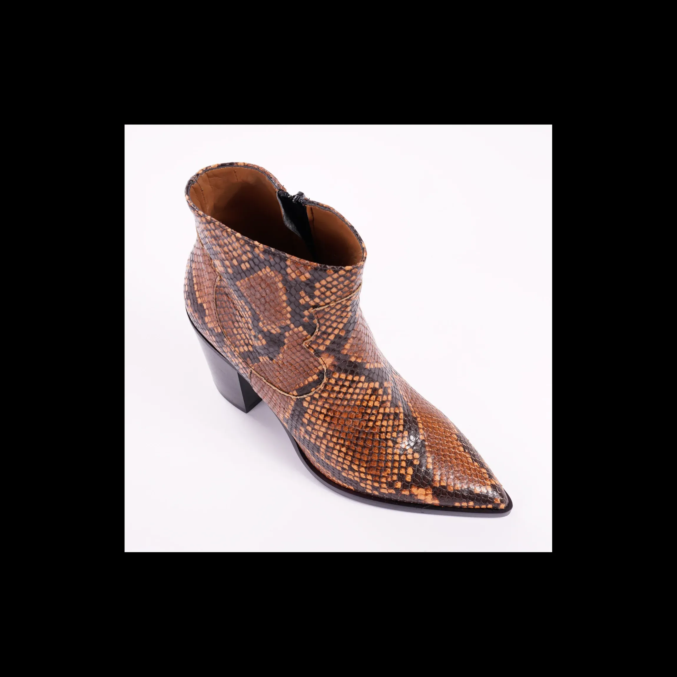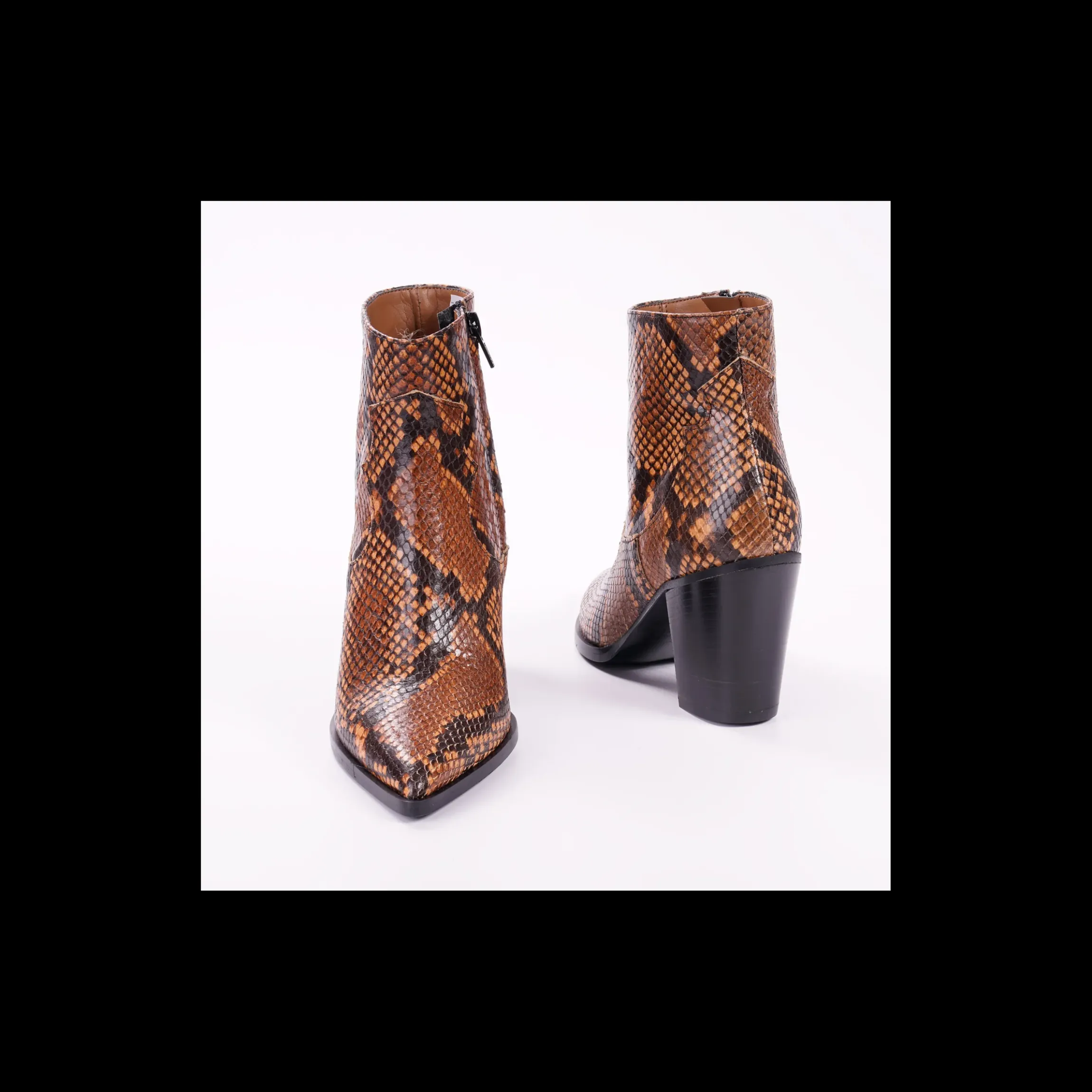 Tronchetto OSVALDO ROSSI in pitone colore cuoio , tacco a blocco, zip laterale interna, interno in pelle, fondo cuoio