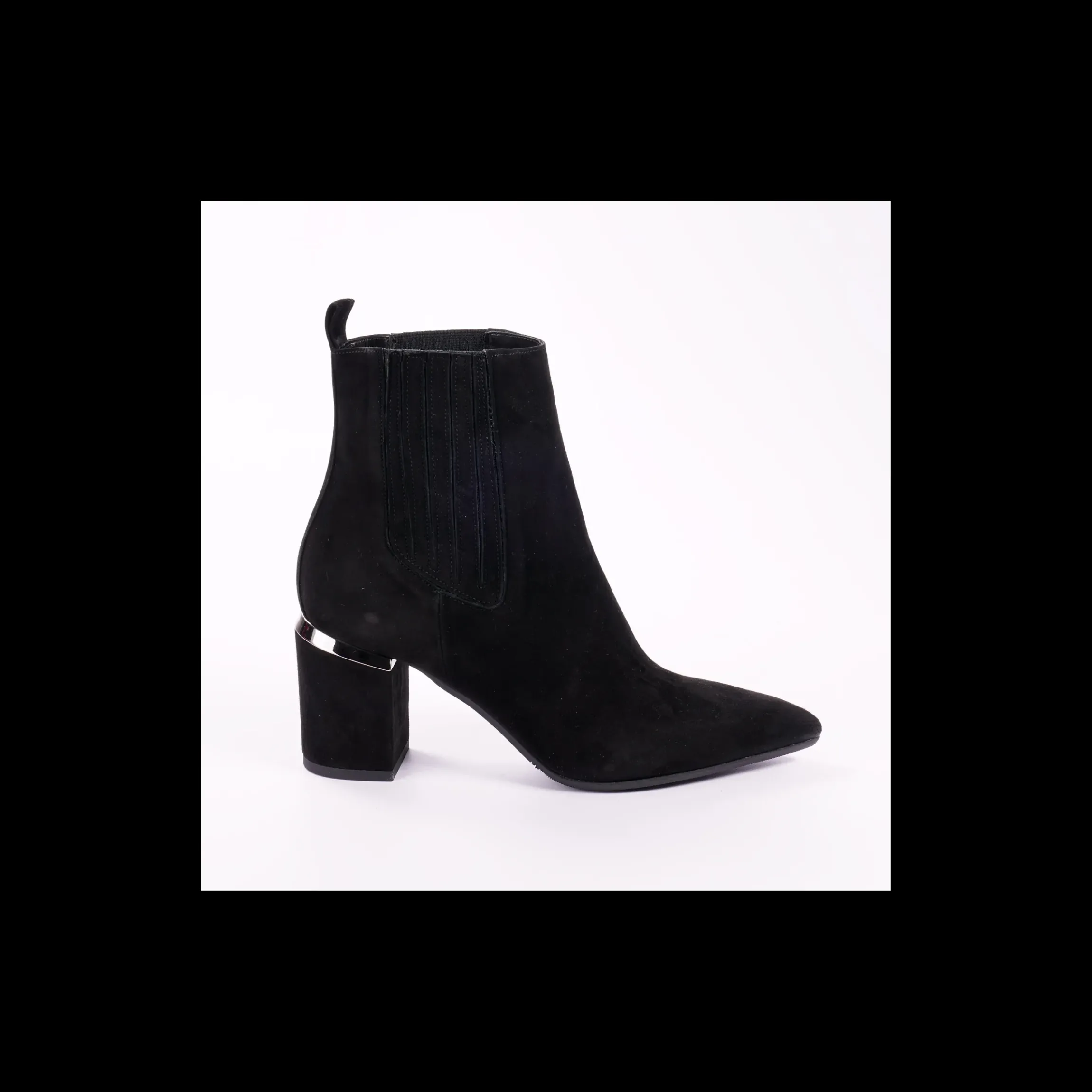 Tronchetto OSVALDO ROSSI in camoscio colore nero, a punta, zip laterale interno, elastico laterale rivestito in costine di camoscio, tacco a blocco con inserto metallico, interno in pelle, fondo gomma antiscivolo