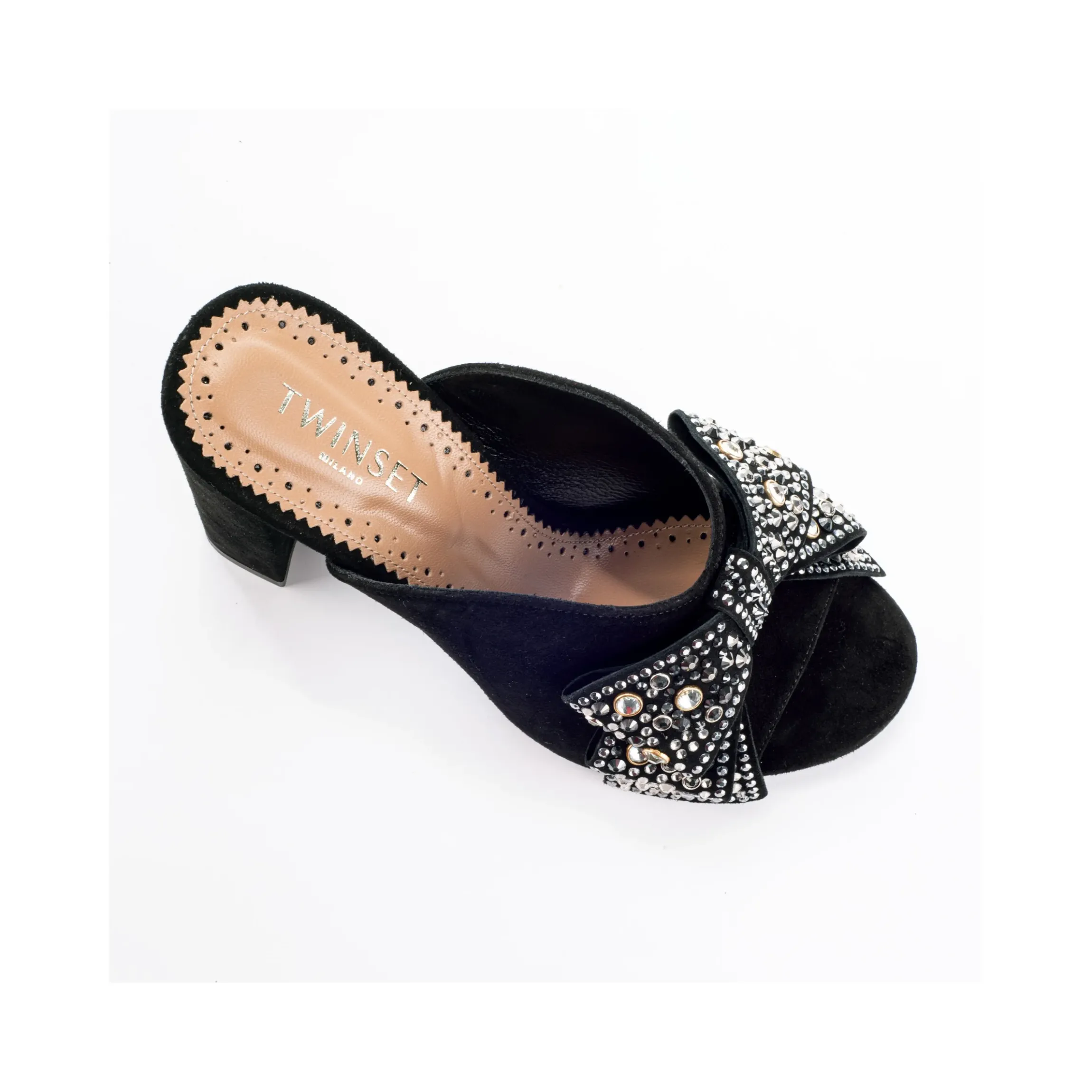 Sabot Twin Set in morbido camoscio nero con applicazione di fiocco fatto di borchie e Swarovski color argento.