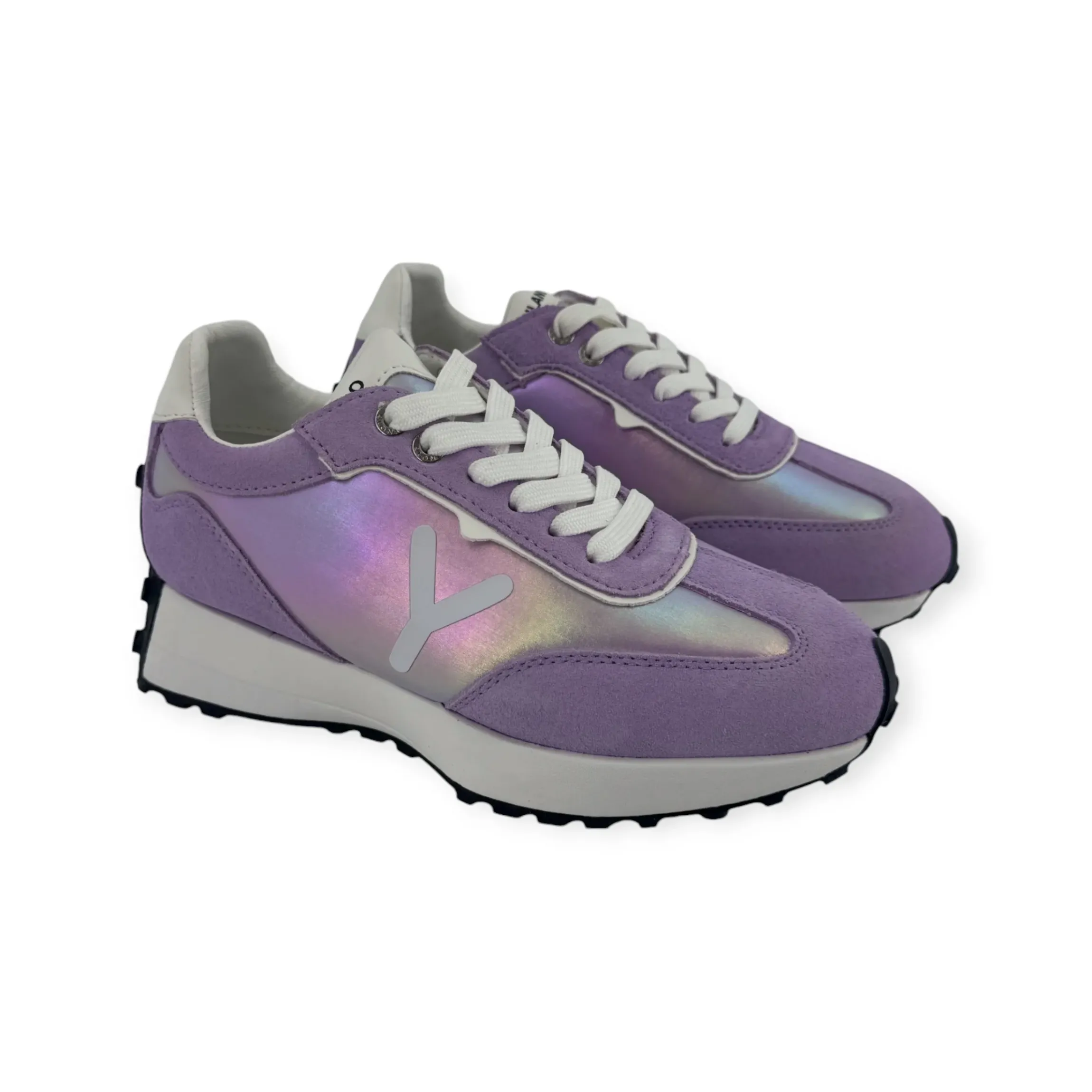 YNOT MILANO SNEAKERS DONNA EFFETTO CANGIANTE, realizzate in pelle e camoscio, con design minimal e impreziosito dal logo sul lato con pelle effetto colore cangiante. Si presentano con punta tonda, chiusura con lacci, plantare estraibile rivestito in tessuto, suola in gomma e battistrada antiscivolo a contrasto colore.. Disponibile nei colori lavanda e bianco con fucsia