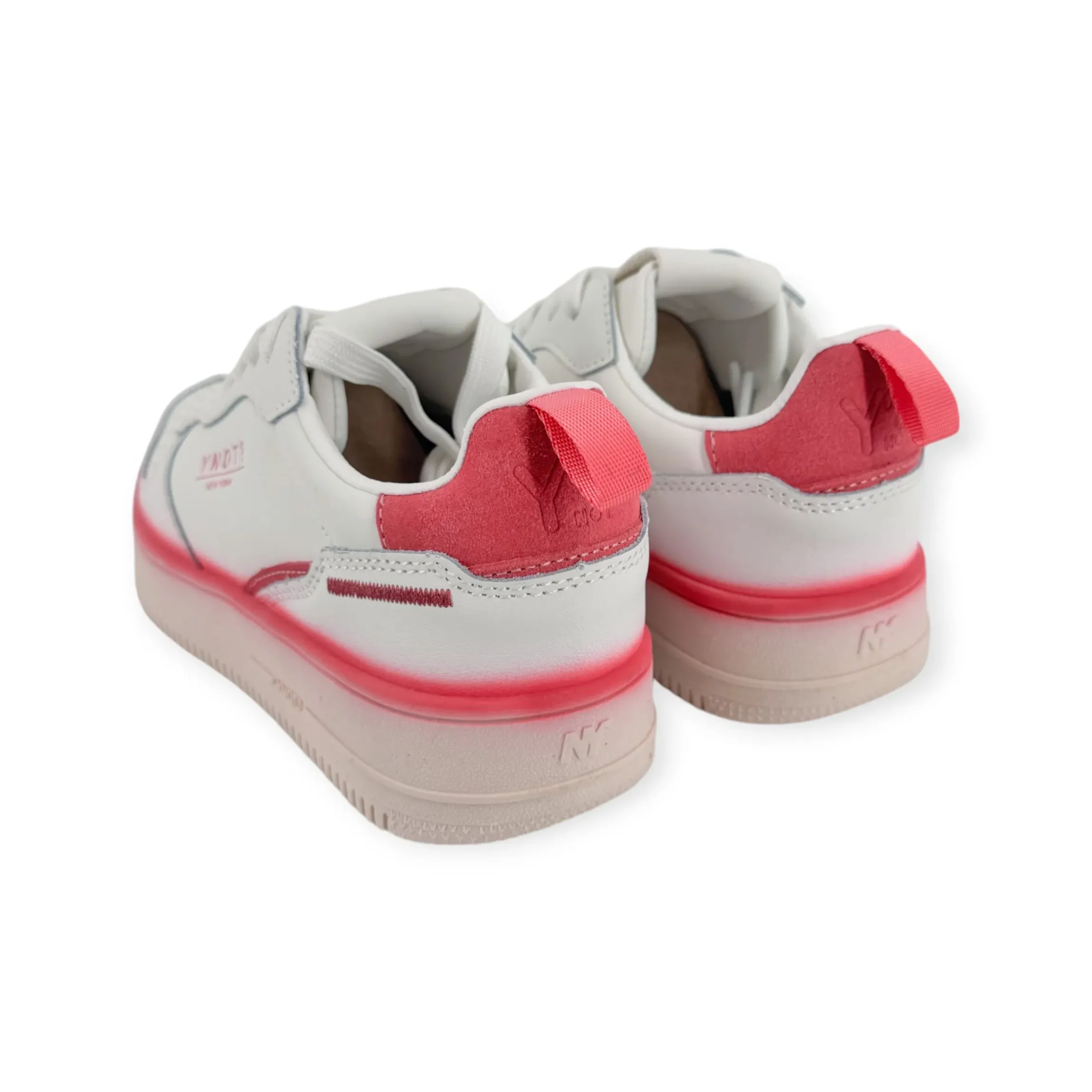 YNOT NEW YORK SNEAKERS DONNA INSERTI IN CAMOSCIO di colore bianco e dettagli a contrasto color albicocca. Si presenta con punta traforata, dettagli logo sulla linguetta, sul lato e sul tallone con plantare estraibile in tessuto