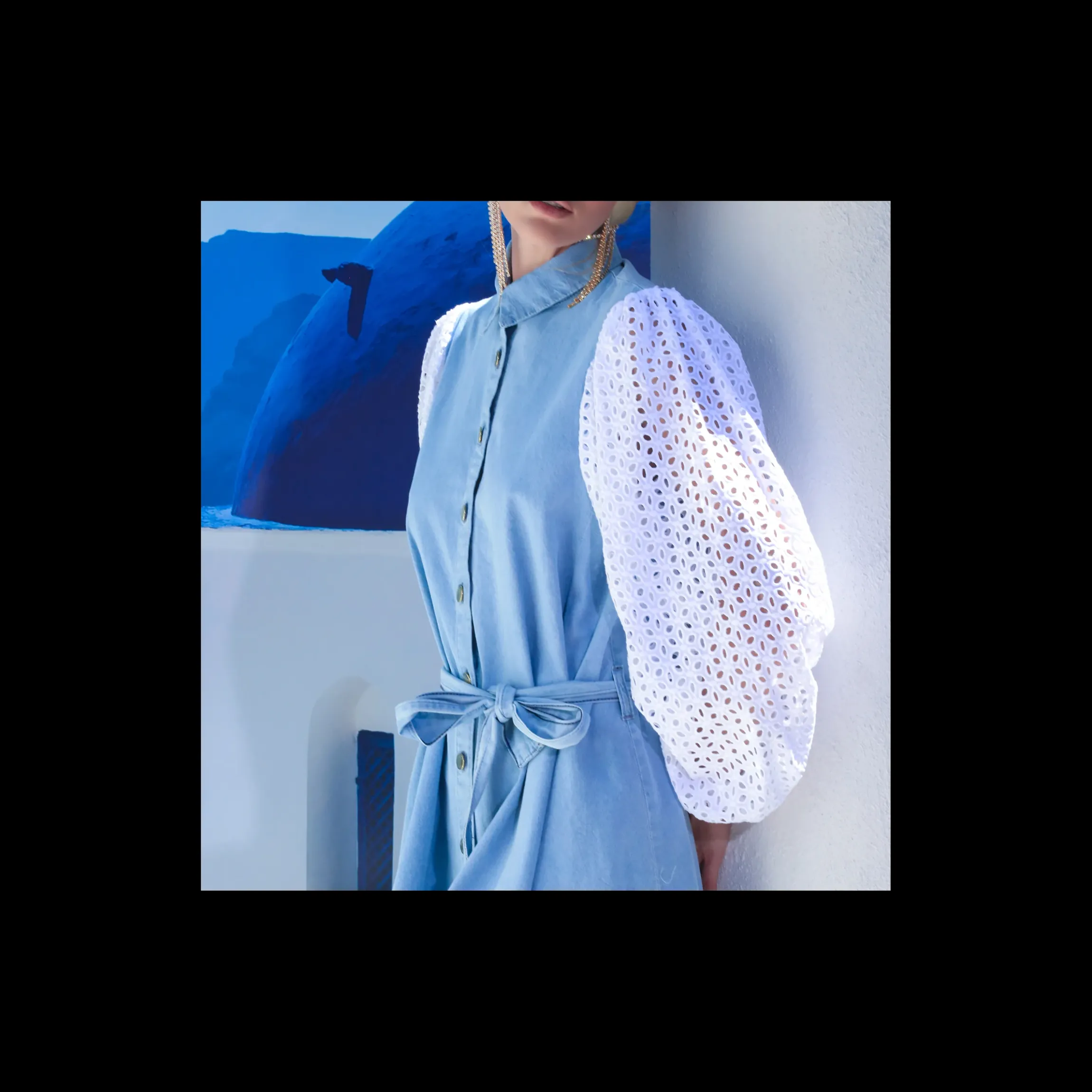 Abito Giulia N in jeans di cotone, con maxy manica in pizzo san gallo. Maxy logo cucito sulla schiena.