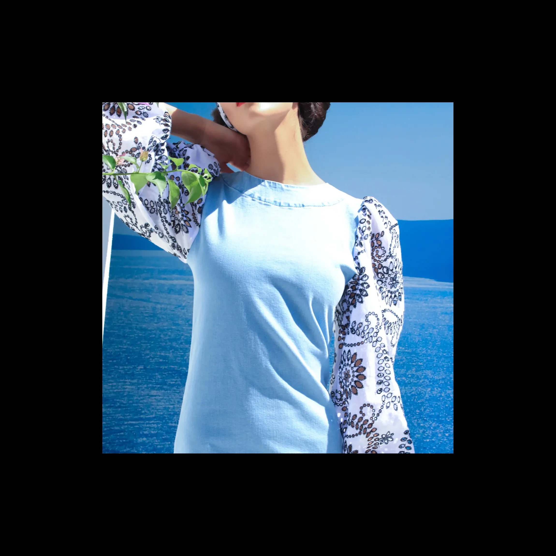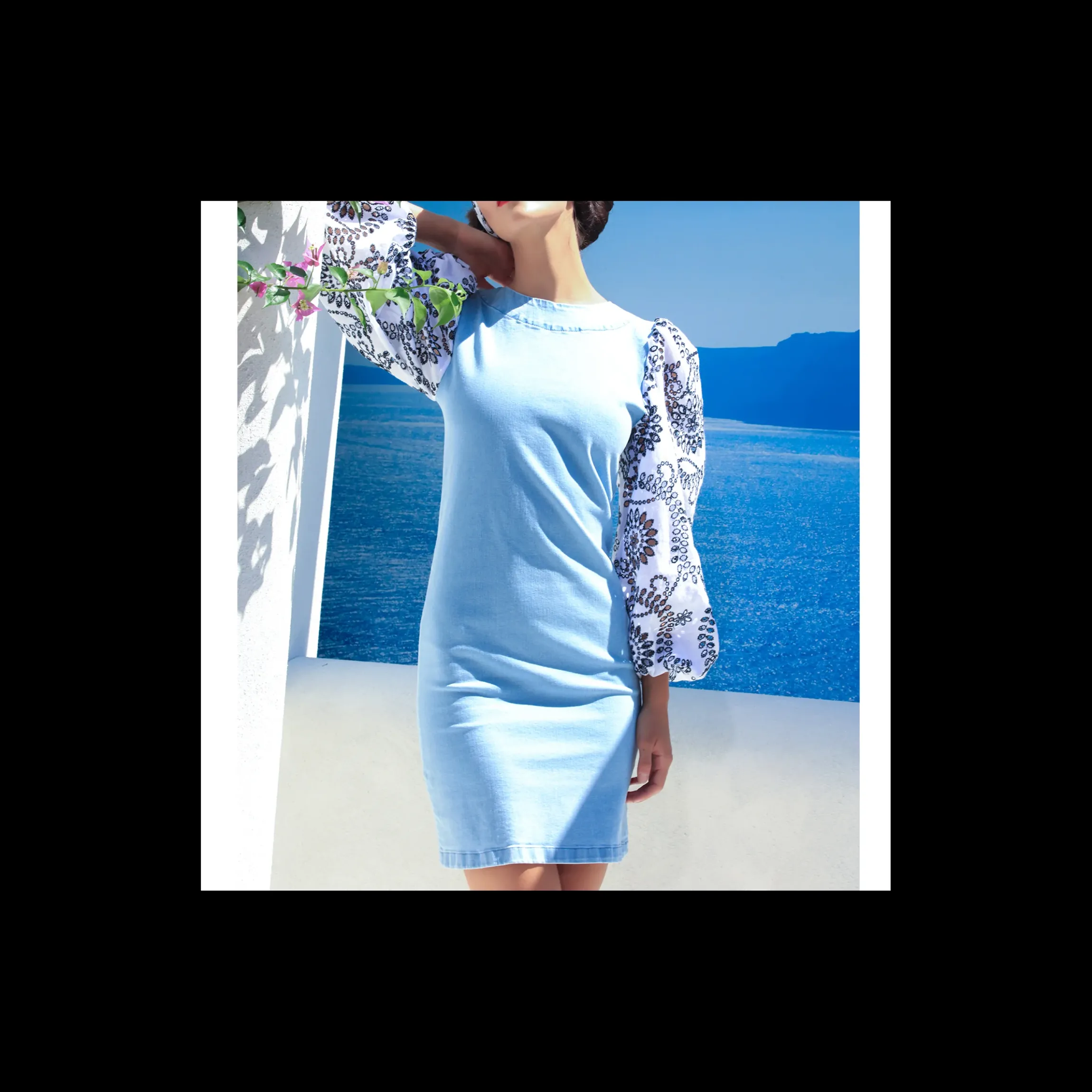 Abito Giulia N in cotone Jeans elasticizzato , con allpicazione di maxy maniche a forma di palloncino in cotone bianco con fantasia mediterranea ricamata e traforata di colore nero.