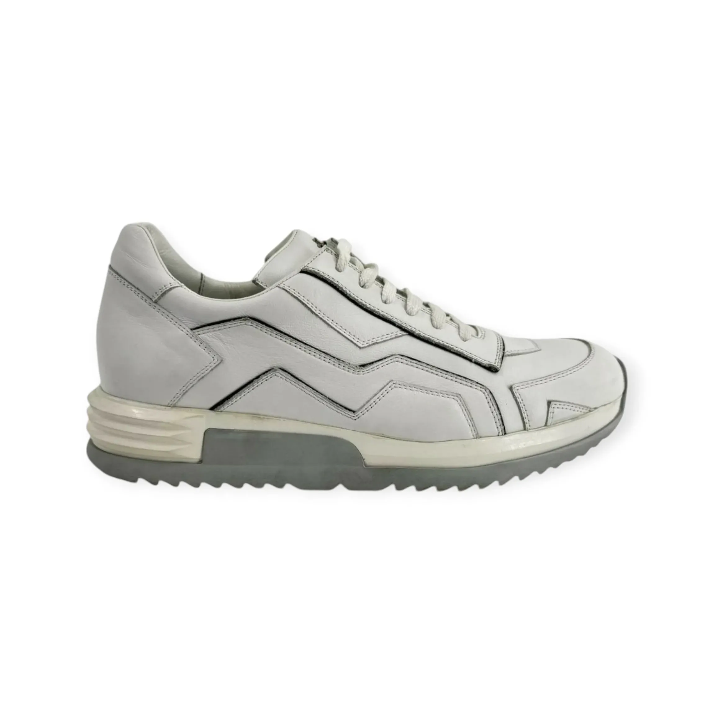 CESARE PACIOTTI 53851 SNEAKERS UOMO con tomaia in pelle di vitello, anche internamente, di colore bianco, come anche il plantare estraibile rivestito in pelle. Chiusura con lacci, suola in gomma doppio colore e dettaglio logo in acciaio sulla linguetta