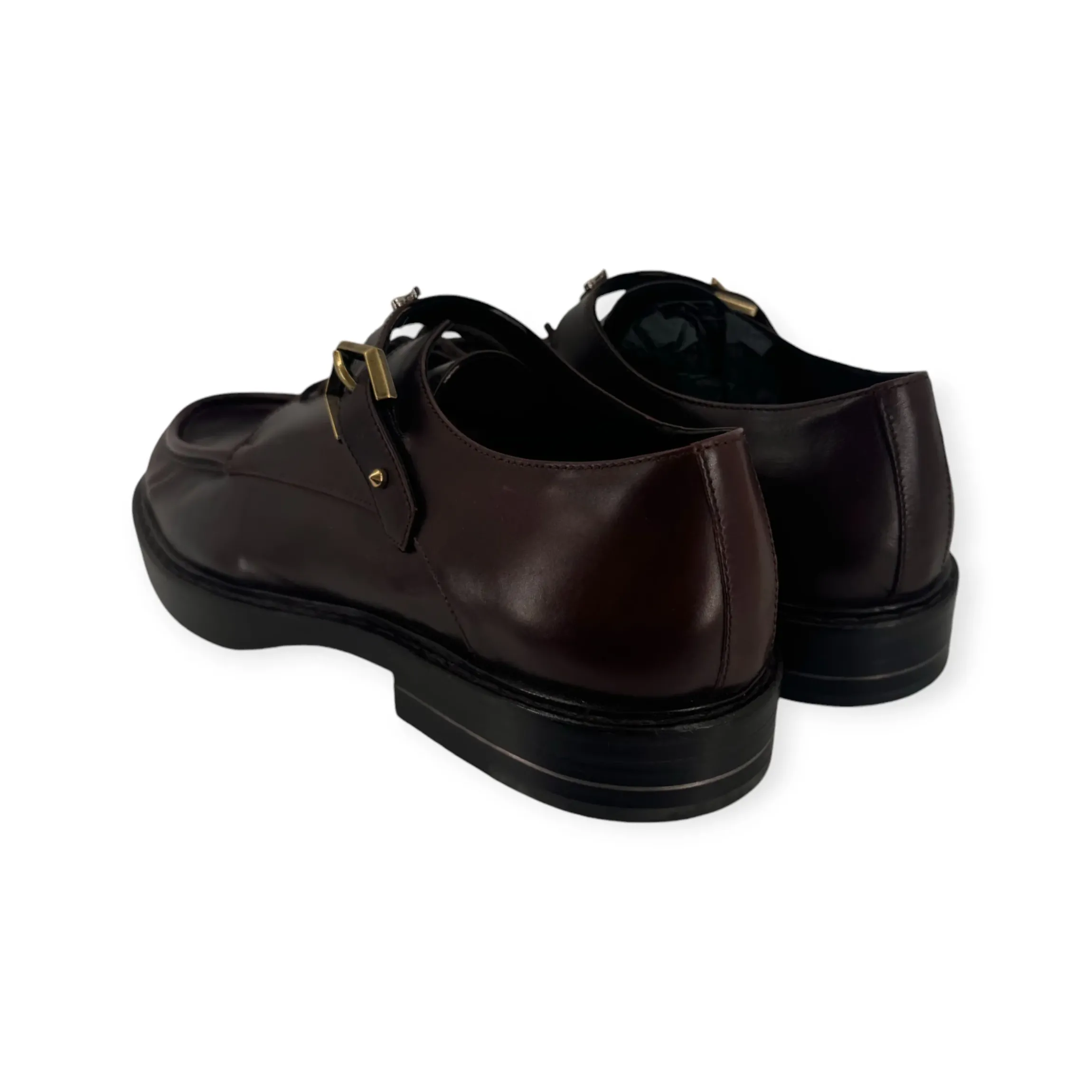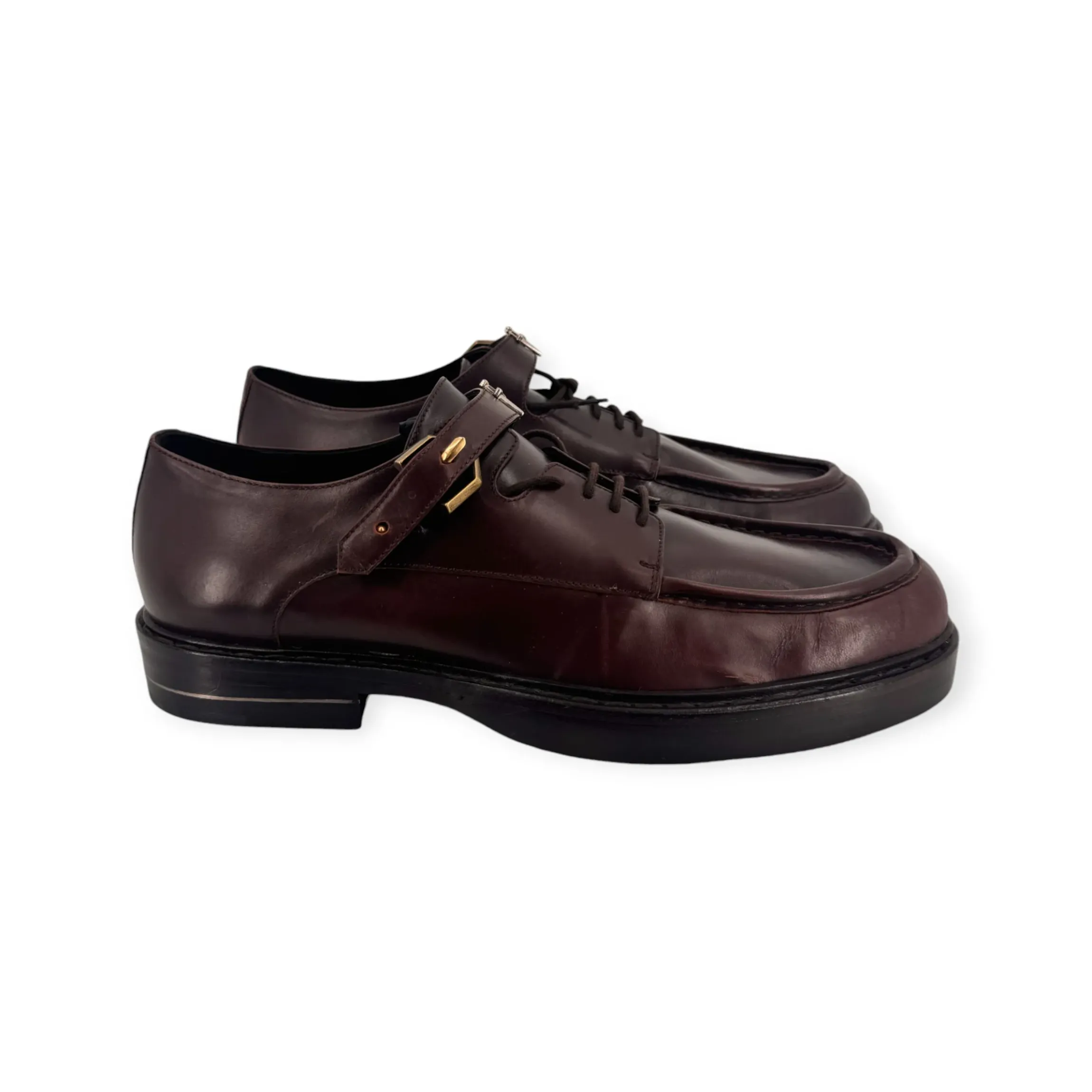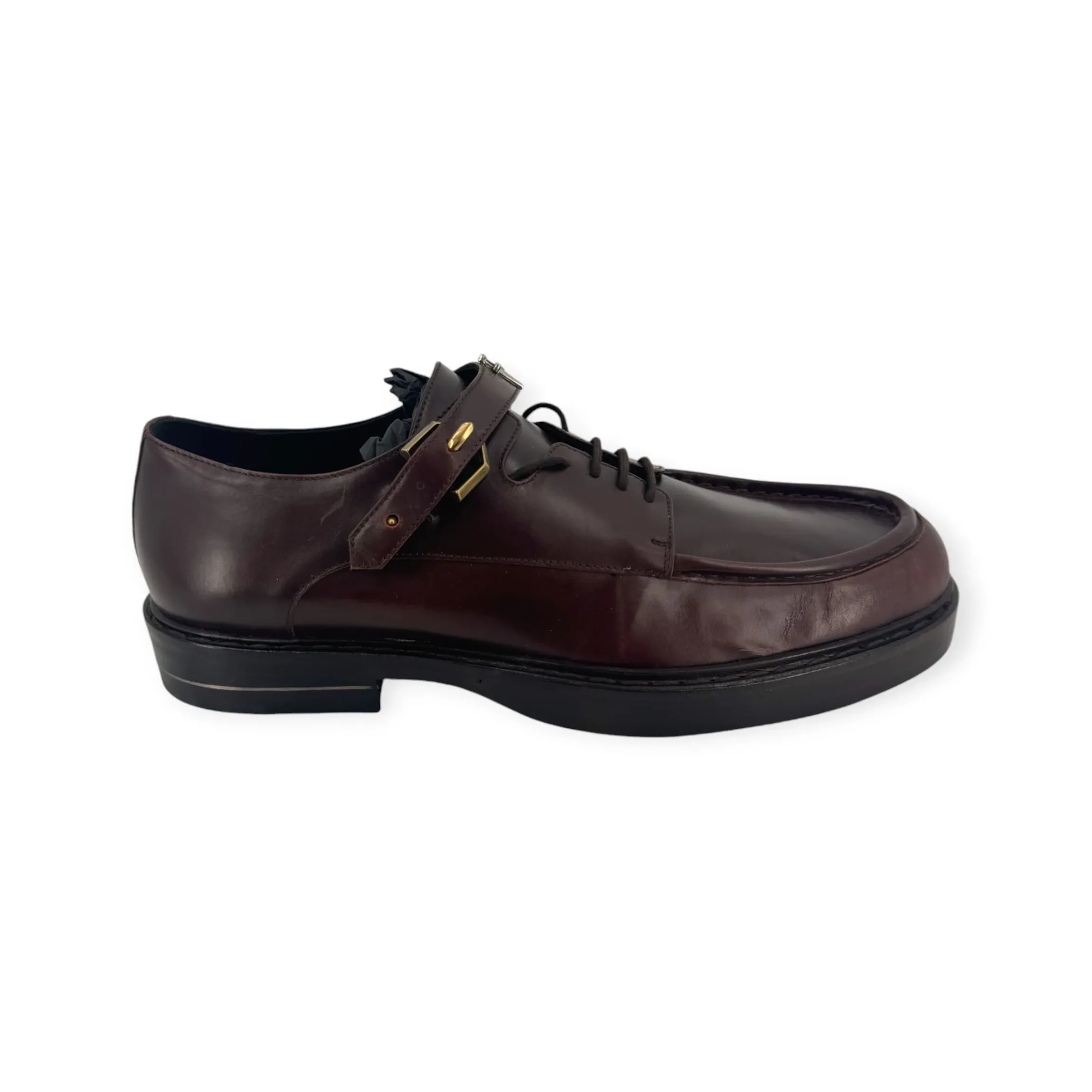 CESARE PACIOTTI MOCASSINO ALLACCIATO IN PELLE COLORE MARRONE con fondo cuoio, e particolare cinturino in sovrapposizione alla linguetta con fibbia colore oro e tomaia interna completamente rivestita in pelle. Dettaglio logo spada PACIOTTI sul cinturino