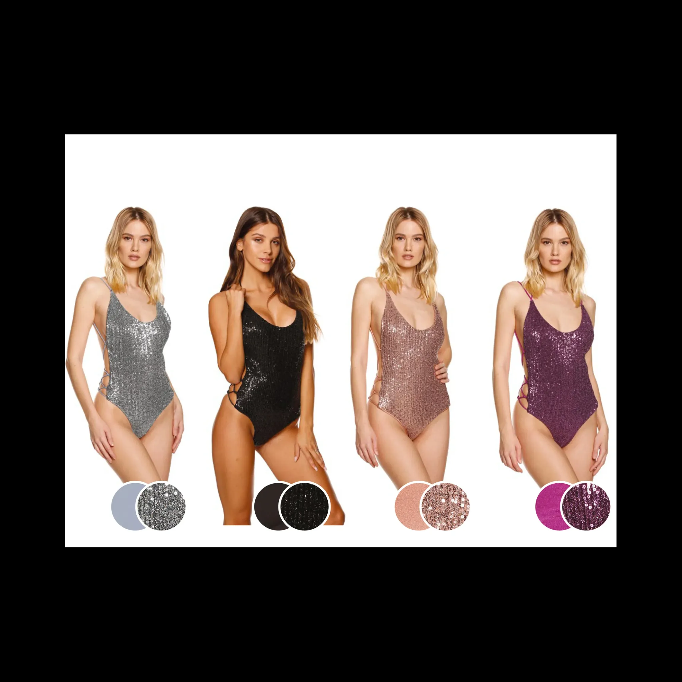 Costume da bagno intero con Paillettes e string laterali, annodatura al collo e scollatura a taglio posteriore.