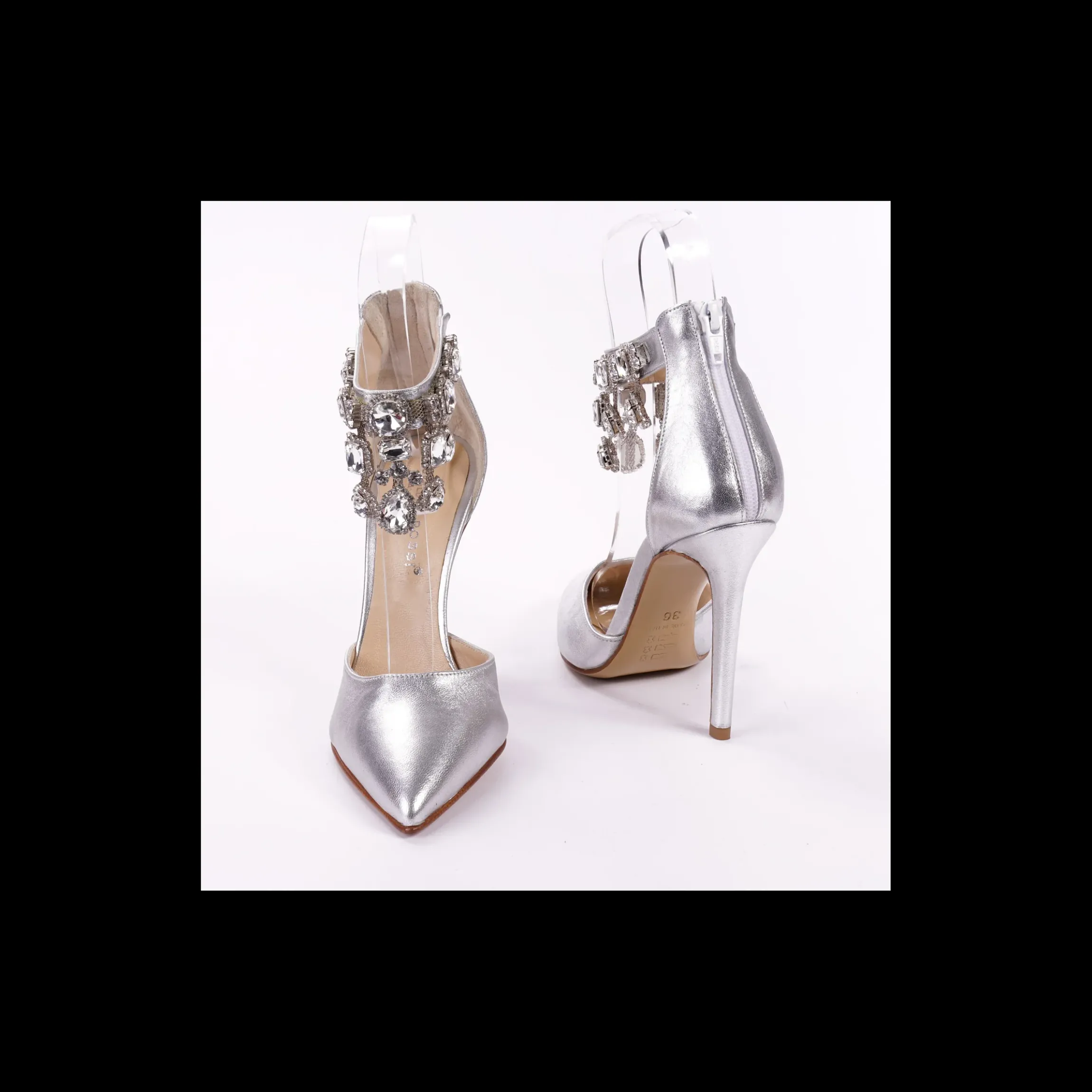 Dècolettè gioiello OSVALDO ROSSI in pelle colore argento, cinturino alla caviglia con applicazione gioiello con pietre e strass, interno in pelle, fondo cuoio